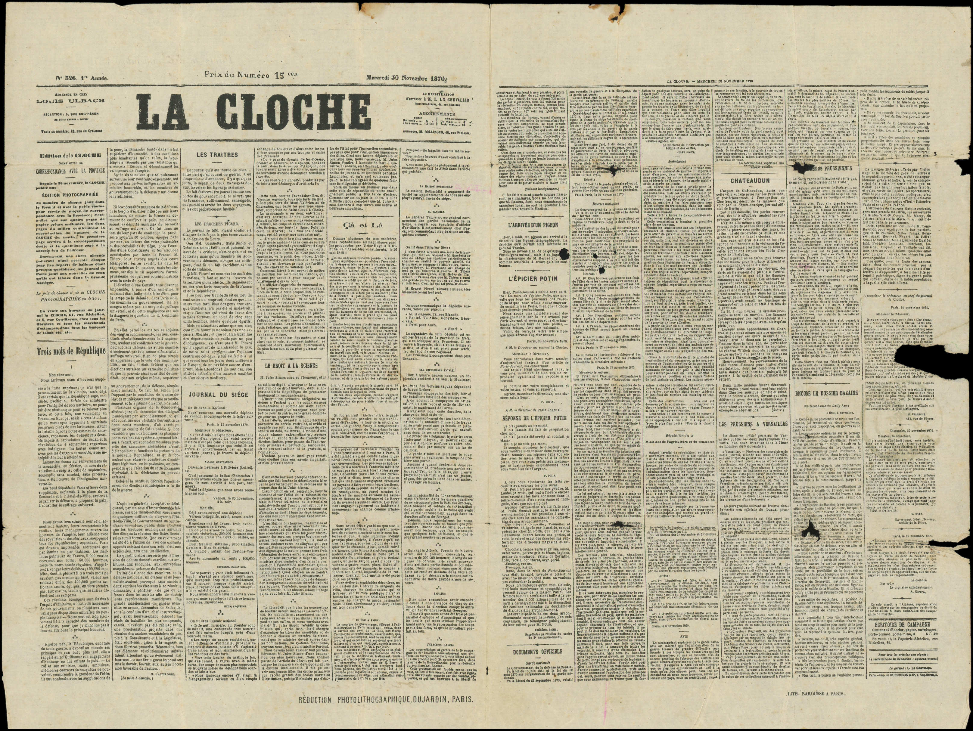 15 s. Journal LA CLOCHE du 29/11 non répertorié, càd R. Bonaparte 1/12/70, arr. MARSEILLE 8/12, Superbe. LE FRANKLIN. C (Image) (Image2)