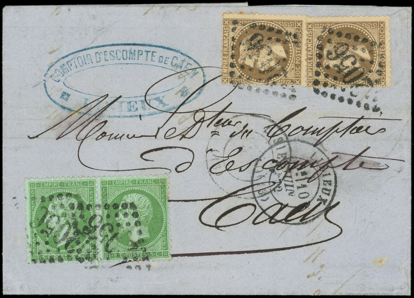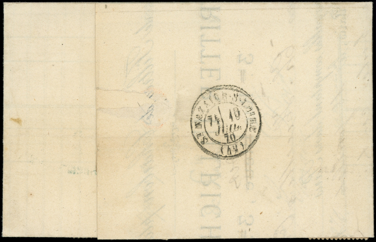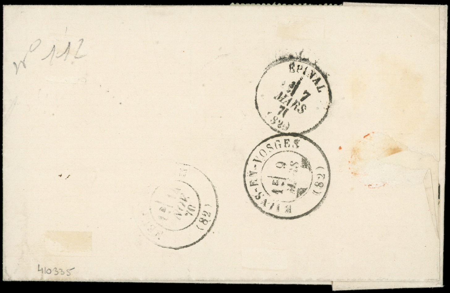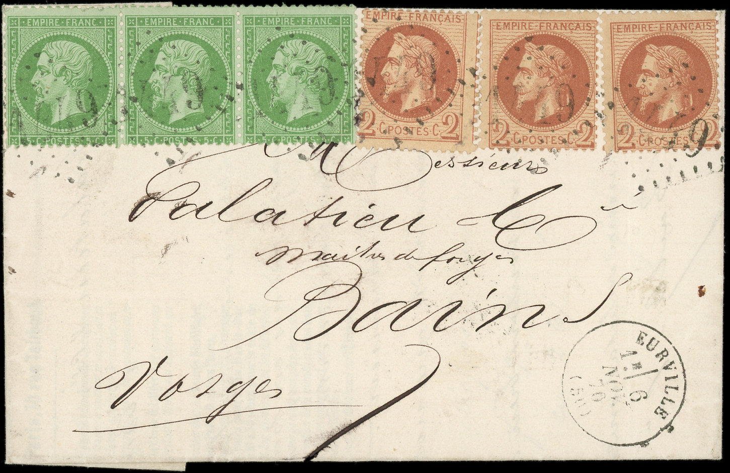 vert BANDE de 3 et 2c. brun rouge (3), obl. GC 1449 s. LAC, càd T16 EURVILLE 6/11/70, arr. NEUFCHATEAU 14/11, n'arrivera à sa destination BAINS en VOSGES que le 9/3/71, après la fin des hostilités, très intéressant et TTB (Image) (Image2)