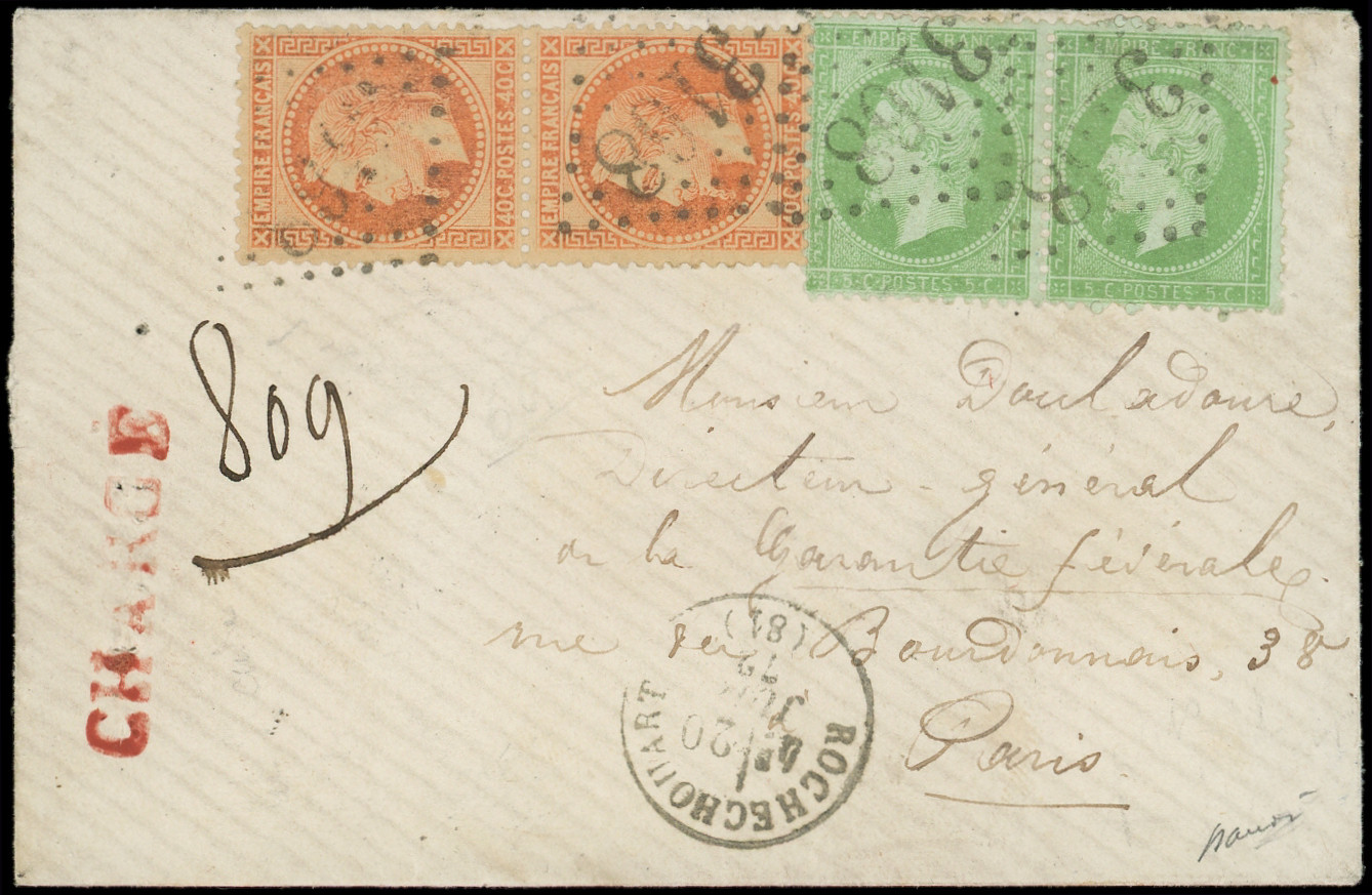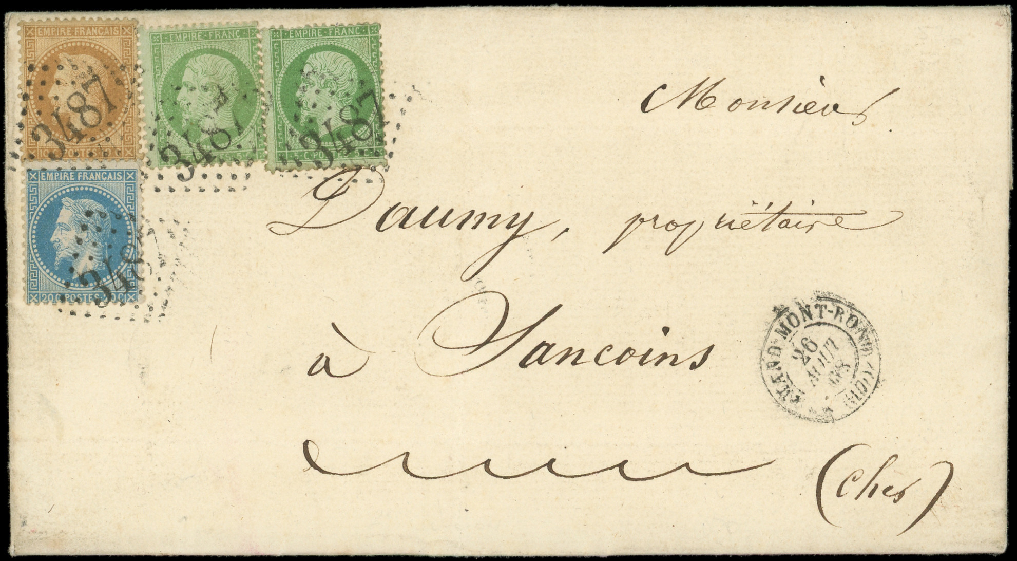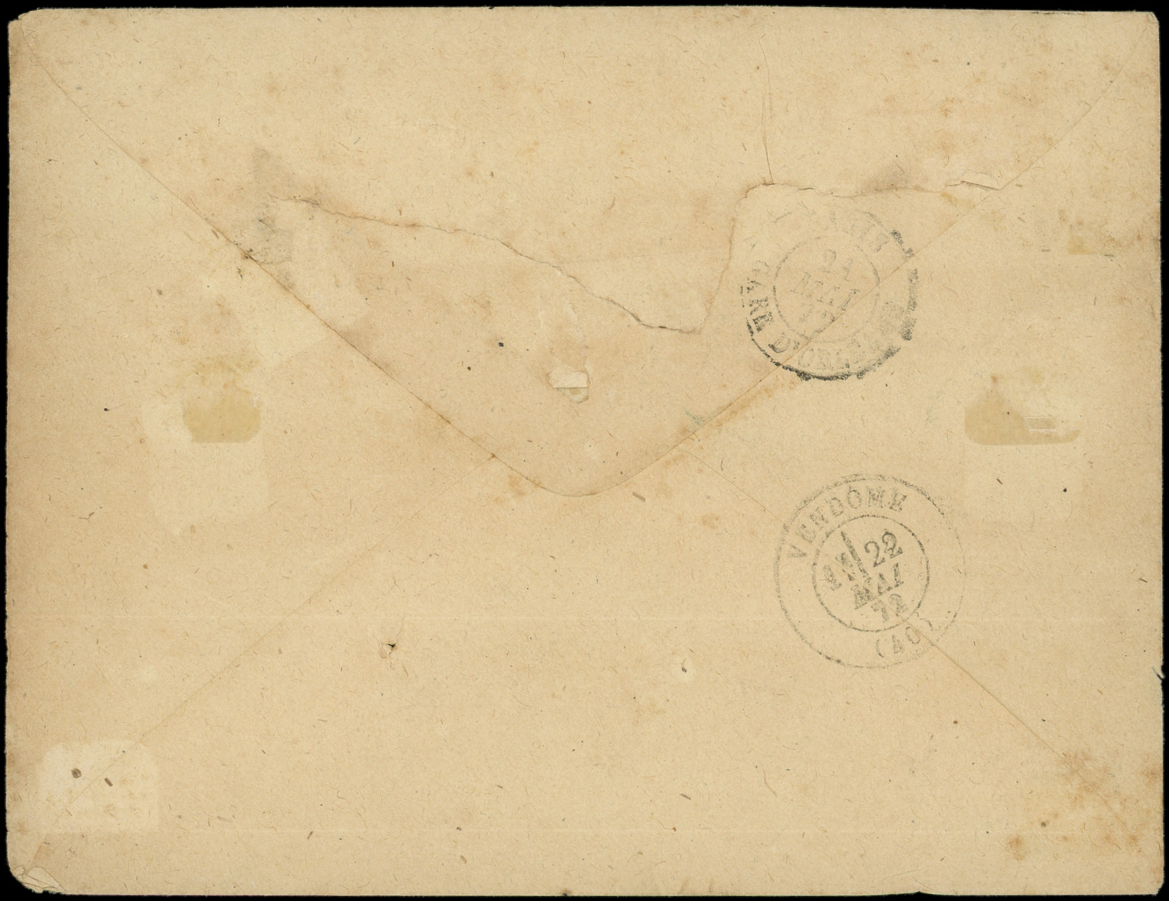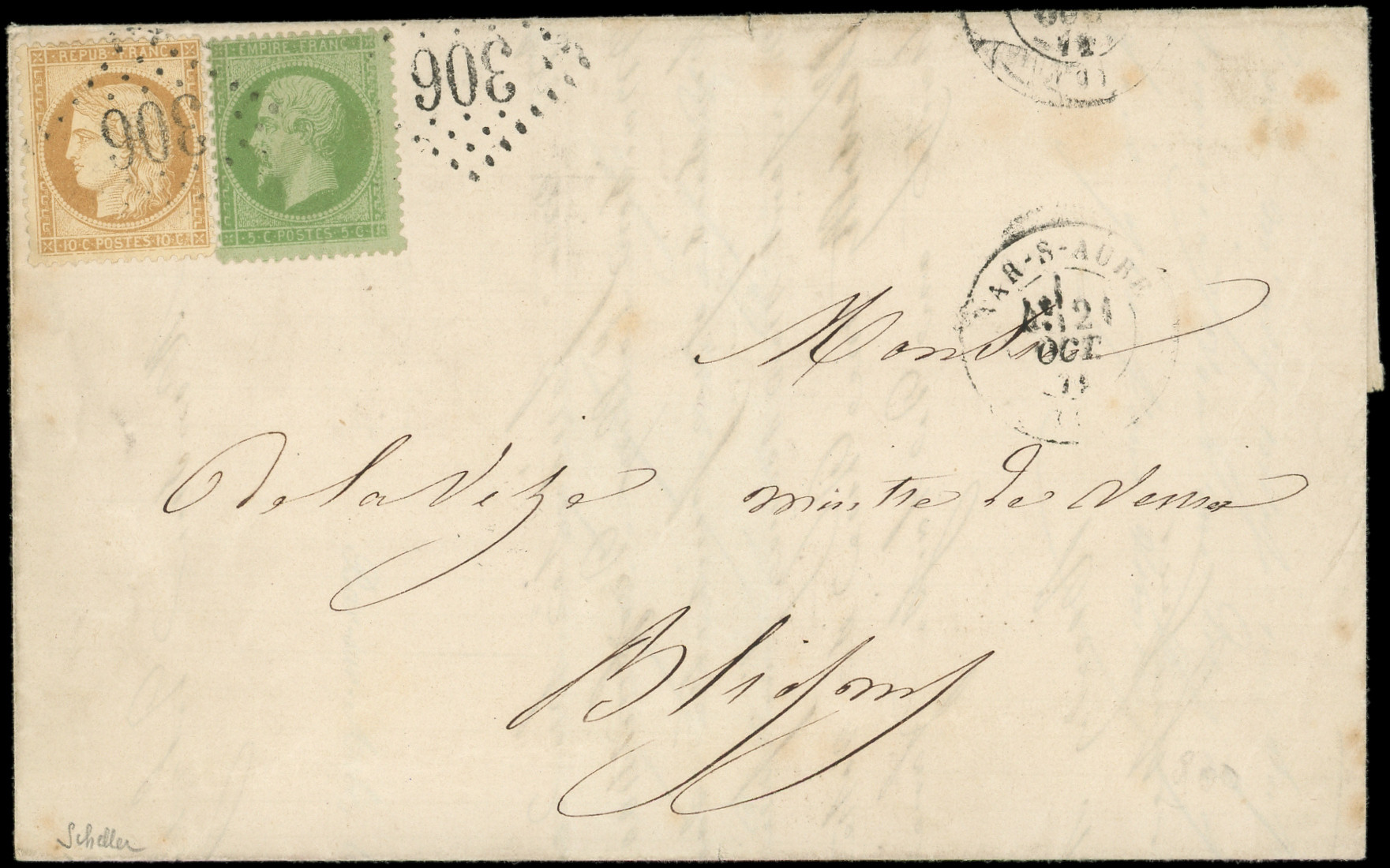 vert BANDE de 3 et 2c. brun rouge (3), obl. GC 1449 s. LAC, càd T16 EURVILLE 6/11/70, arr. NEUFCHATEAU 14/11, n'arrivera à sa destination BAINS en VOSGES que le 9/3/71, après la fin des hostilités, très intéressant et TTB (Image) (Image2)