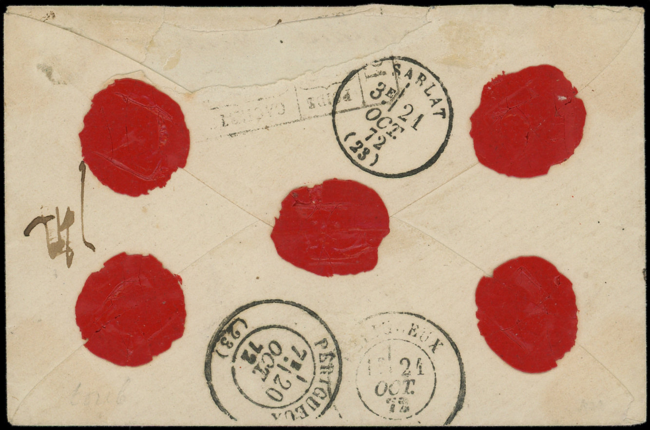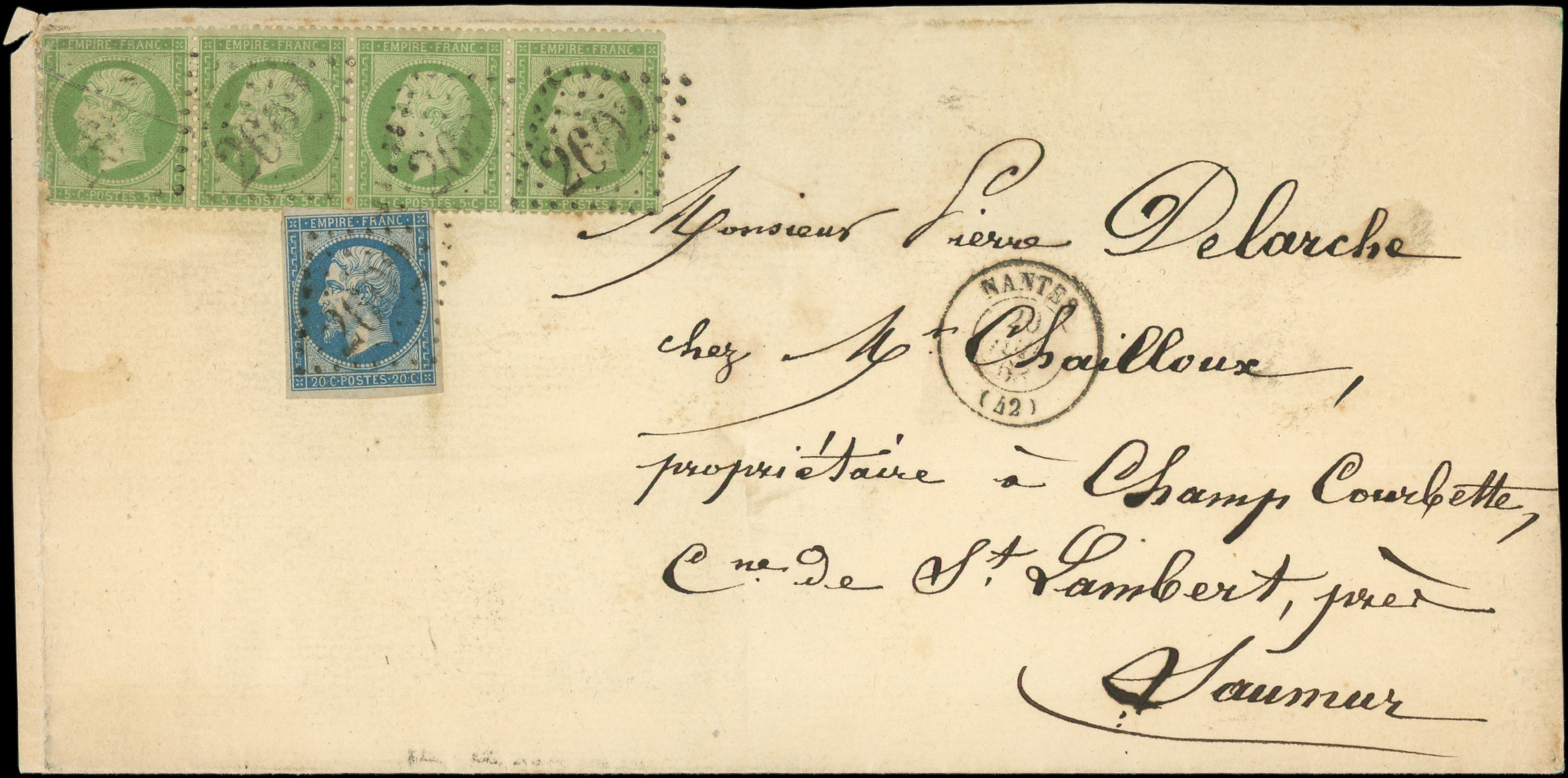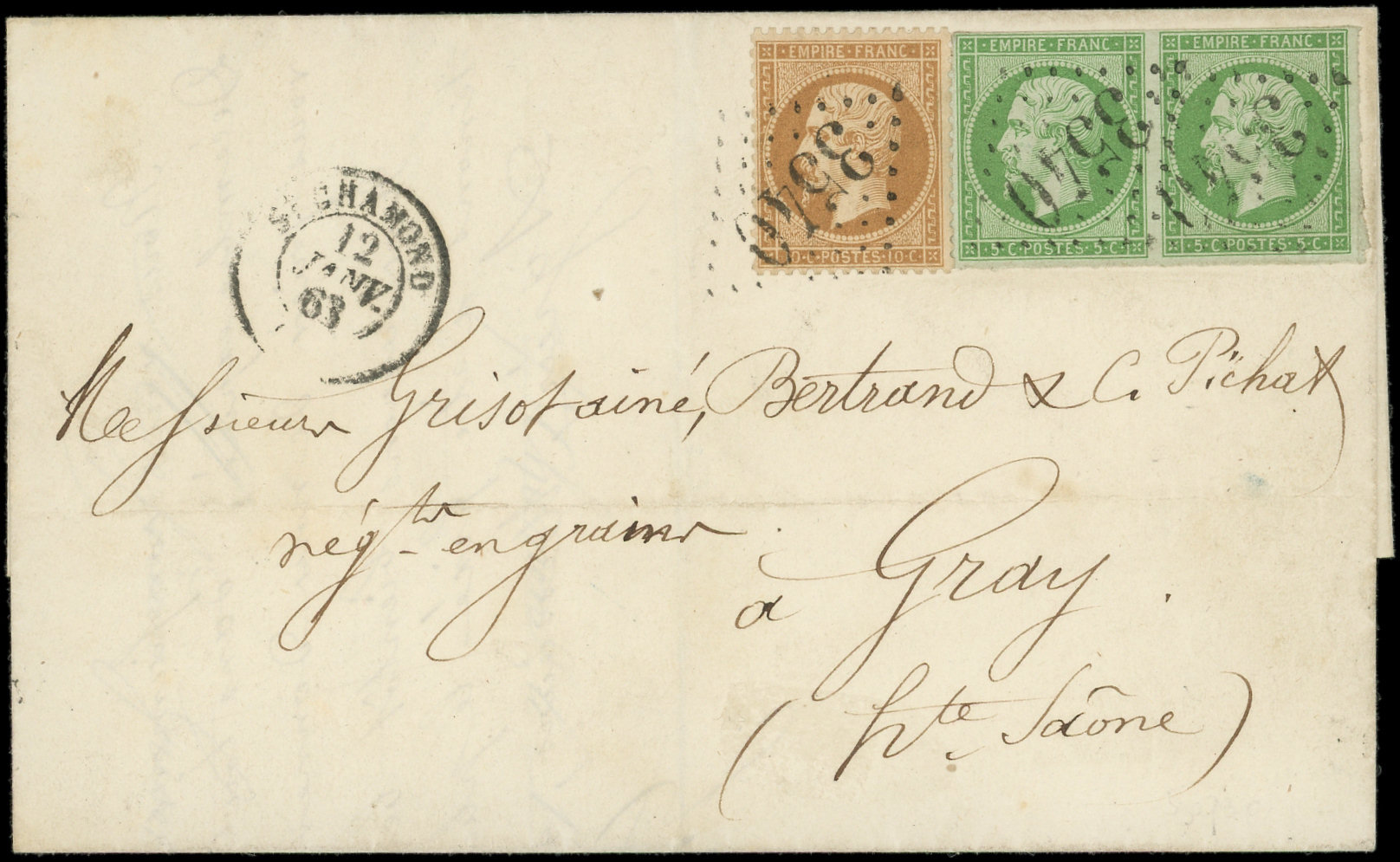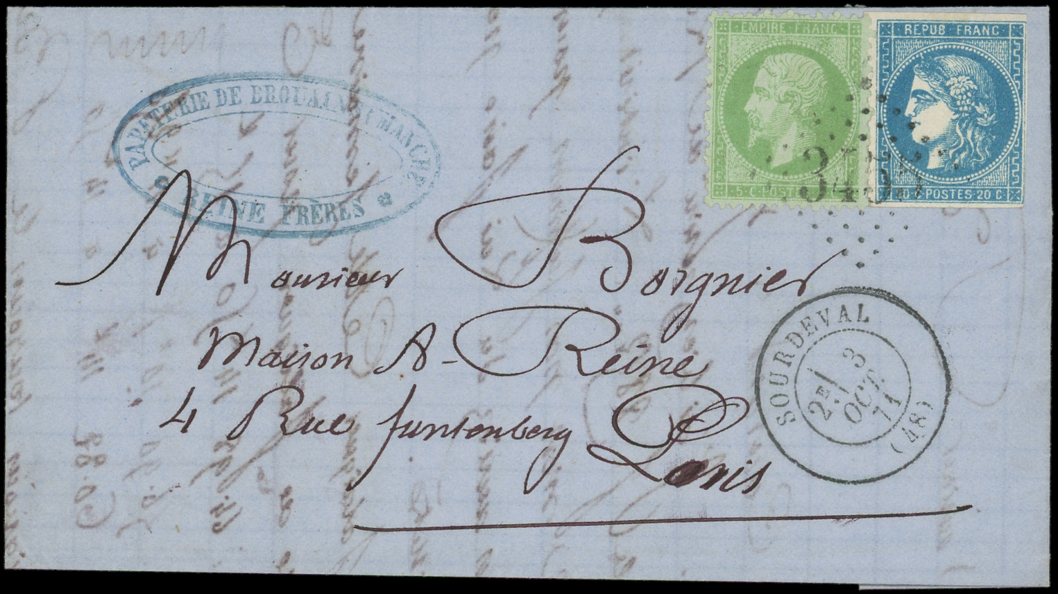 vert BANDE de 3 et 2c. brun rouge (3), obl. GC 1449 s. LAC, càd T16 EURVILLE 6/11/70, arr. NEUFCHATEAU 14/11, n'arrivera à sa destination BAINS en VOSGES que le 9/3/71, après la fin des hostilités, très intéressant et TTB (Image) (Image2)