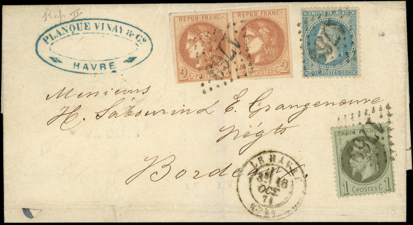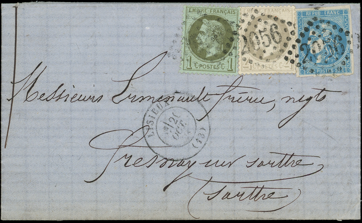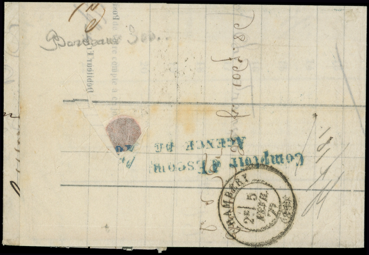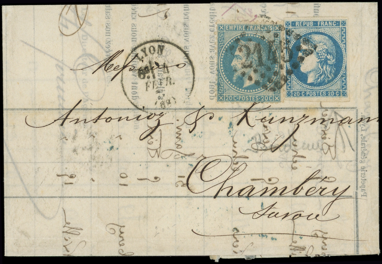 20c. Lauré et 20c. Bordeaux T III R II obl. GC 2145 s. LAC, càd Lyon 4/2/71, combinaison RR de ces 20c. bleu, arr. CHAMBERY, TTB (Image) (Image2)