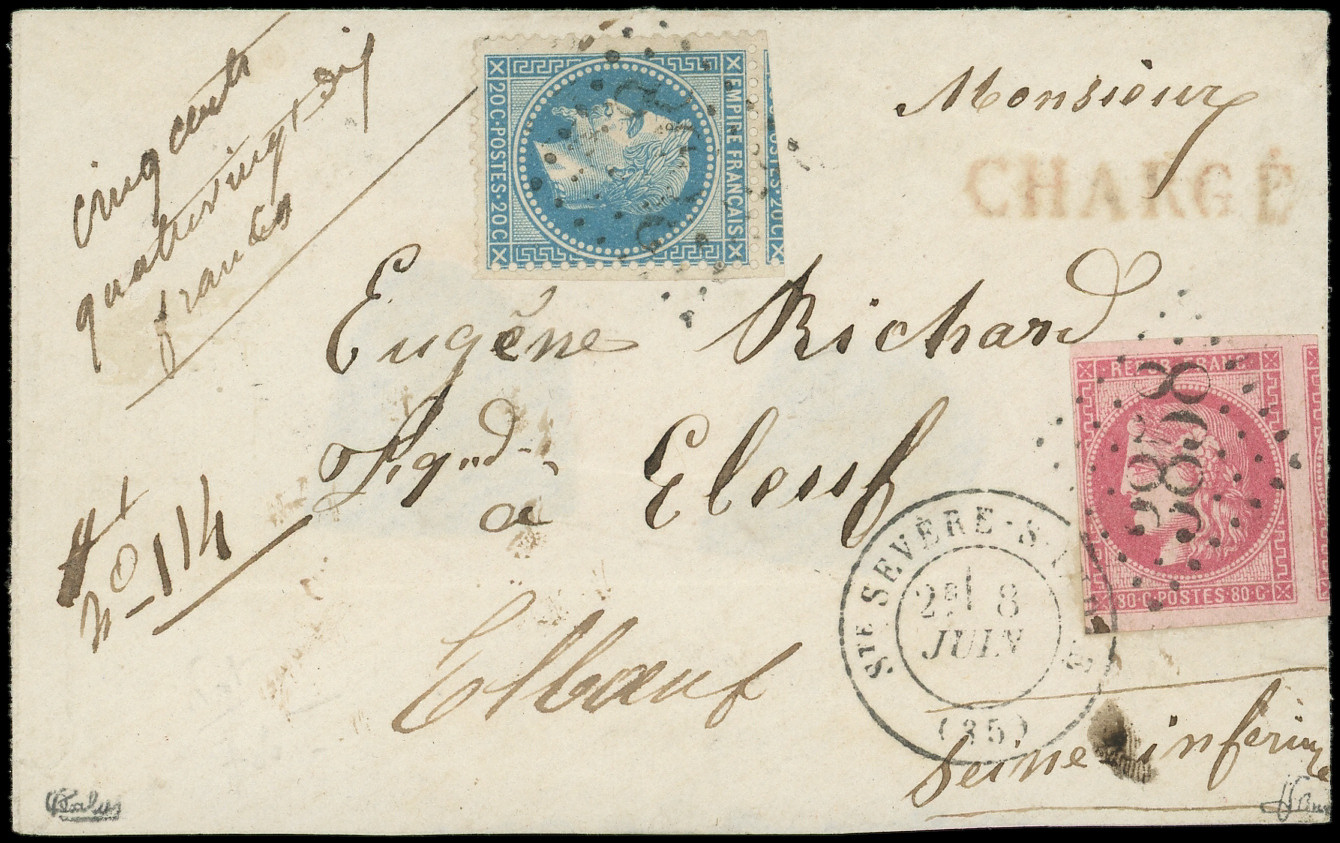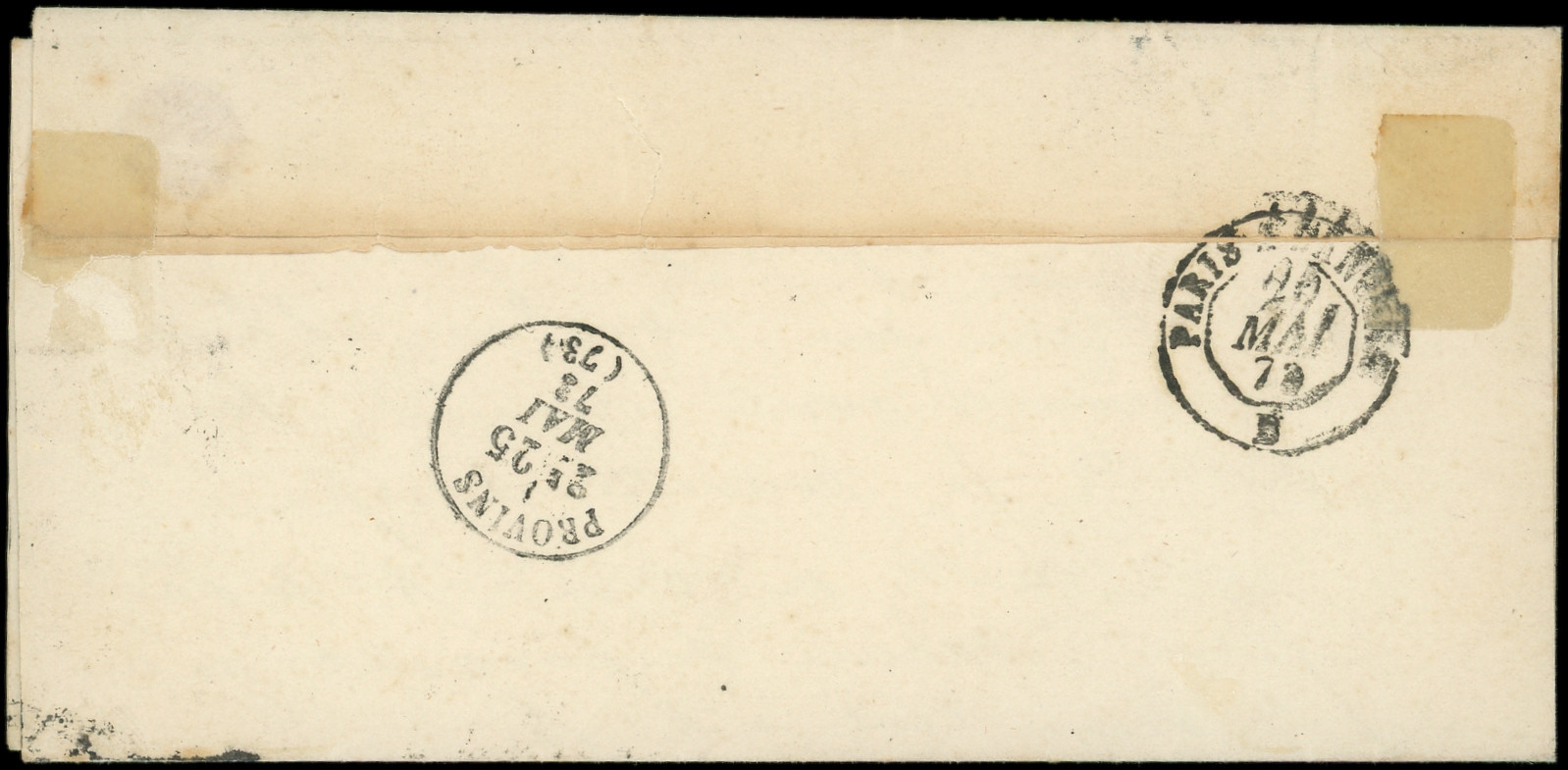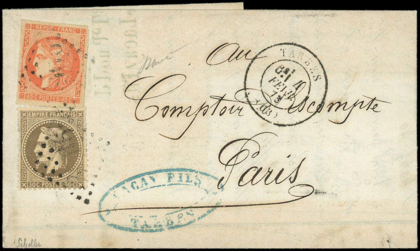 20c. Lauré et 20c. Bordeaux T III R II obl. GC 2145 s. LAC, càd Lyon 4/2/71, combinaison RR de ces 20c. bleu, arr. CHAMBERY, TTB (Image) (Image2)