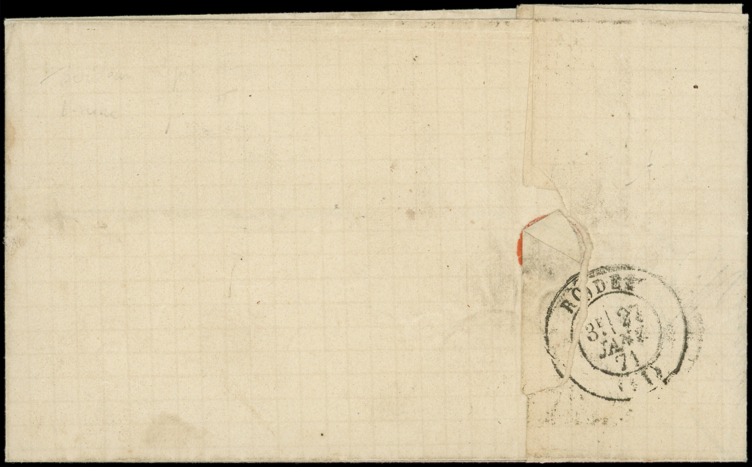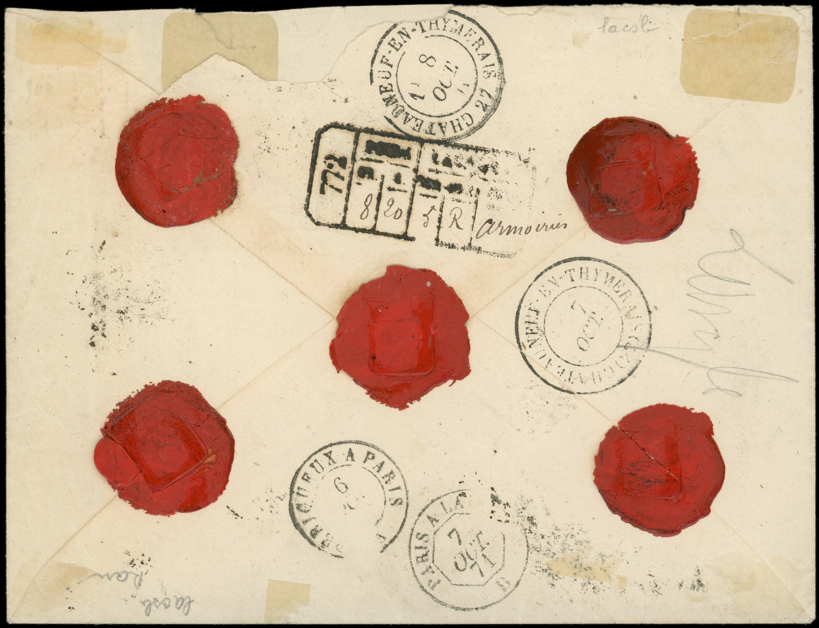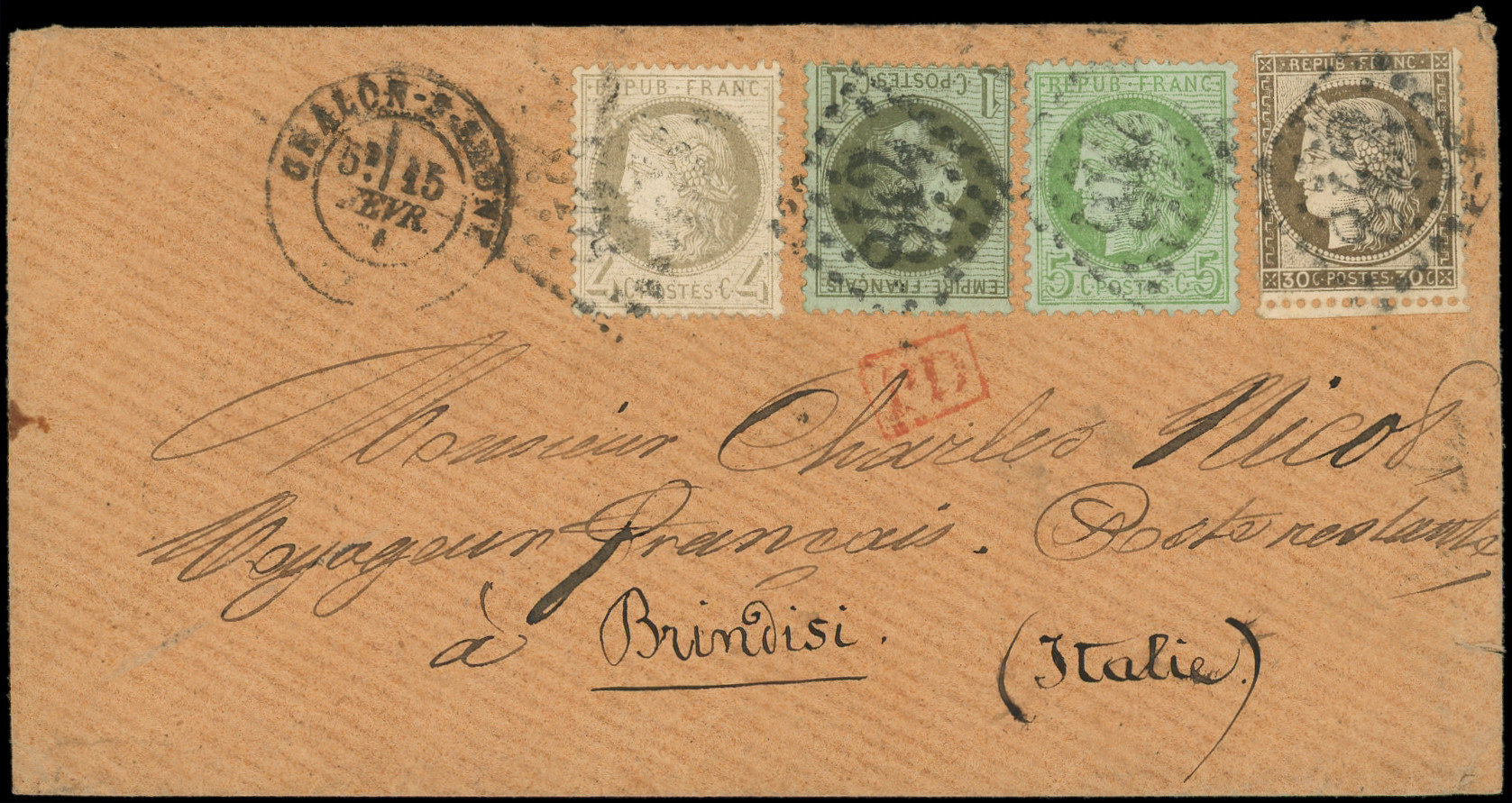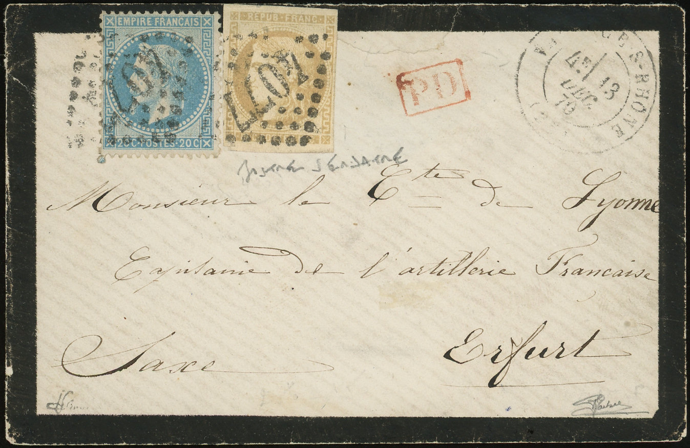 20c. Lauré et 20c. Bordeaux T III R II obl. GC 2145 s. LAC, càd Lyon 4/2/71, combinaison RR de ces 20c. bleu, arr. CHAMBERY, TTB (Image) (Image2)
