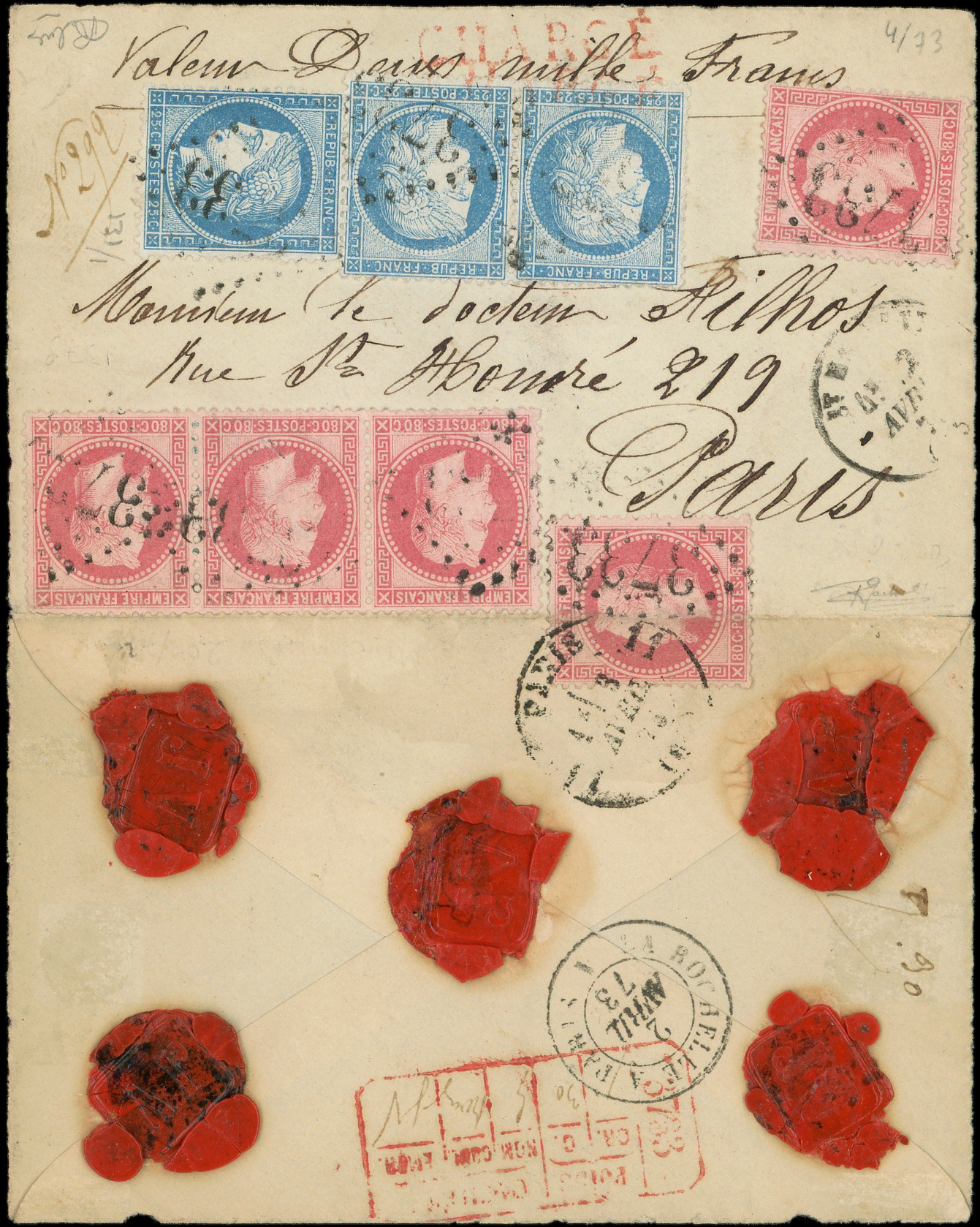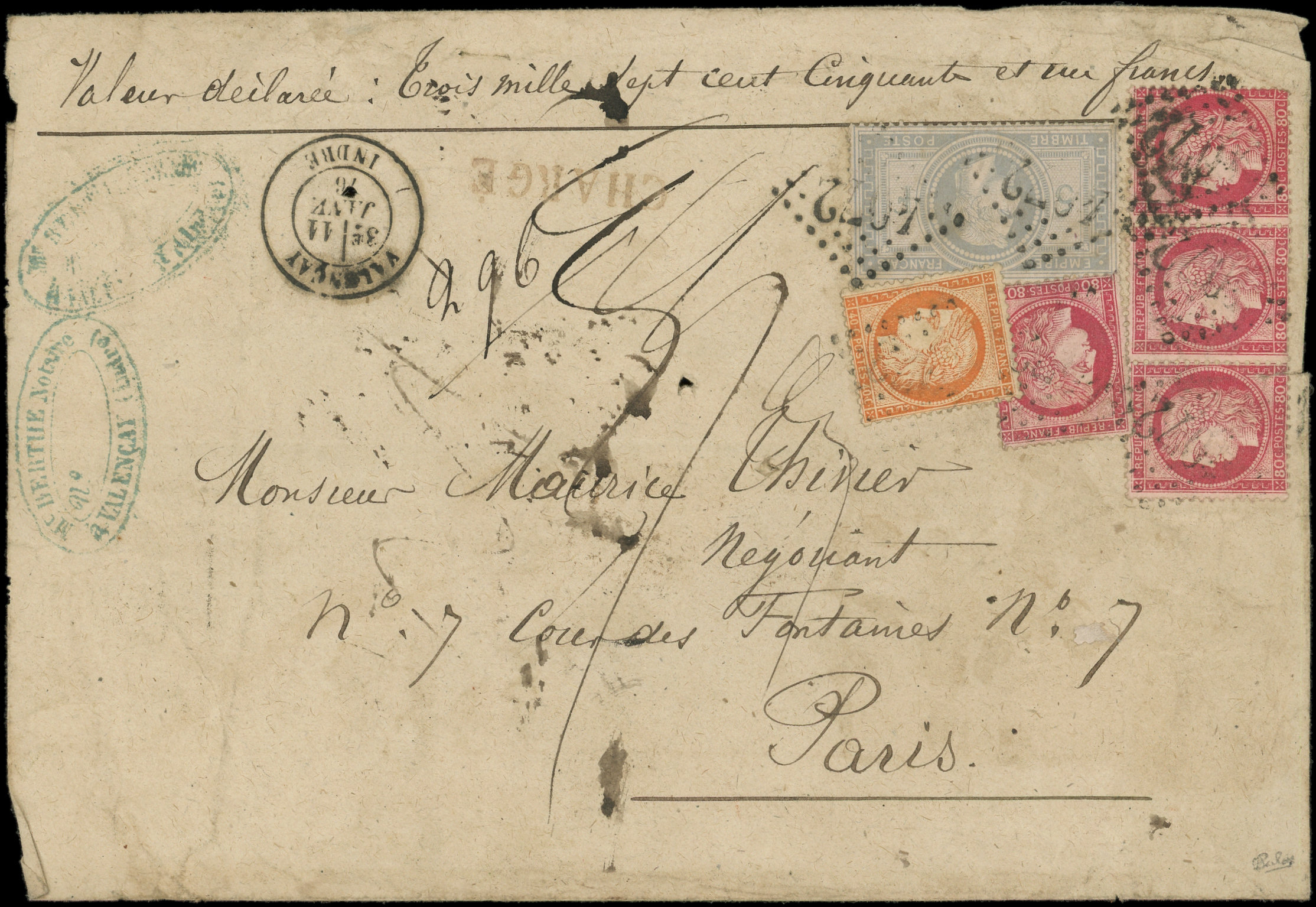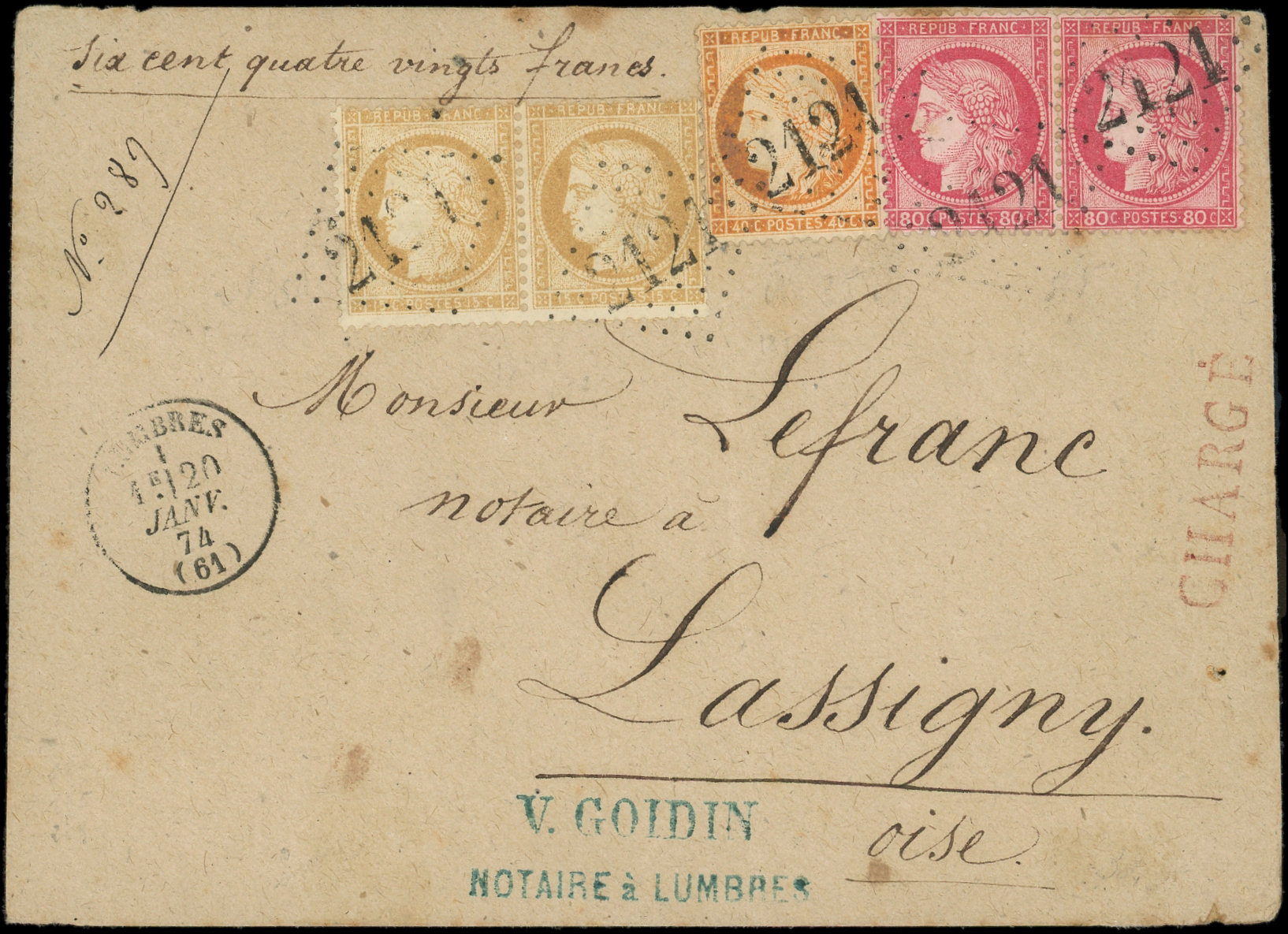 BANDE de 3 + 1 ex., obl. GC 4072 s. Env. CHARGE, càd T17 VALENCAY 11/1/76, qqs très lég. défauts mais pièce très plaisante. C, certif JF Brun (Image) (Image2)