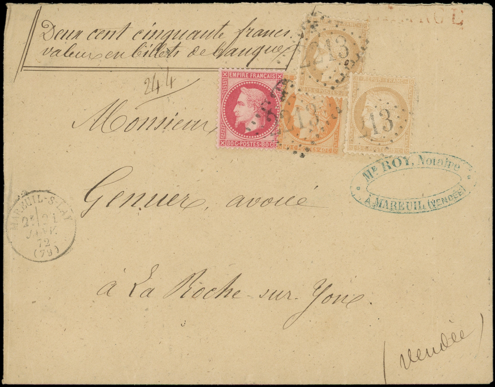 (2) obl. GC 2213 s. Env. CHARGE, càd T16 MAREUIL s. LAY 21/1/72, TRICOLORE de 3 émissions, TB (Image) (Image2)