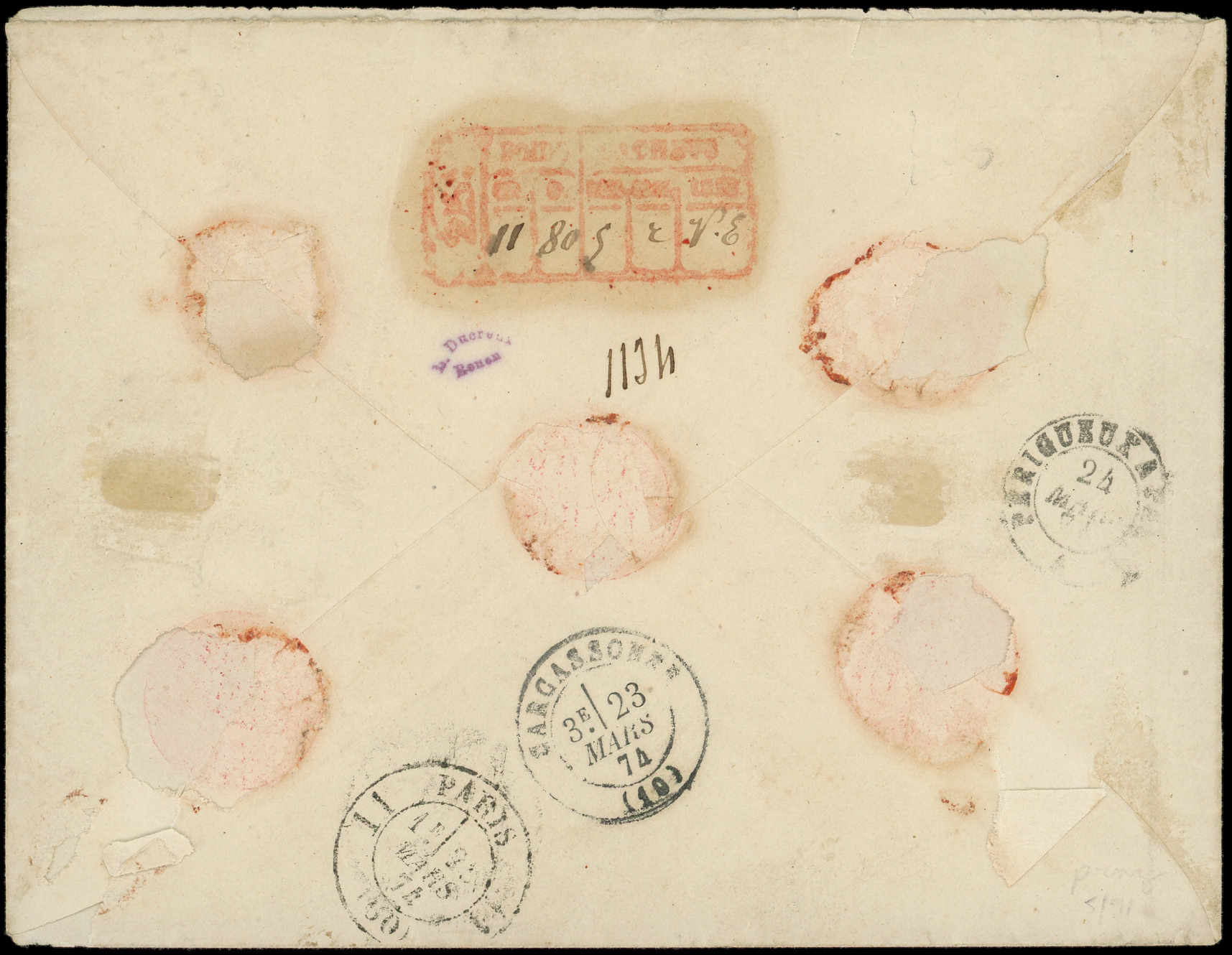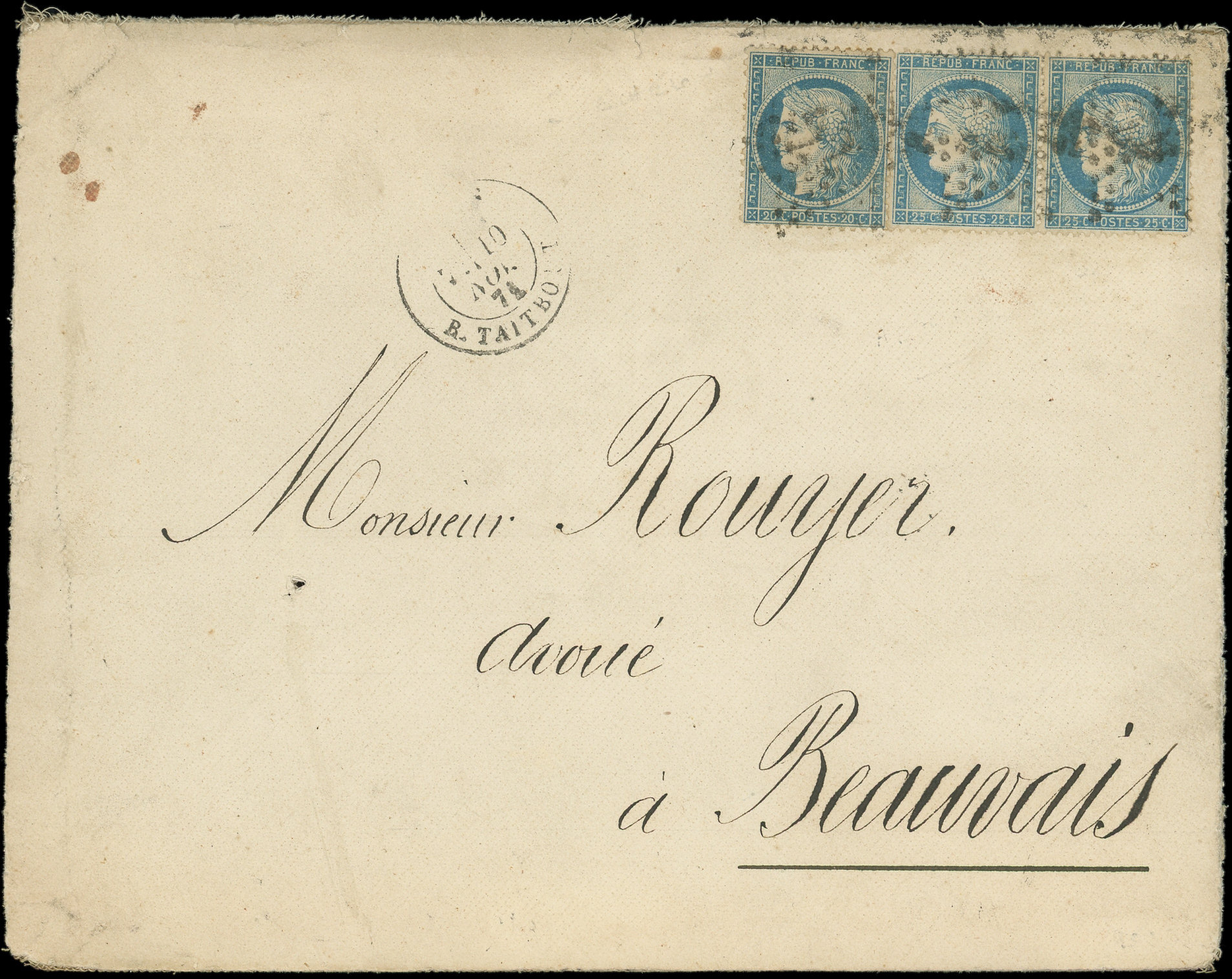 obl. Etoile 22 s. Env., càd R. Taitbout 10/11/71, Rare combinaison de bleus, 3e échelon, TB (Image)