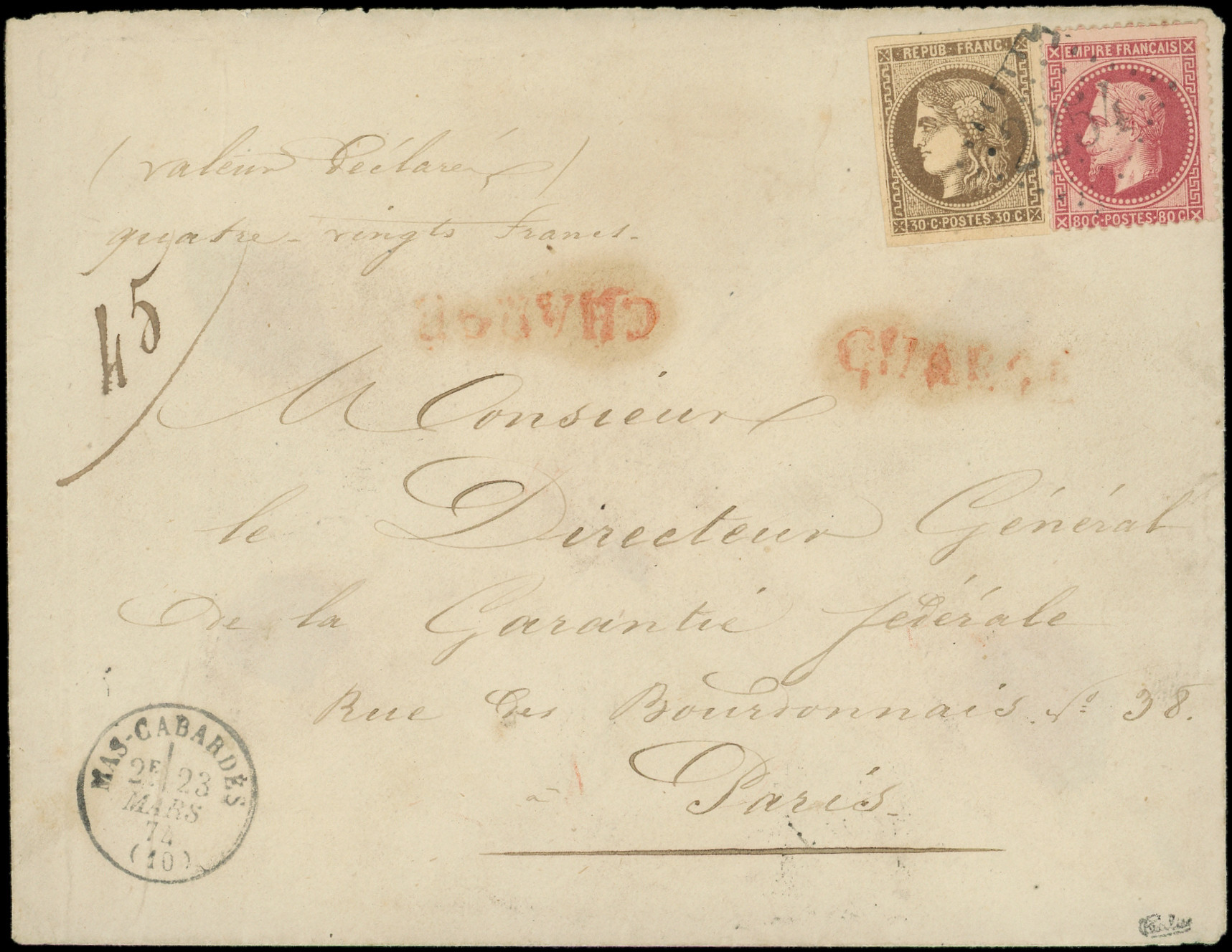 GC 2254 s. Env. CHARGE, càd T16 MAS-CABARDES 23/3/74, envoi en Valeur Déclarée, Superbe (Image) (Image2)