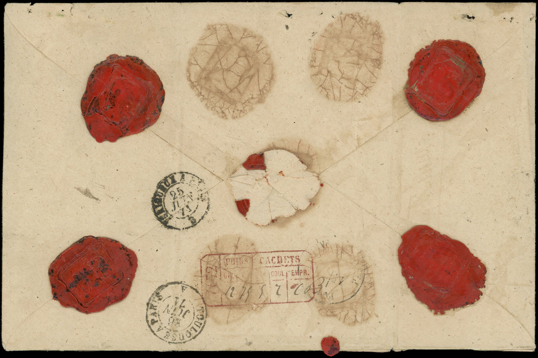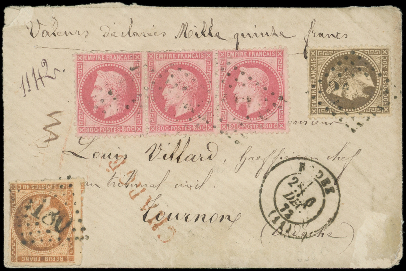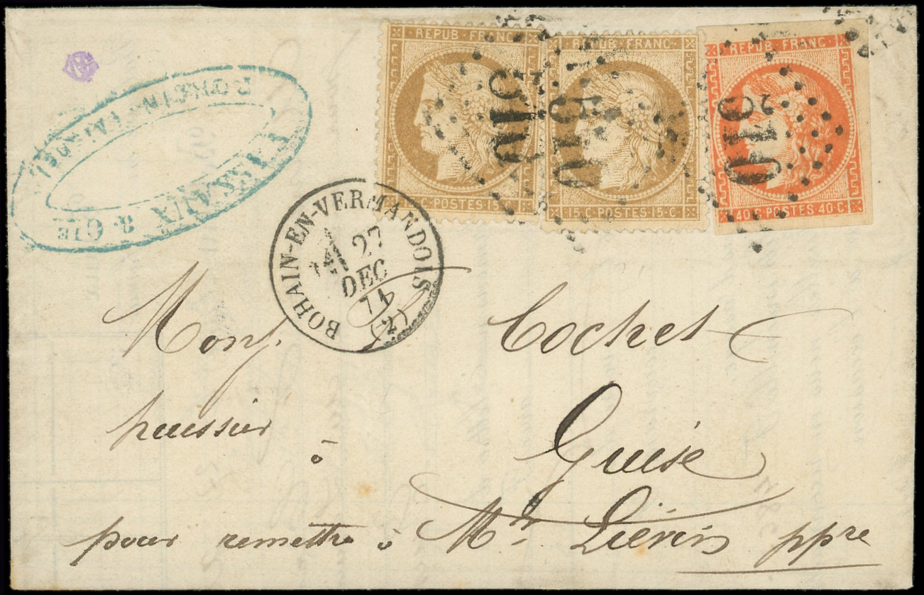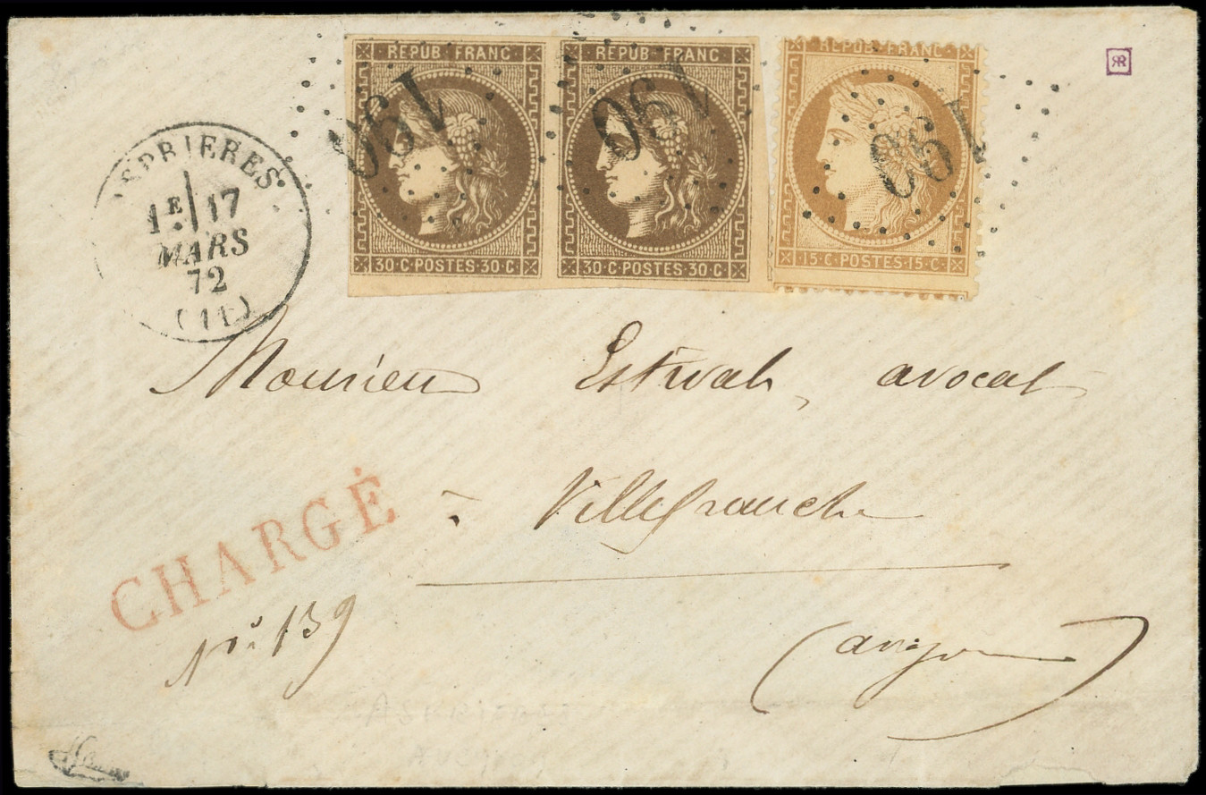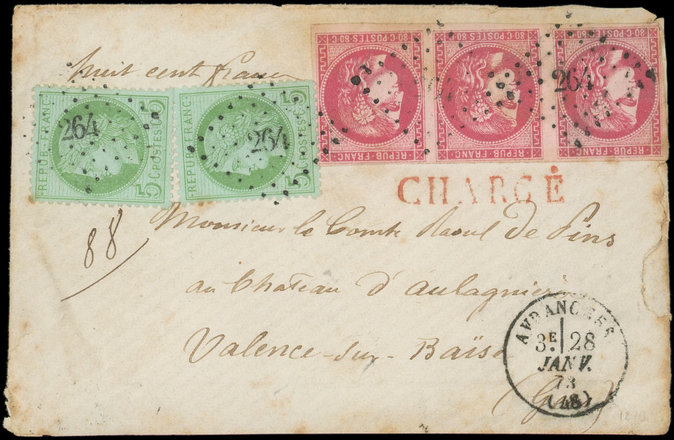 BANDE de 3 dt 1 t. effl. et N°53 (2), tous obl. PC du GC 264 s. Env. CHARGE, càd AVRANCHES 28/1/73, cachet de chargement au verso, certif. Scheller, très jolie pièce