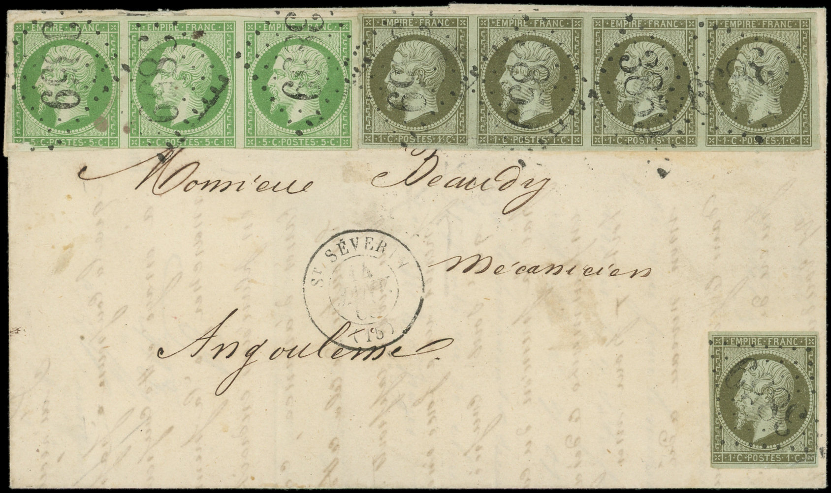 BANDE de 4 + 1 ex. et 5c. BANDE de 3 (1er t. déf.) obl. GC 3859 s. LAC, càd T15 St SEVERIN 4/1/63, afft RR, TTB (Image)