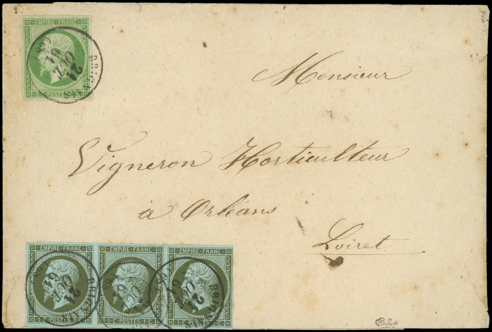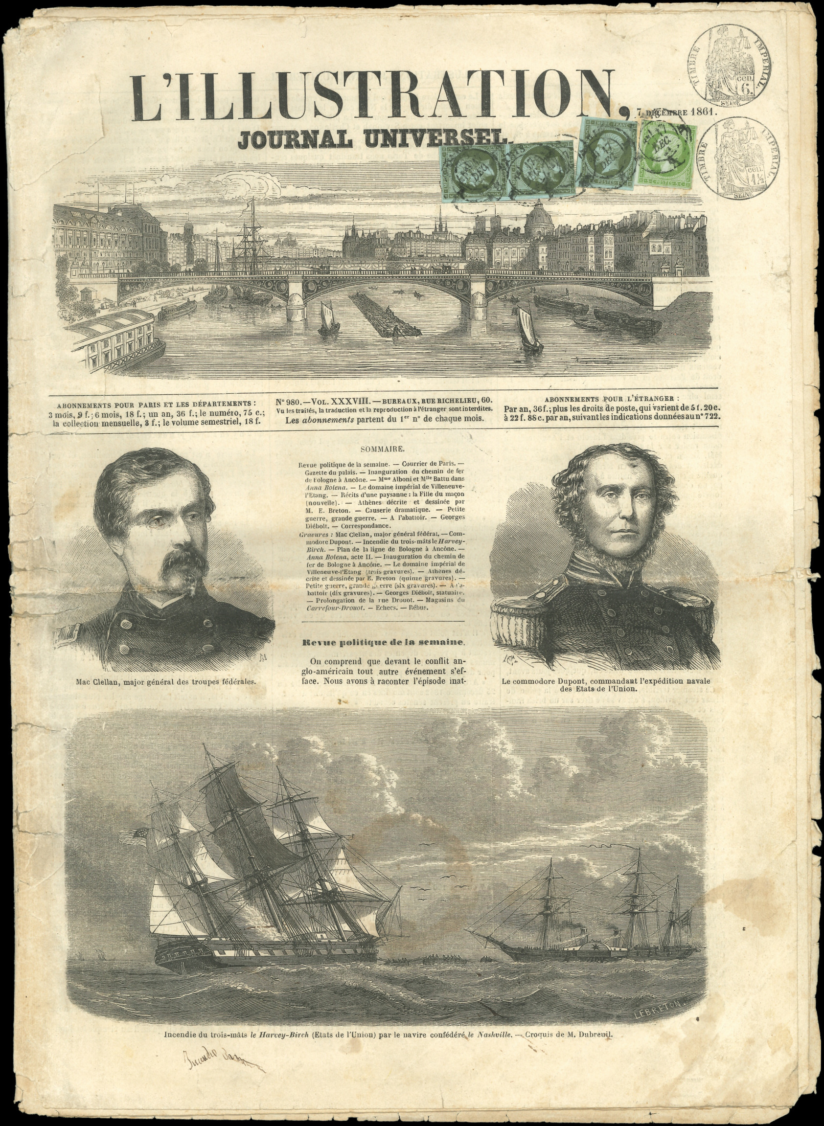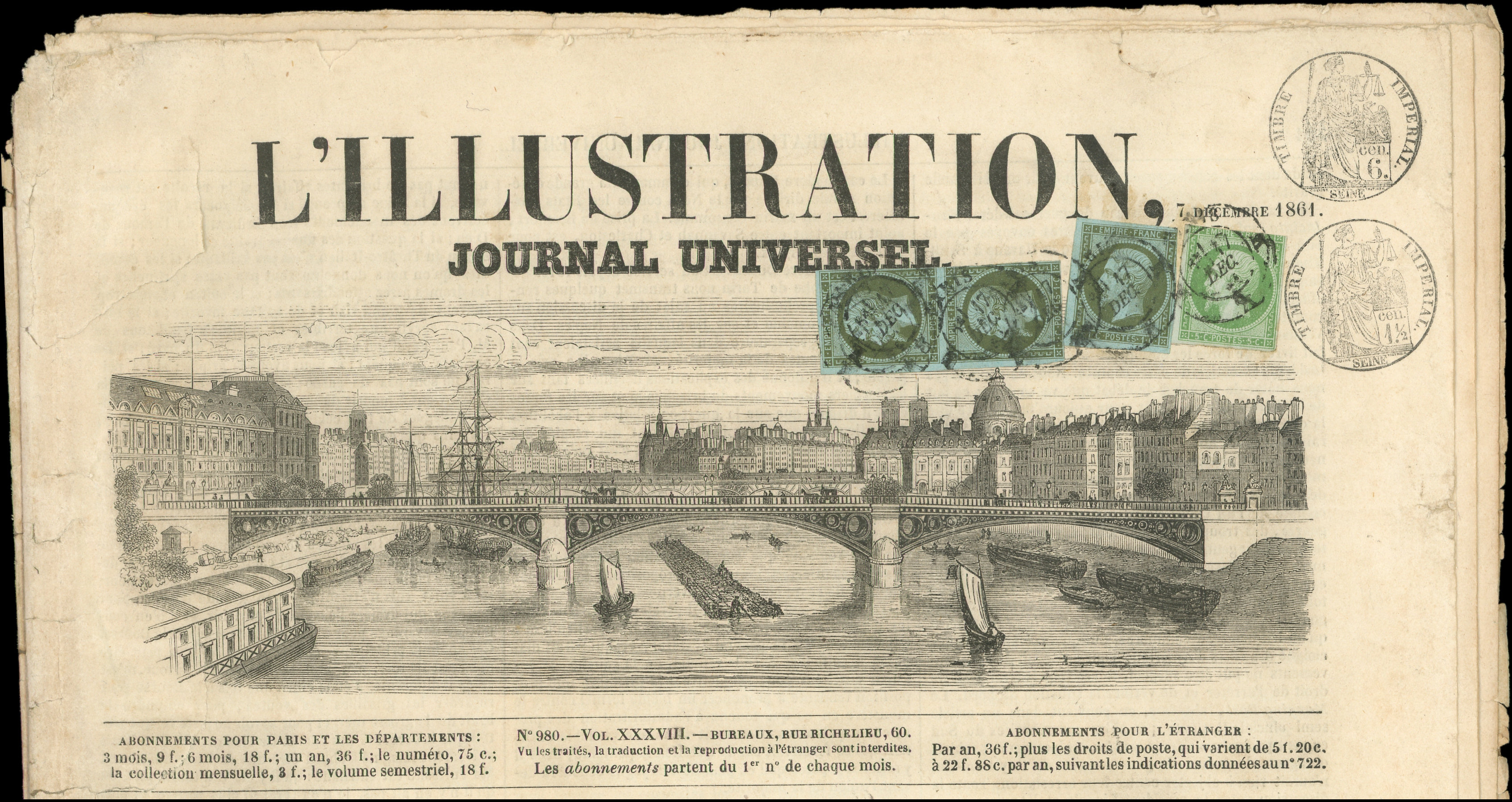 PAIRE + 1 ex., 5c., tous obl. càd PARIS 17/12/61 s. L'ILLUSTRATION Journal Universel joliment illustré, Timbre Impérial à 6 cen et 1 1/2 cen en complément. Les timbres sont touchés mais ensemble RR et très plaisant (Image) (Image2)