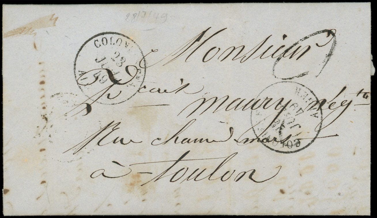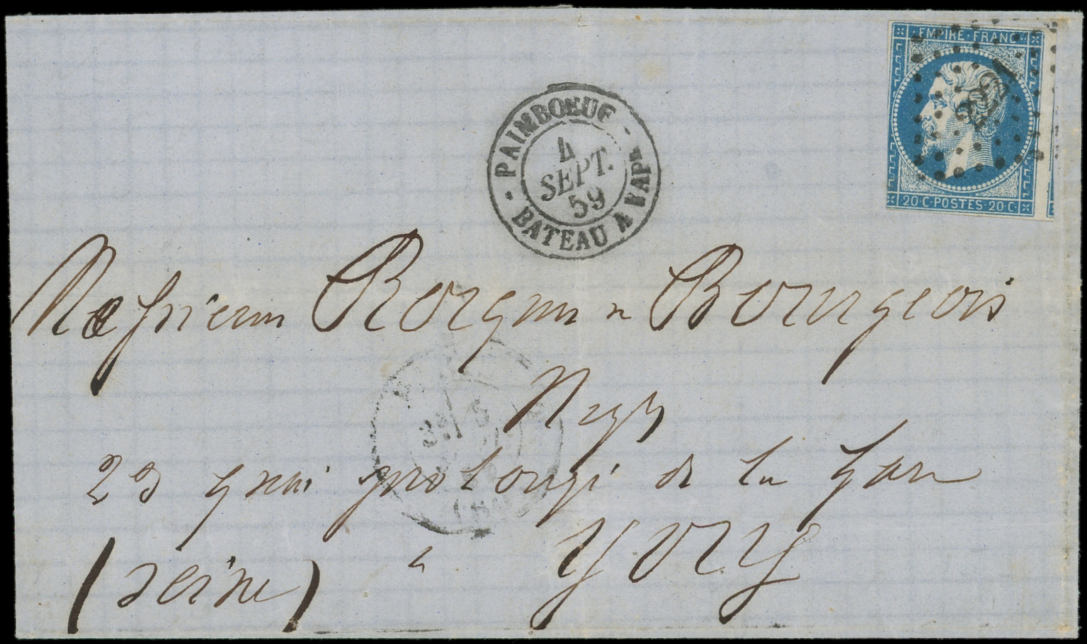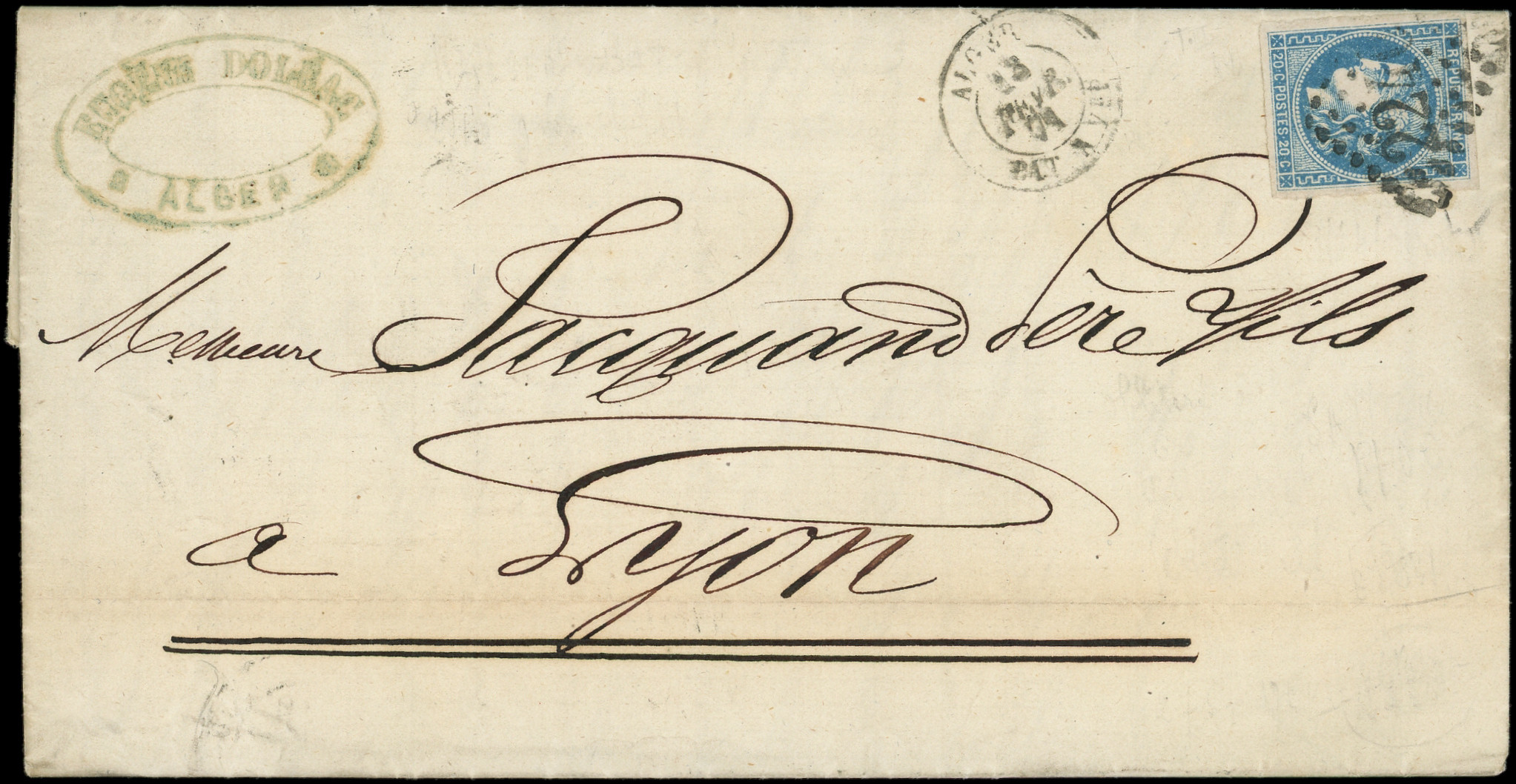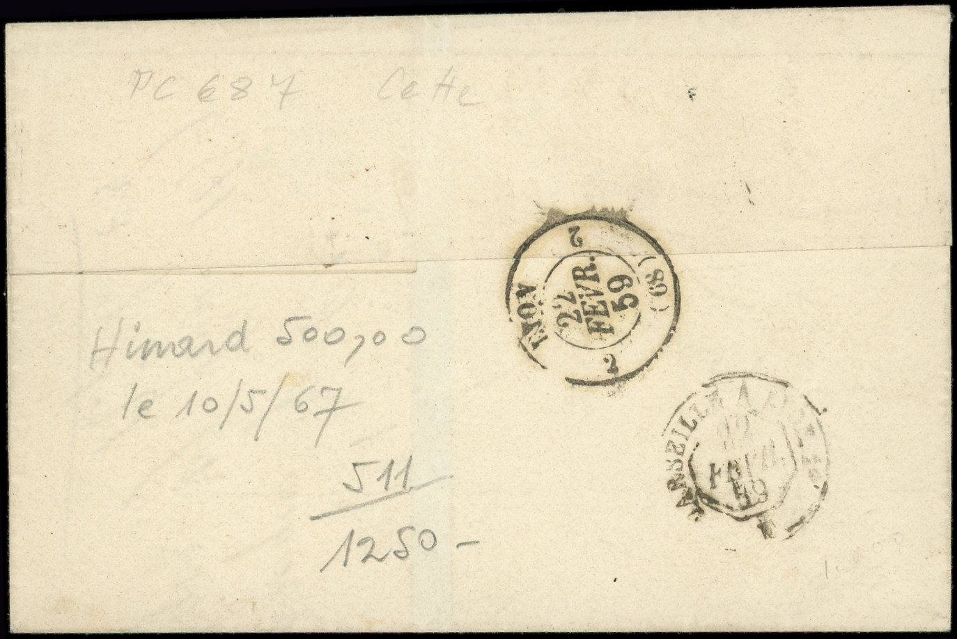s. LSC d'Alger 17/2/59 postée à CETTE, càd ALGER BATEAU A VAPEUR 21/2 en ROUGE, non répertorié dans Salles, arr. LYON 22/2, RR et Superbe, certif. JF Brun (Image) (Image2)