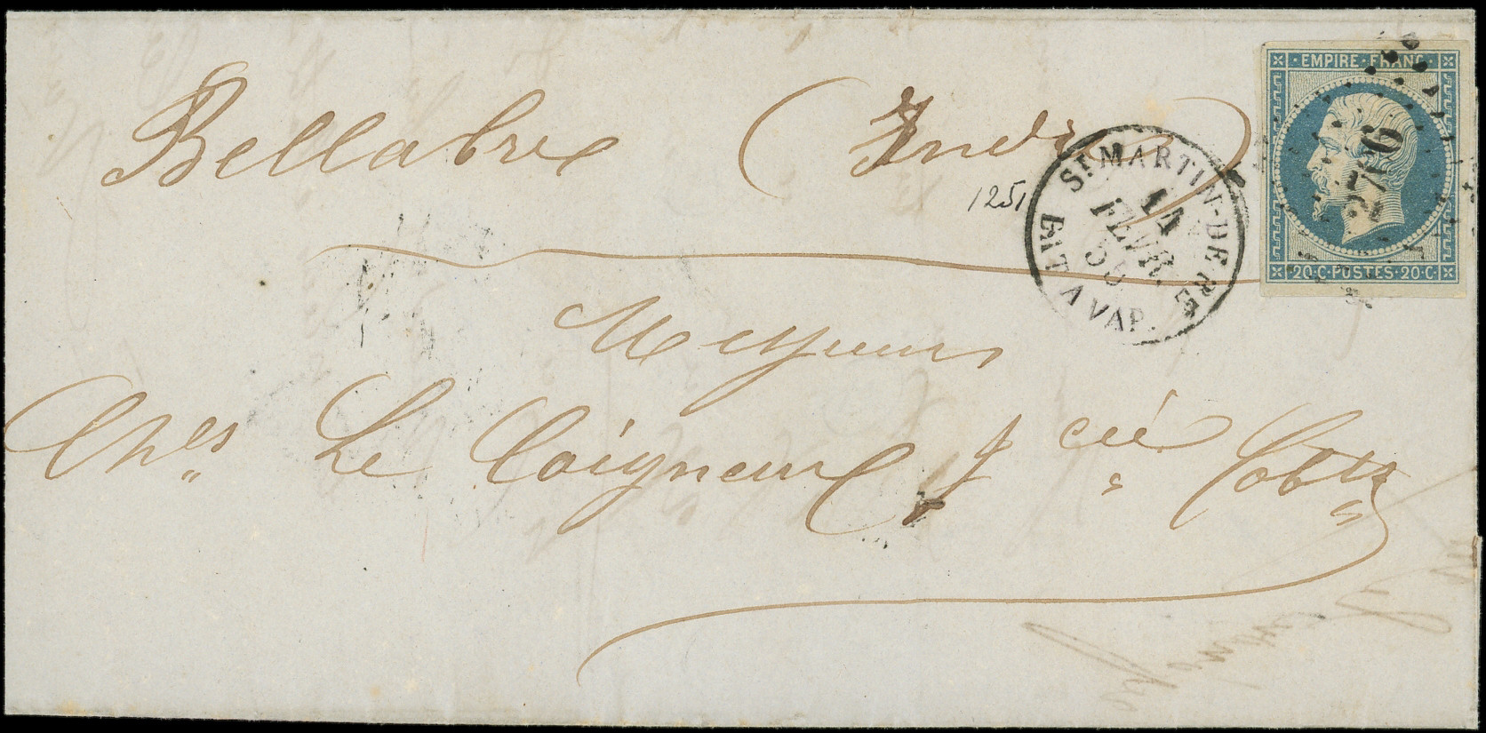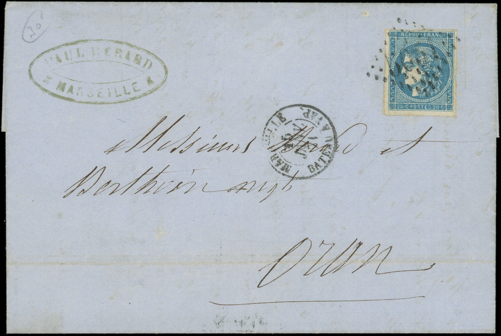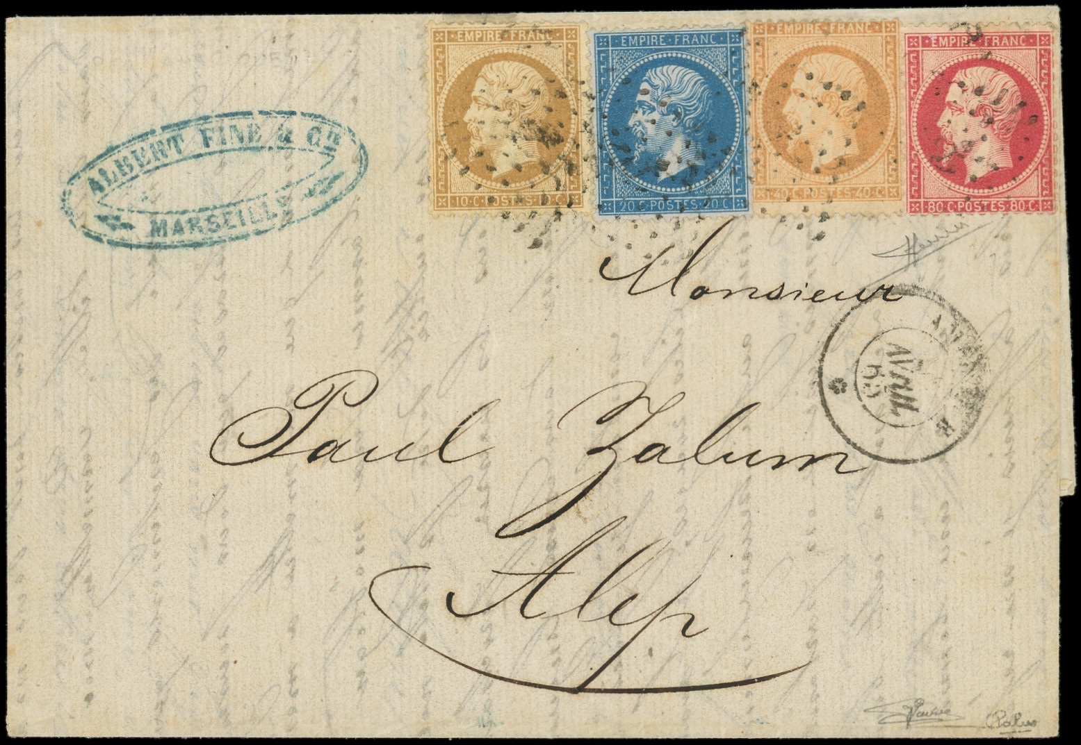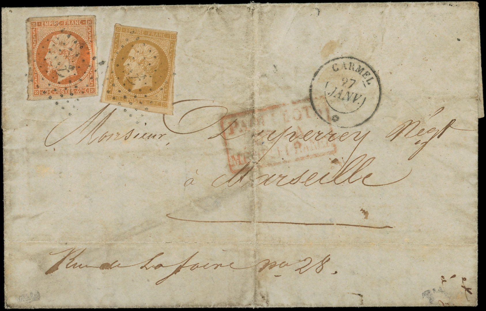 s. LSC d'Alger 17/2/59 postée à CETTE, càd ALGER BATEAU A VAPEUR 21/2 en ROUGE, non répertorié dans Salles, arr. LYON 22/2, RR et Superbe, certif. JF Brun (Image) (Image2)