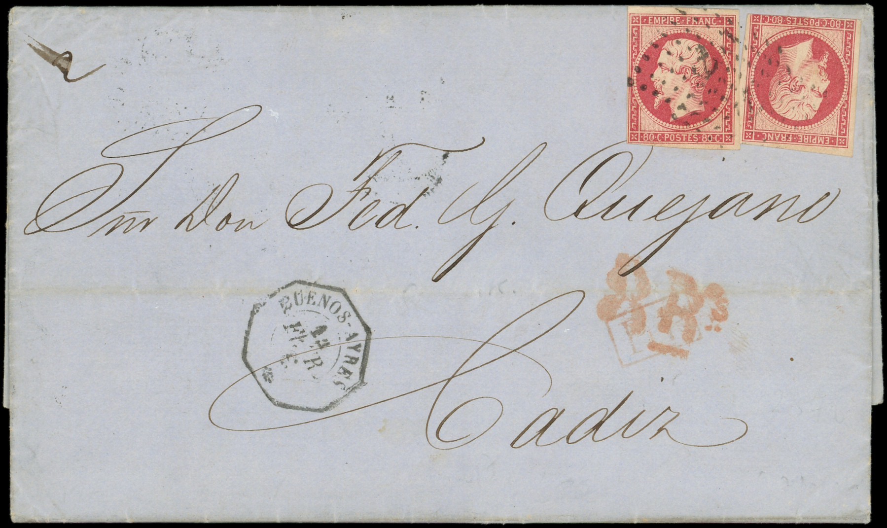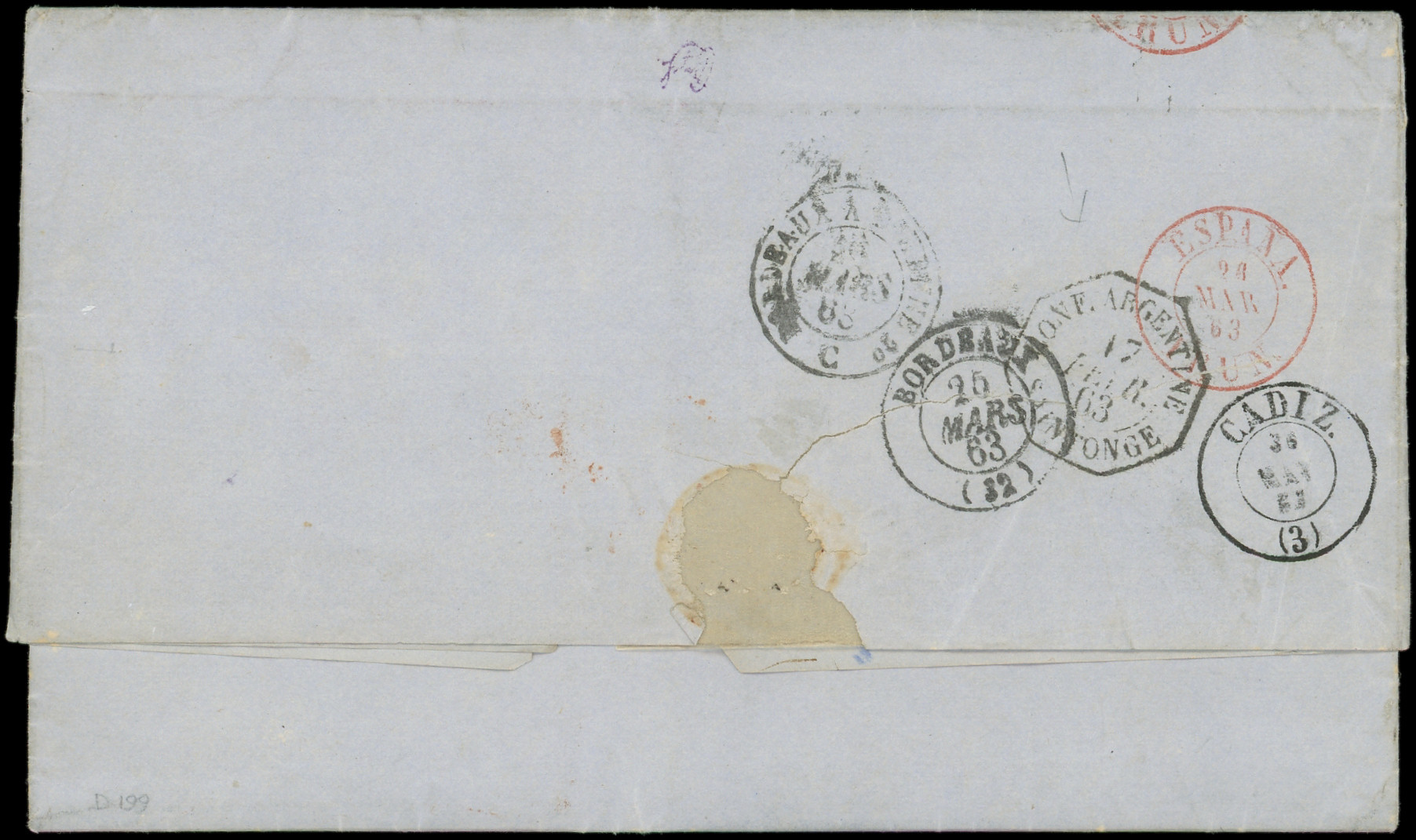 1 touché obl. ANCRE s. LAC de BUENOS AYRES 13/2/63, càd Octog. BUENOS AYRES 13/2, Taxe 8Rs pour CADIZ 30/3, au verso càd Octog. CONF. ARGENTINE SAINTONGE 17/2 et ESPANA IRUN 21/3 en rouge, TB (Image) (Image2)