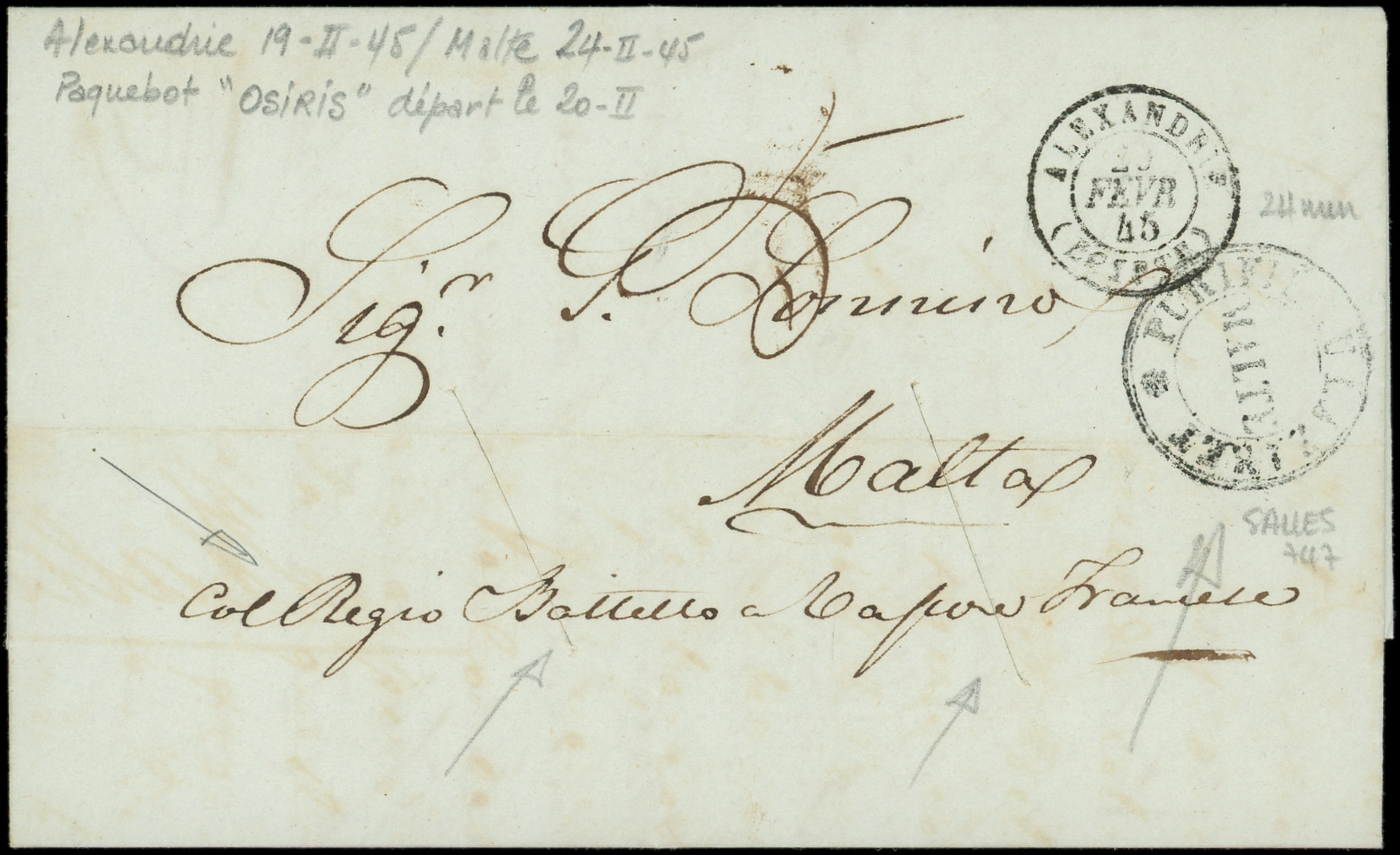20/2/45 s. LAC pour MALTE par le Paquebot OSIRIS, cachet à l'arrivée PURIFIE AU LAZARET MALTE, TB (Image)