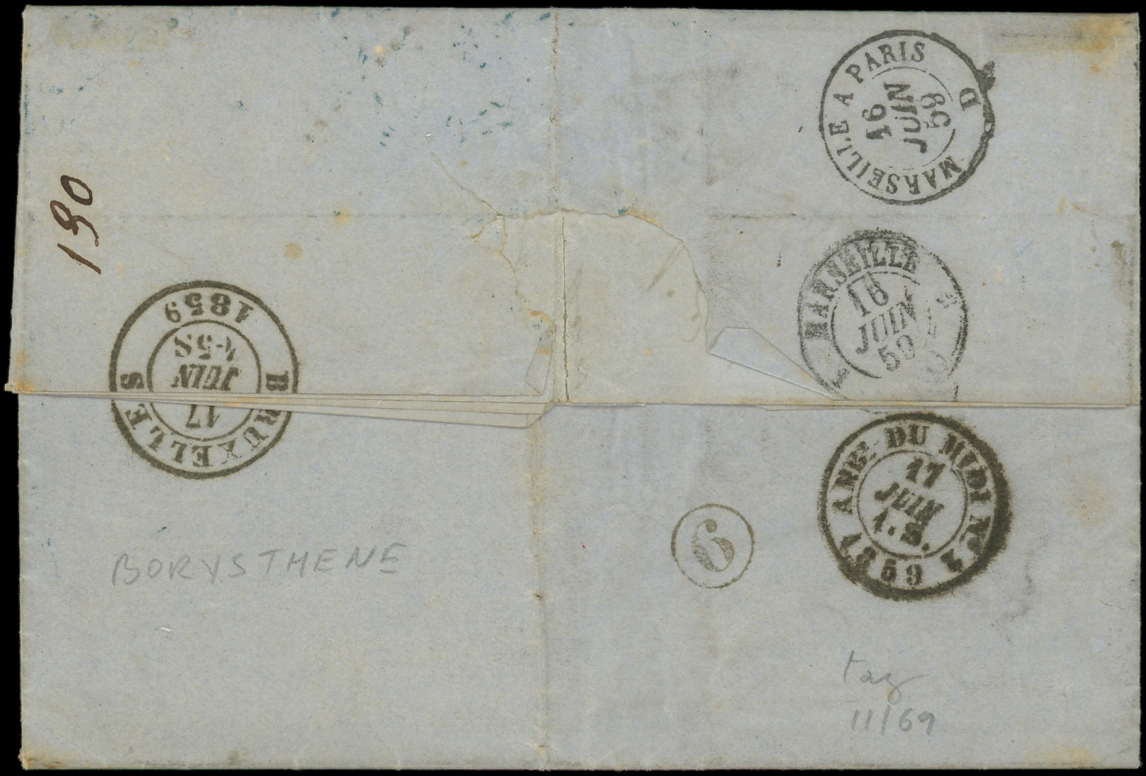 touché) obl. ANCRE s. LAC de Constantinople, càd Paquebot BORYSTHENE 5/6/59, le tout en bleu, passage Marseille 16/6 et arr. BRUXELLES 17/6, TB (Image) (Image2)