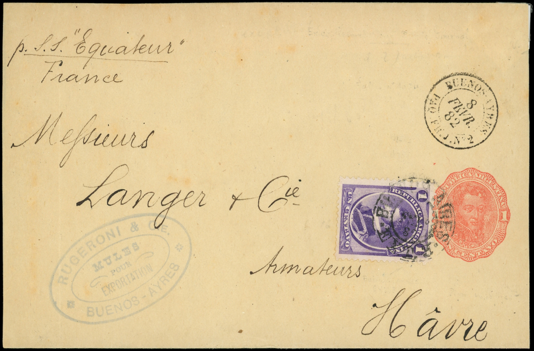 1c. rouge + timbre d'Argentine 1c. violet obl. càd BUENOS AIRES EXT 3, à côté càd BUENOS-AYRES PAQ. FR. J N°2 8/2/82 pour LANGER et Cie au HAVRE, TB (Image)