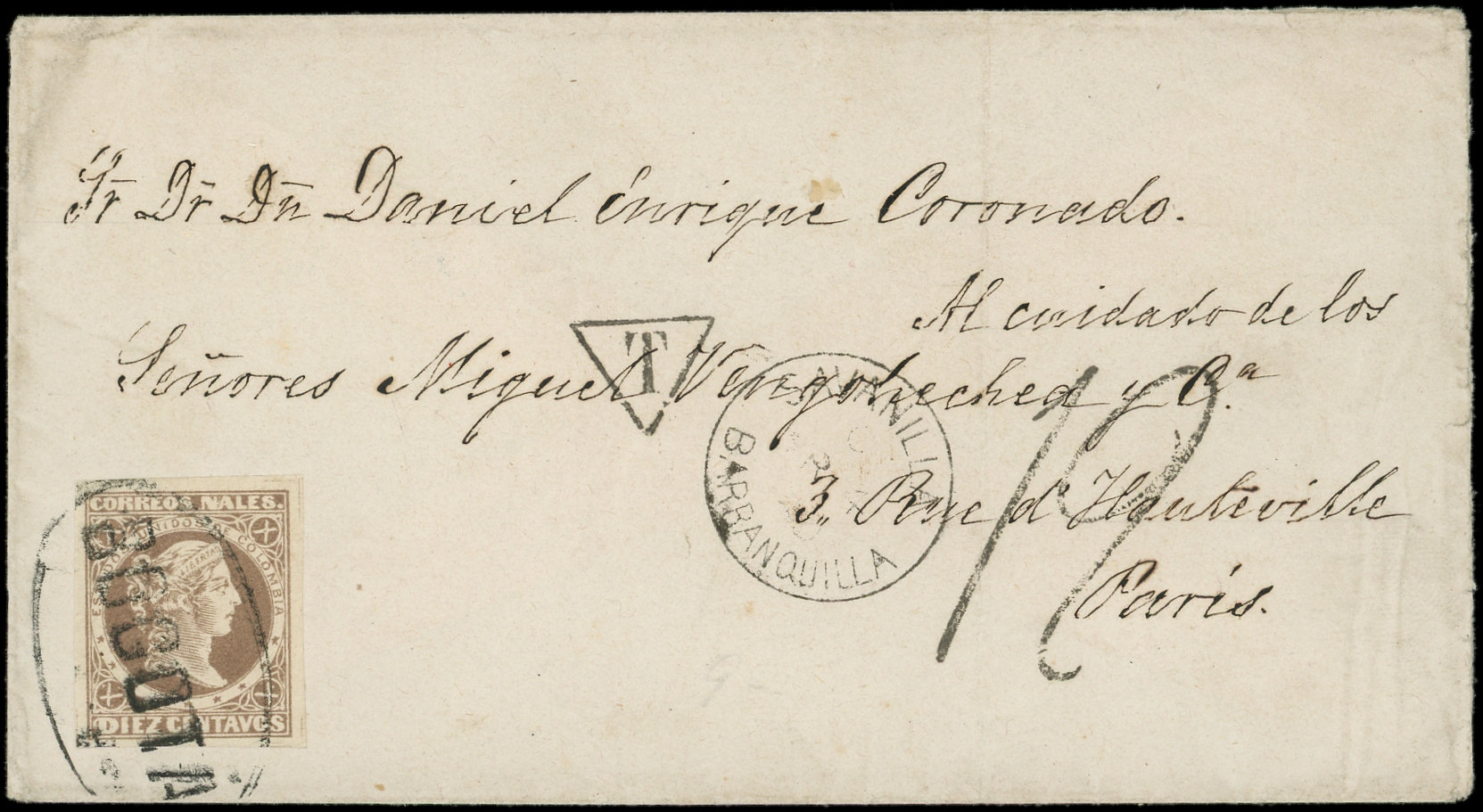10c. brun obl. ovale BOGOTA pour le port intérieur s. Env. déposée à l'agence Britannique, càd SAVANILLA BARRANQUILLA, puis aux agents Français, càd d'escale LIGNE A PAQ. FR. N°2 5/3/80, arr. PARIS 27/3/80, TB (Image) (Image2)