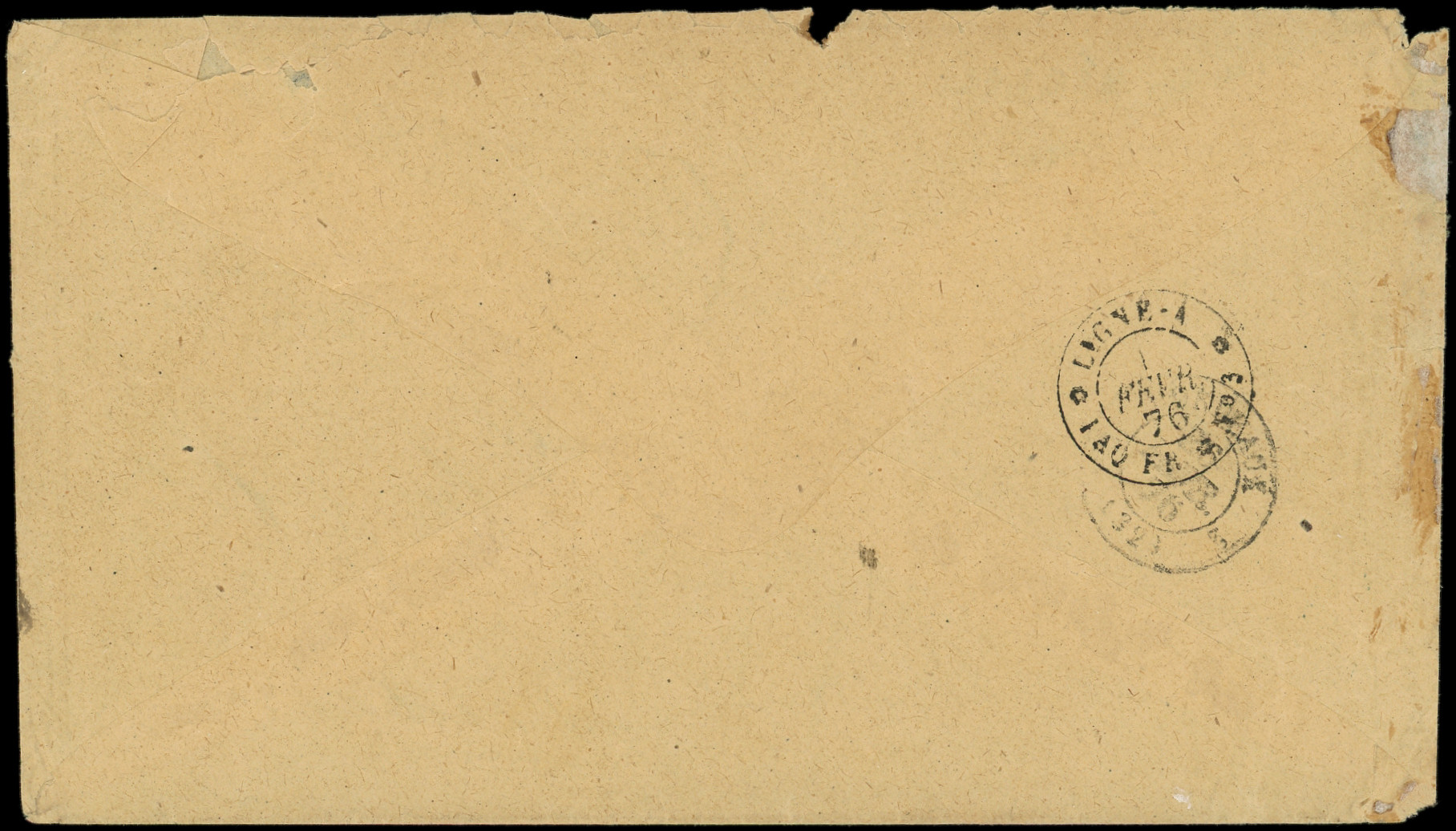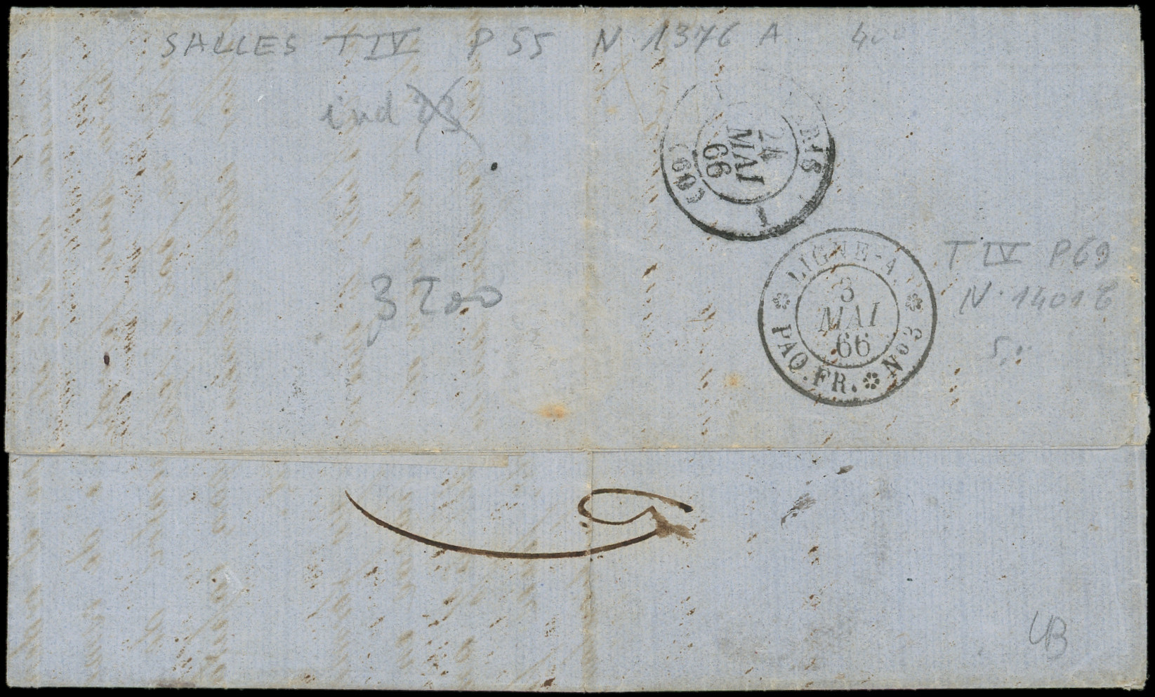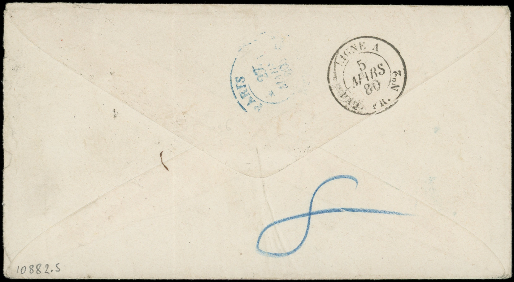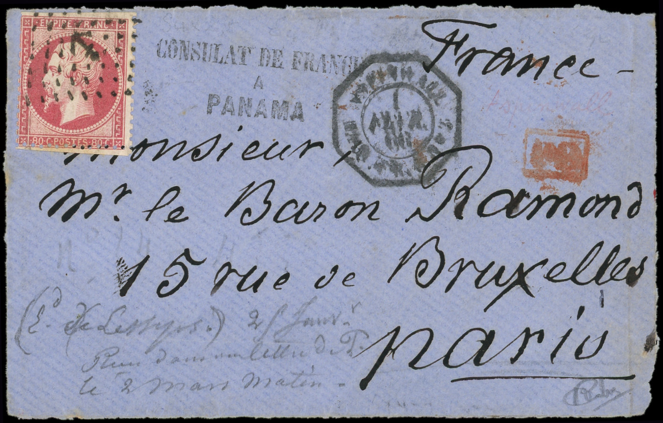 obl. ANCRE s. DL posté directement à bord du Paquebot, càd d'Escale ASPINWALL PAQ. FR. N°2 1/2/66, cachet du CONSULAT de FRANCE à PANAMA, mention manuscrite de l'expéditeur Edmond de Lesseps Consul de France. Seule lettre connue d'Aspinwall avec le
