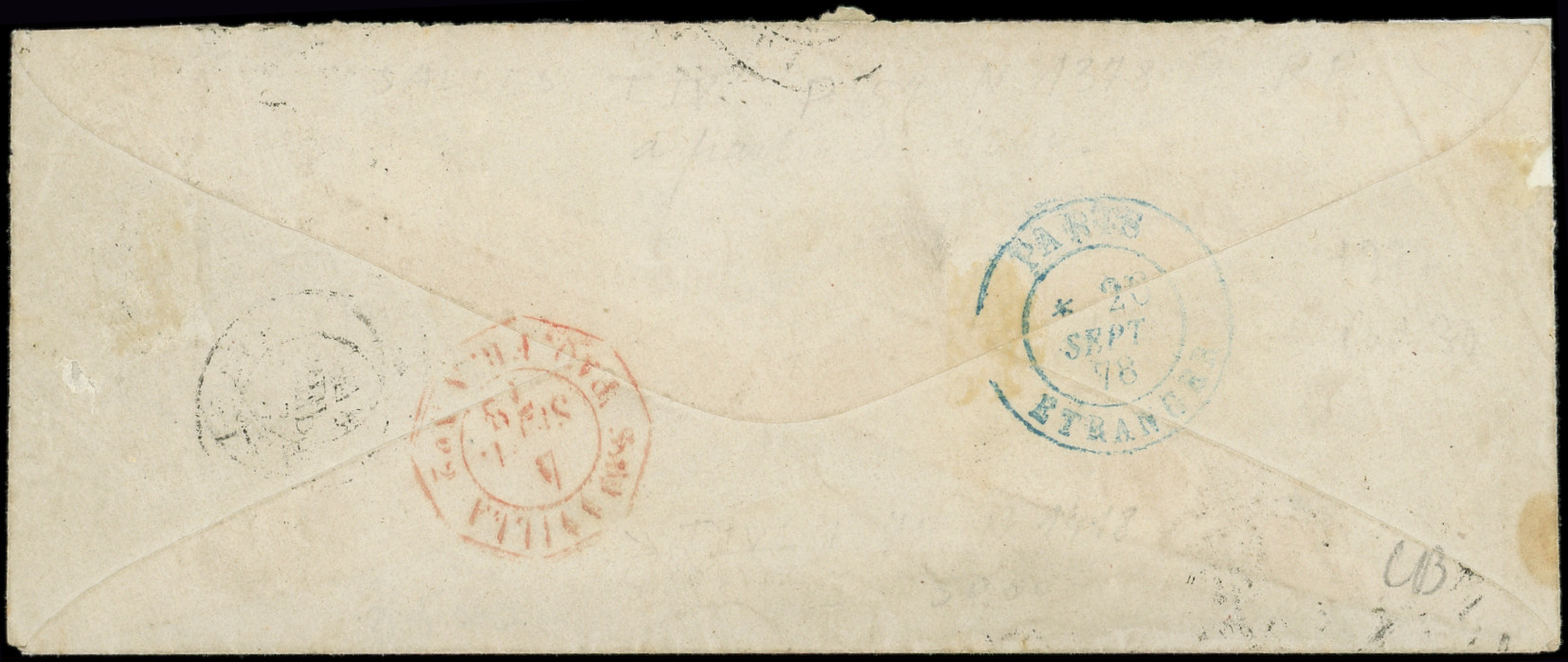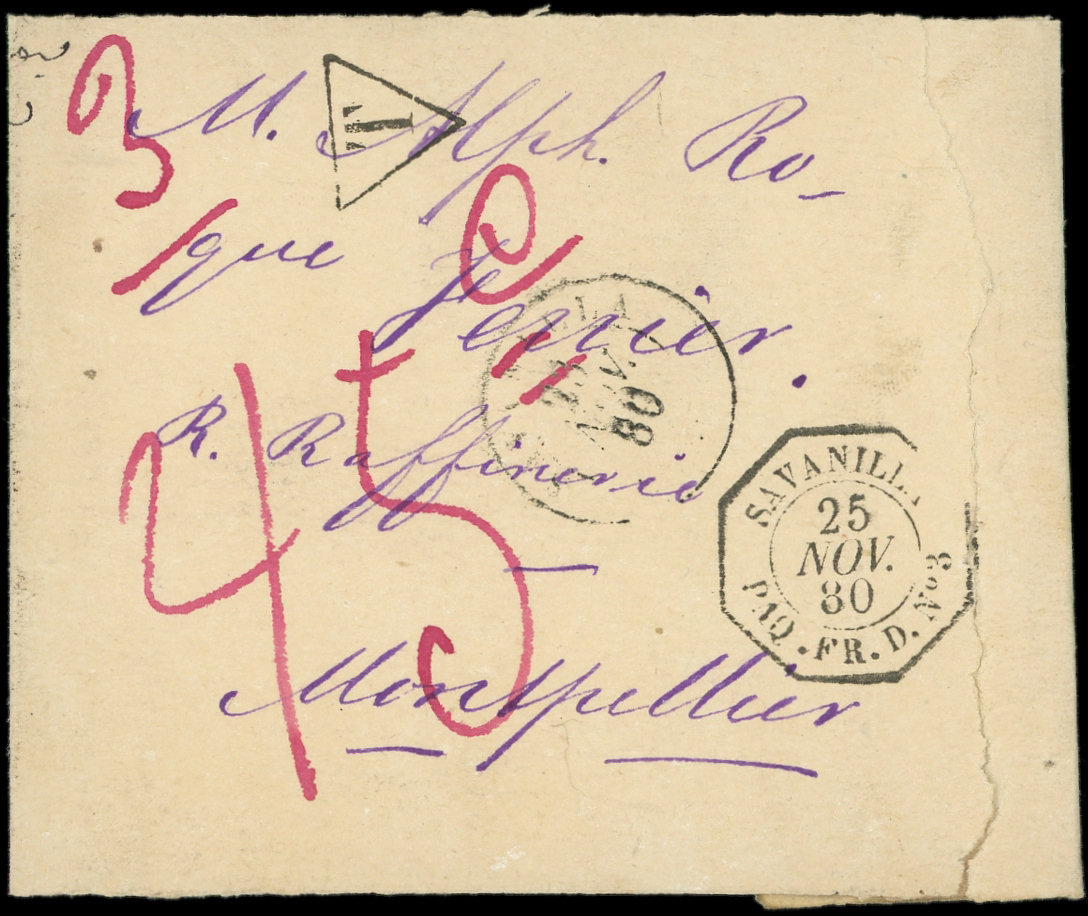 arrondi, obl. càd Paquebot SAVANILLA 2/9/78, ind. 33 s. Env., au verso càd rouge SAVANILLA PAQ. FR. A N°2 4/9, arr. Paris 26/9, TTB (Image) (Image2)