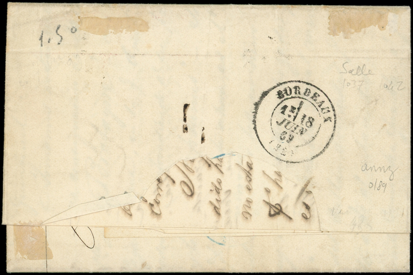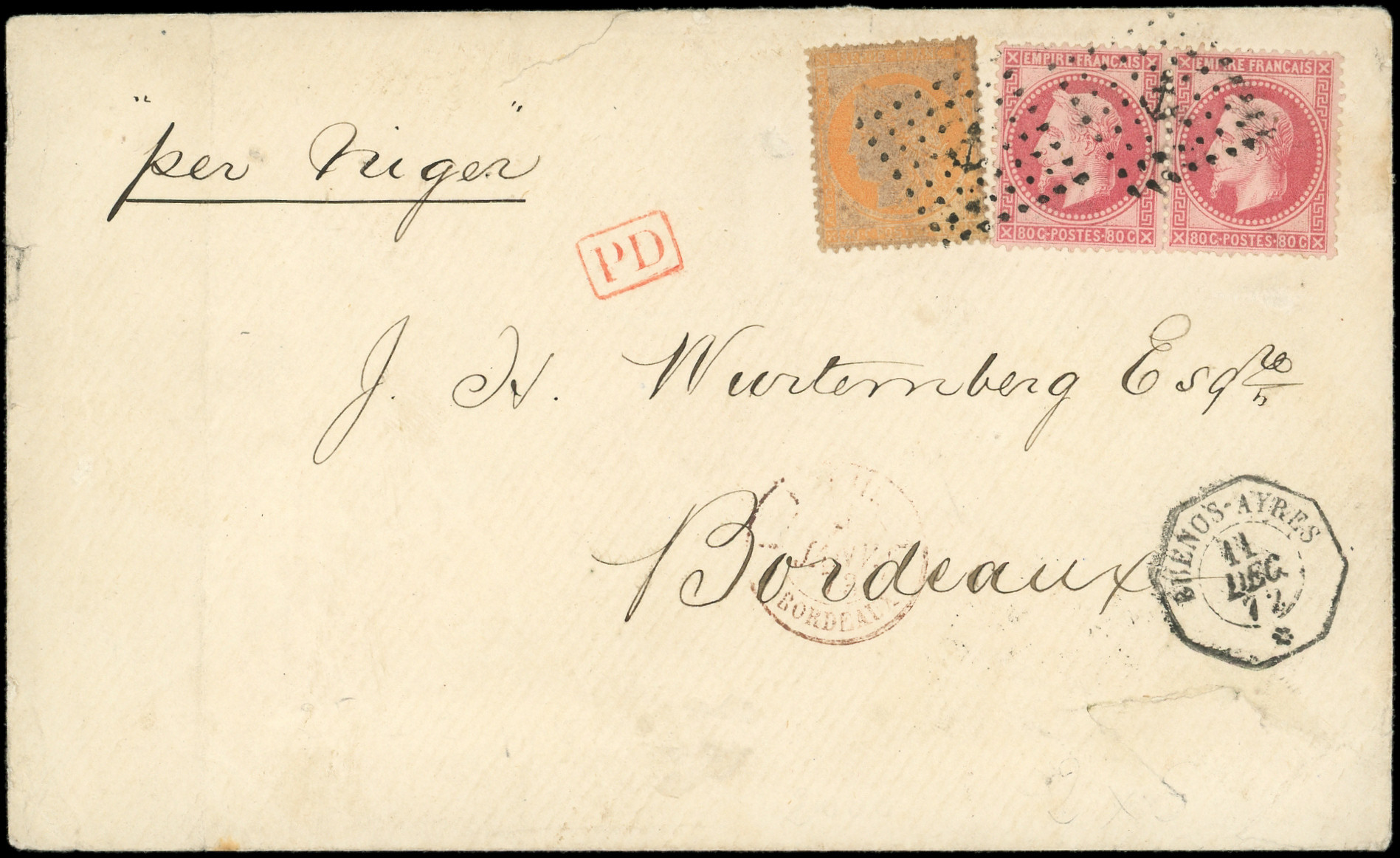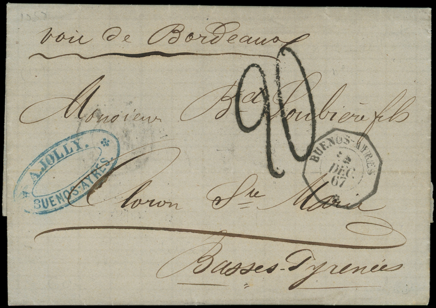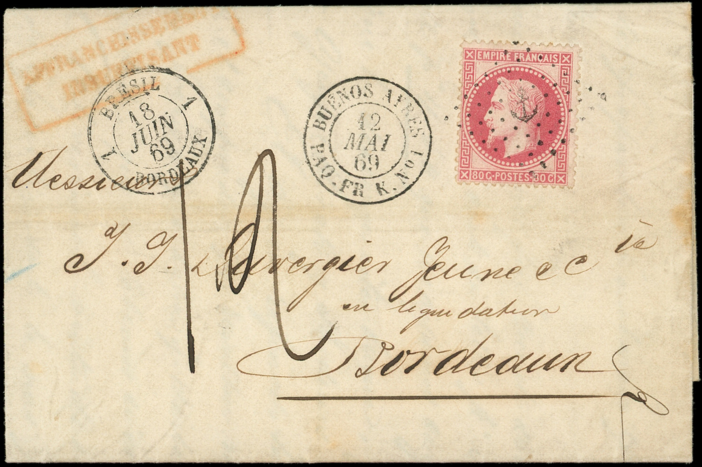 s. LAC, càd BUENOS AYRES PAQ. FR. K. N°1 12/5/69, càd 1 BRESIL 1 BORDEAUX 18/6, griffe "affrt insuff." et Taxe 12, Superbe (Image) (Image2)