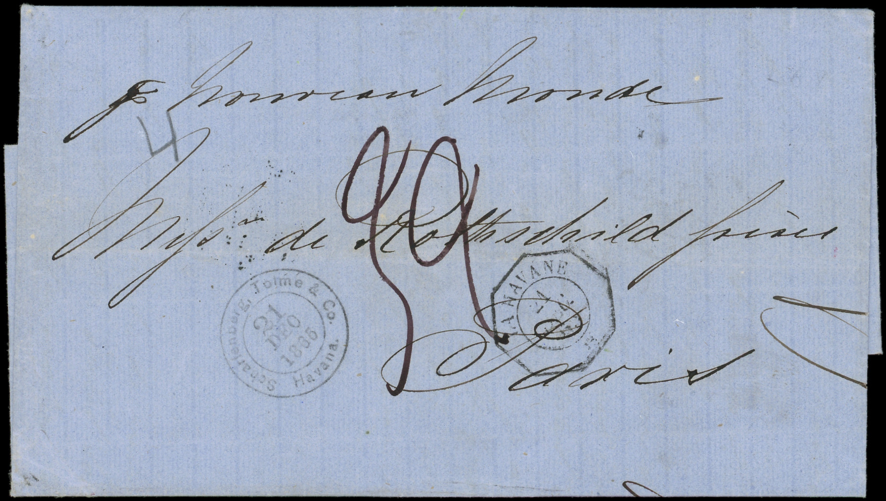 HAVANE 21/12/65 s. LAC du 18/12, Taxe 32 pour QUADRUPLE port, arr. Paris 13/1, au verso càd Octog. HAVANE PAQ. FR. B N°4 21/12, TTB (Image) (Image2)