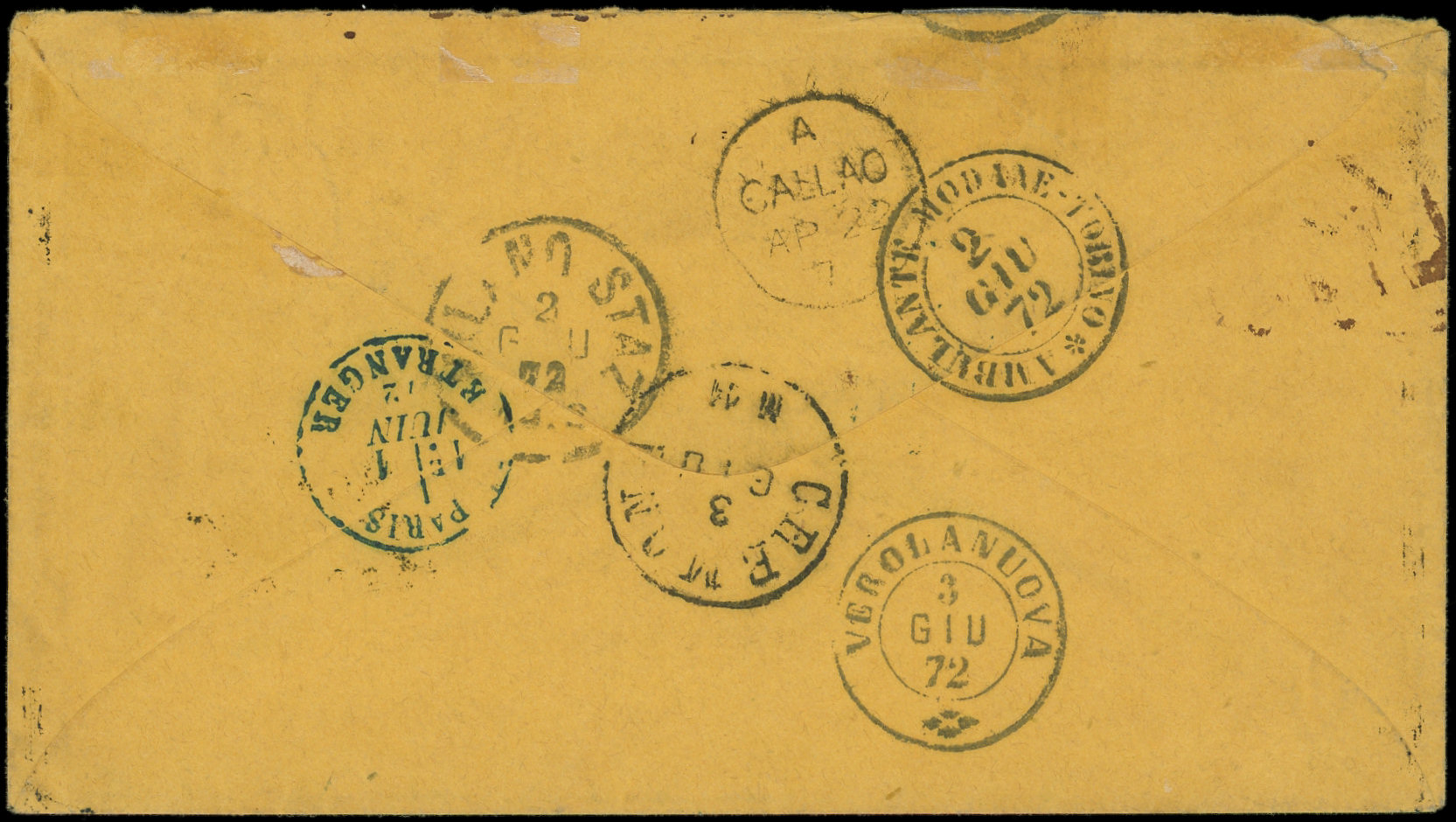 vert jaune obl. càd LIMA 21/4/72 s. Env., au verso càd CALLAO 22/4, au recto càd PANAMA TRANSIT 29/4, càd Escale PANAMA PAQ. FR. A N°1 2/5/72, marque F58, Taxe italienne 1l40 par 60c. + 40c. x 2 obl. càd VEROLANUOVA 3/6/72, TB (Image) (Image2)