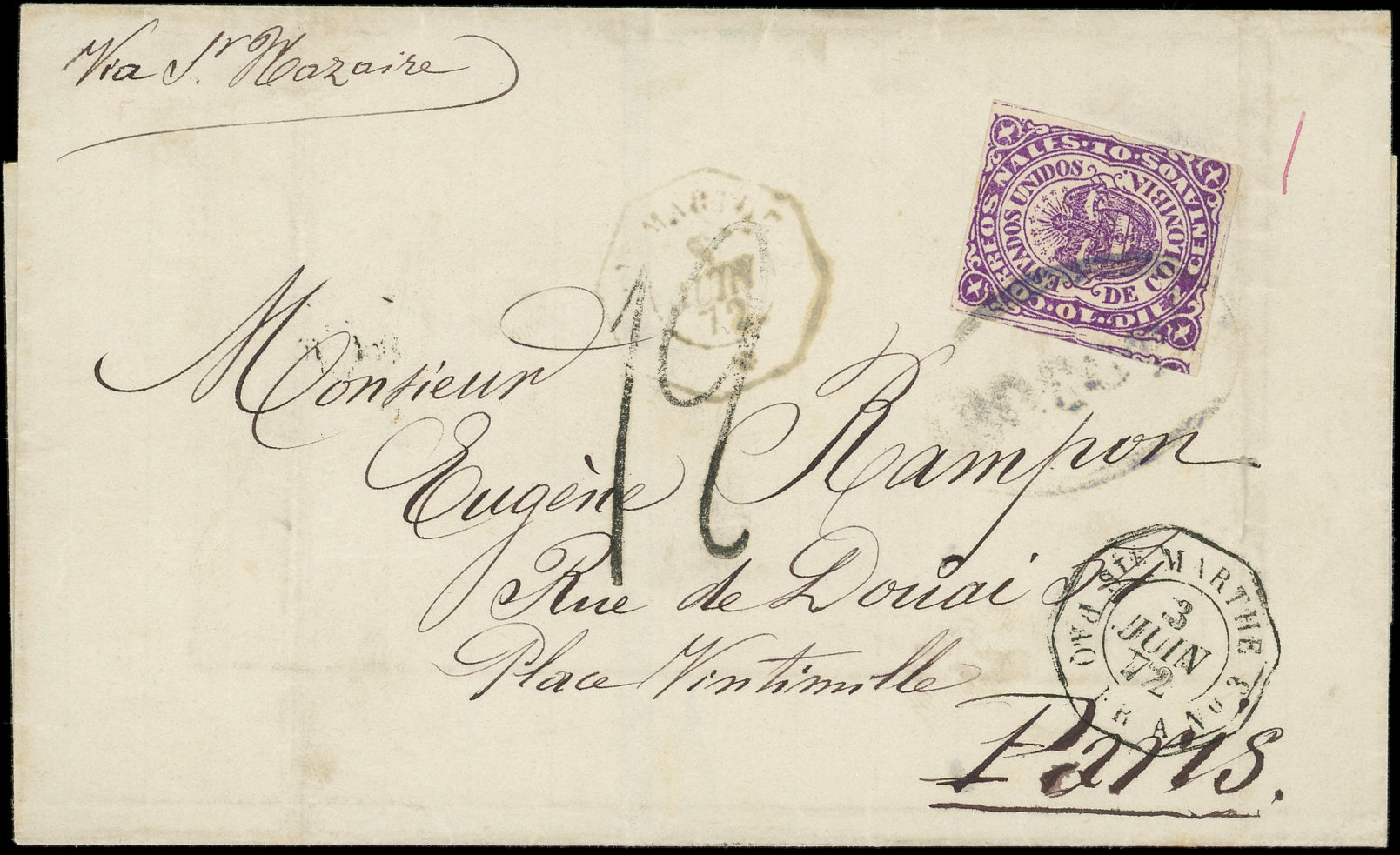 10c. lilas obl. ovale BOGOTA pour le port intérieur jusqu'à l'agence s. LSC, càd Octog. Ste MARTHE 3/6/72 puis ligne Française, càd d'Escale Ste MARTHE PAQ. FR. A N°3 3/6/72, Taxe 12, tarif du 1/7/71, arrivée PARIS 26/6/72, TB (Image) (Image2)