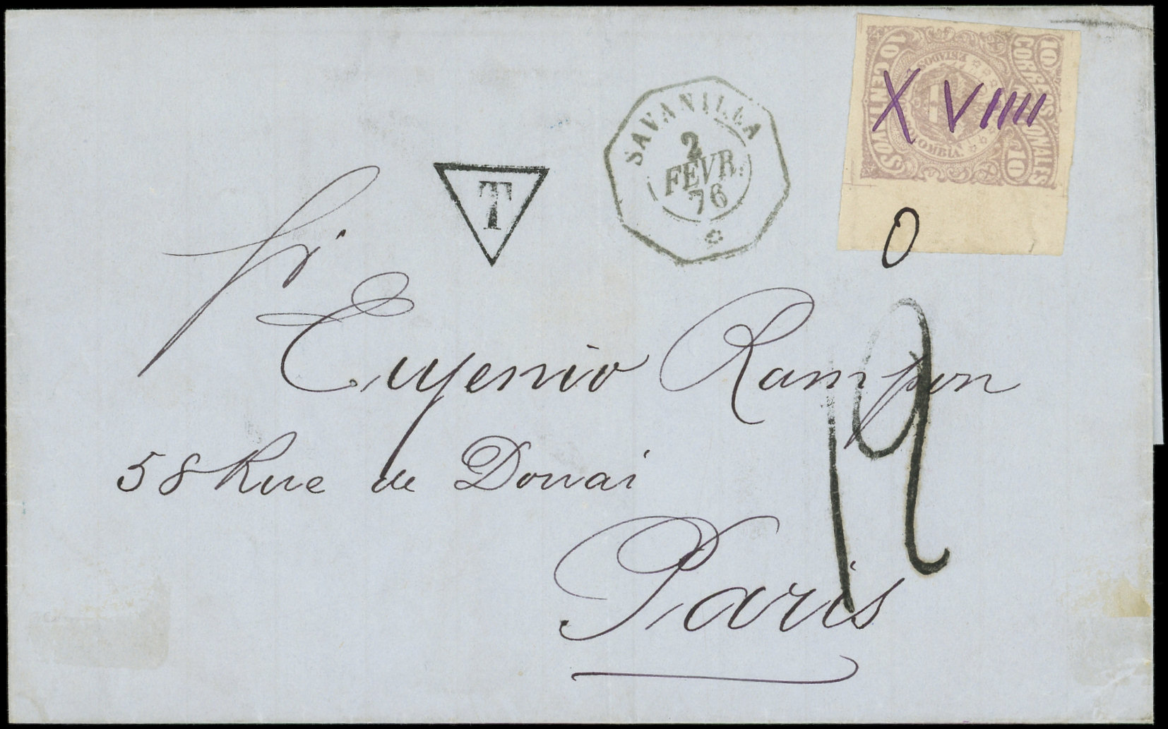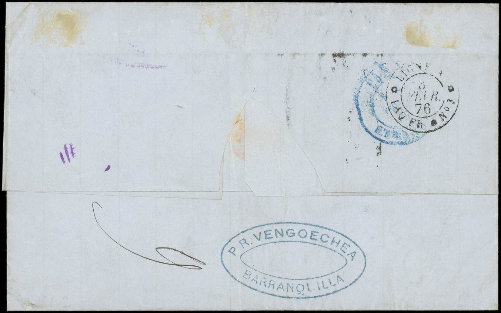 BARRANQUILLA avec timbre de Colombie considéré comme nul, remise au bureau de SAVANILLA càd 2/2/76, Taxe 12. Au verso càd LIGNE A PAQ. FR. N°3 3/2/76 et càd PARIS ETRANGER, TB