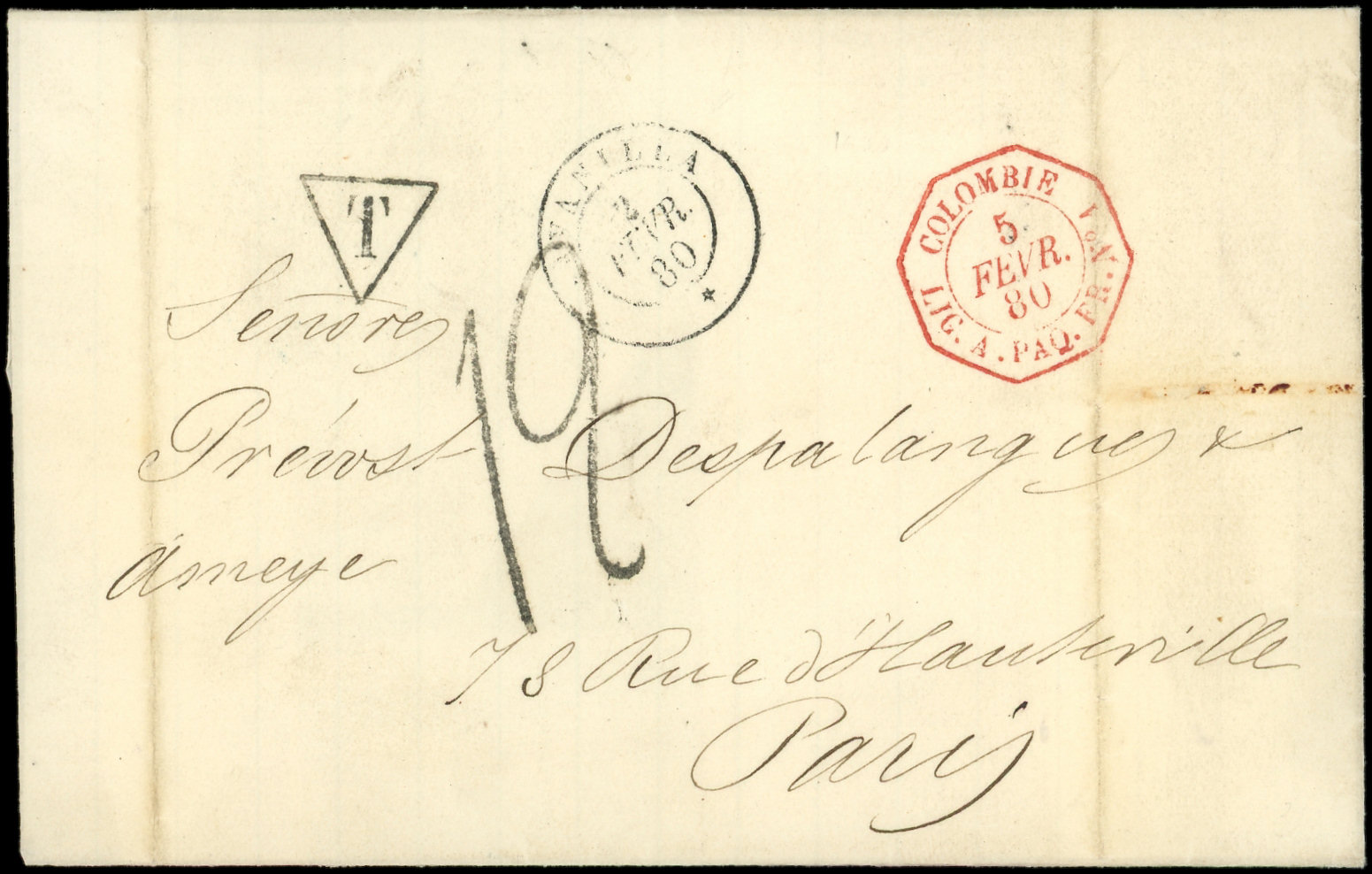 17/1/80 acheminée jusqu'à SAVANILLA càd 2/2/80, càd rouge d'escale COLOMBIE LIG. A. PAQ. FR. N°1 5/2/80, premier jour du càd d'escale COLOMBIE, Taxe 12, arr. PARIS 27/2/80, TB