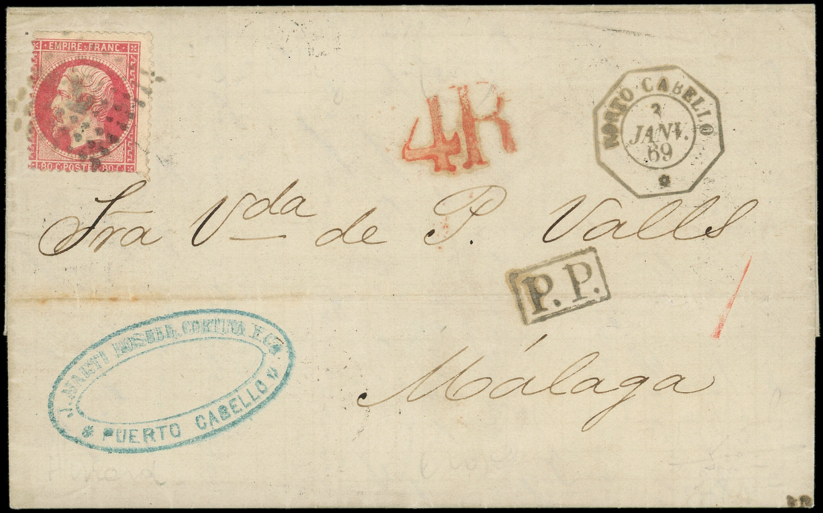 s. LAC, càd Octog. PORTO CABELLO 3/1/69, Taxe Espagnole 4R et arr. MALAGA 23/1, TTB (Image)