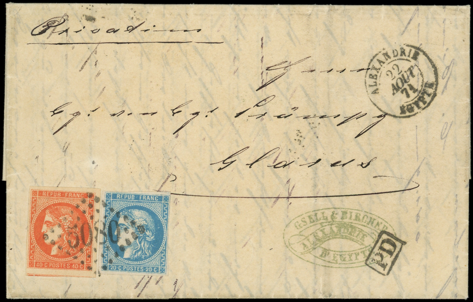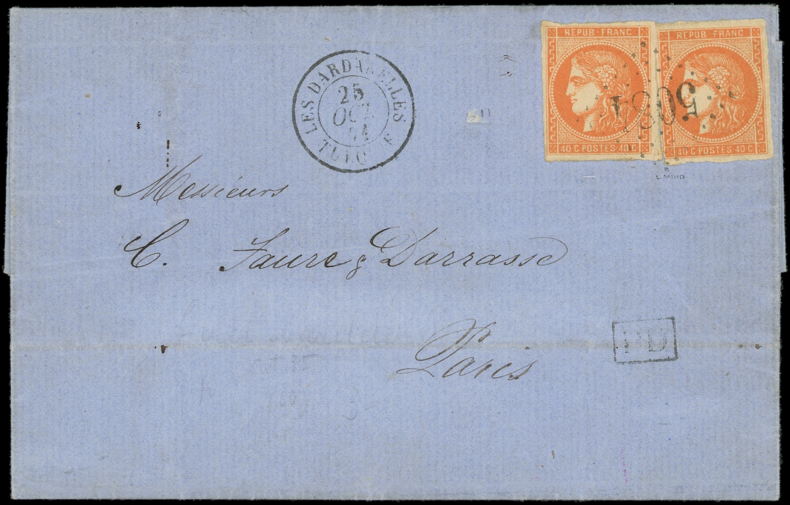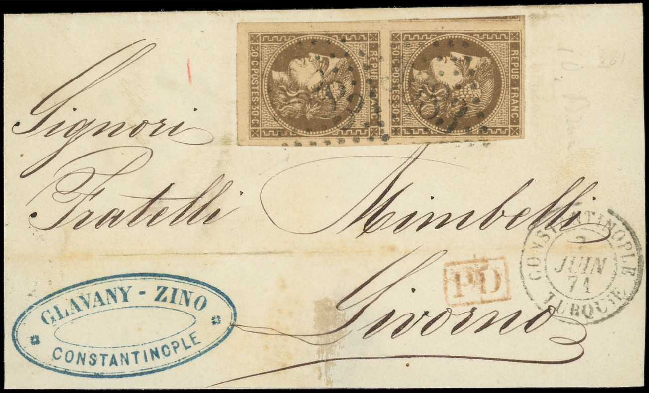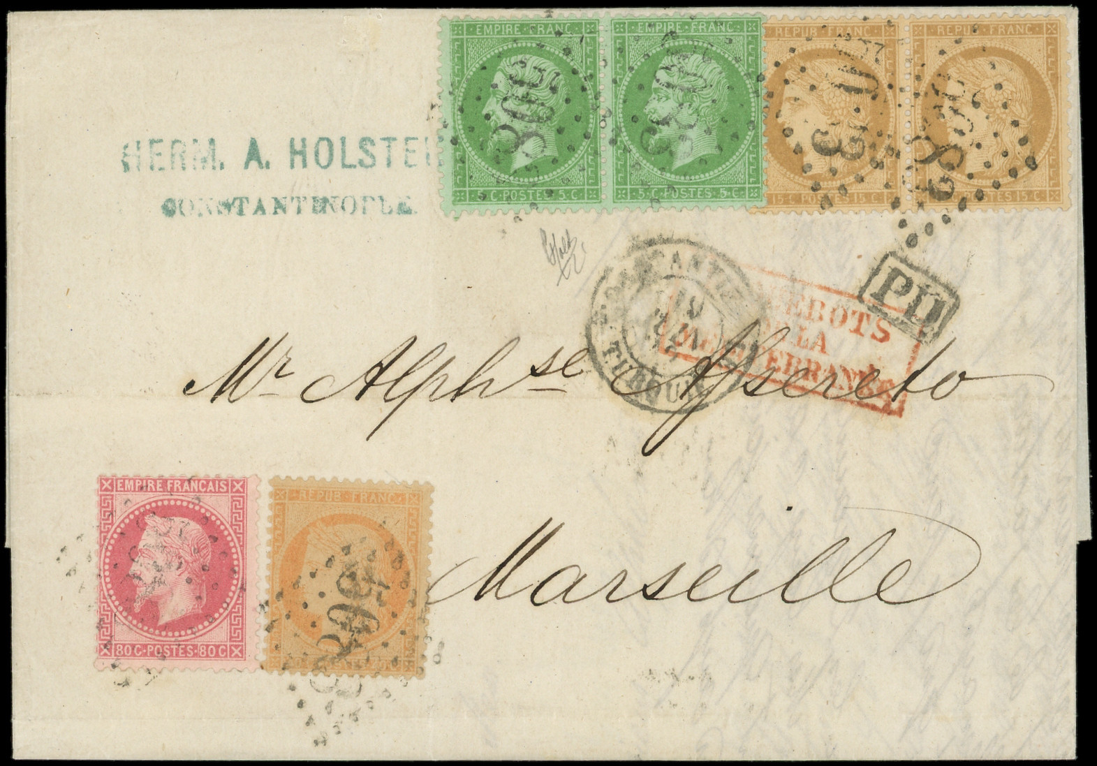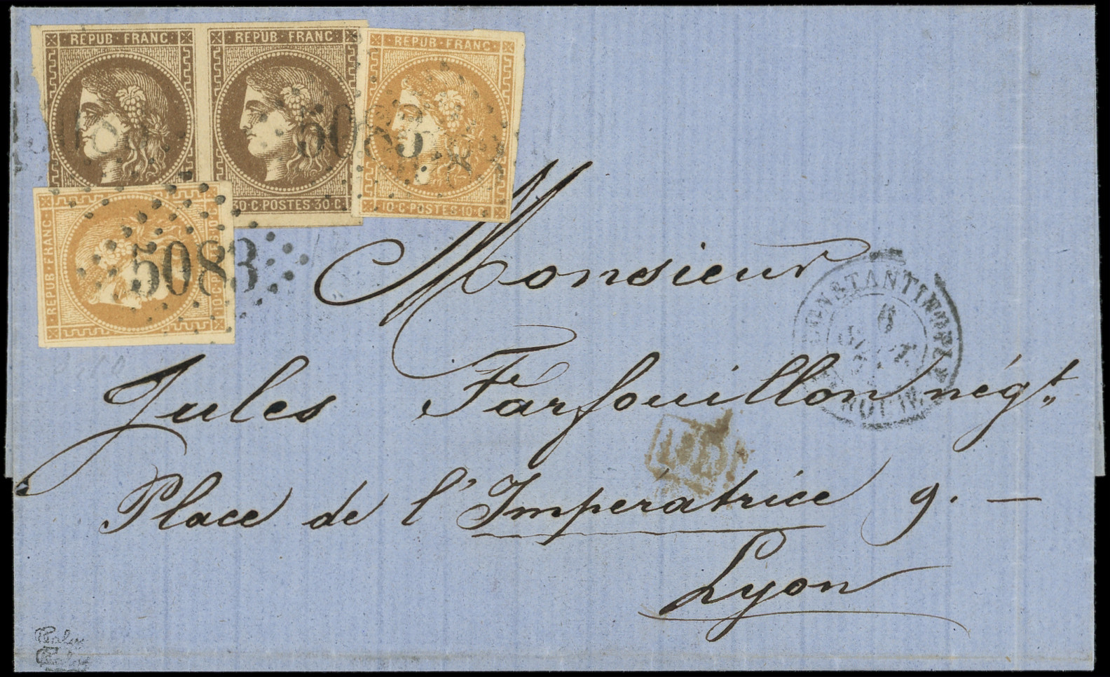 l'un effl.) et N°47 PAIRE (1 t. touché) obl. GC 5083 s. LSC, càd CONSTANTINOPLE 6/9/71, arr. Lyon, affrt RR et très plaisant (Image) (Image2)