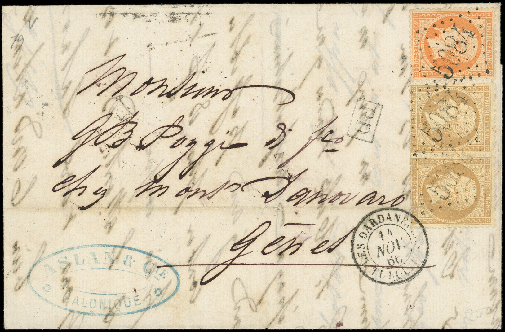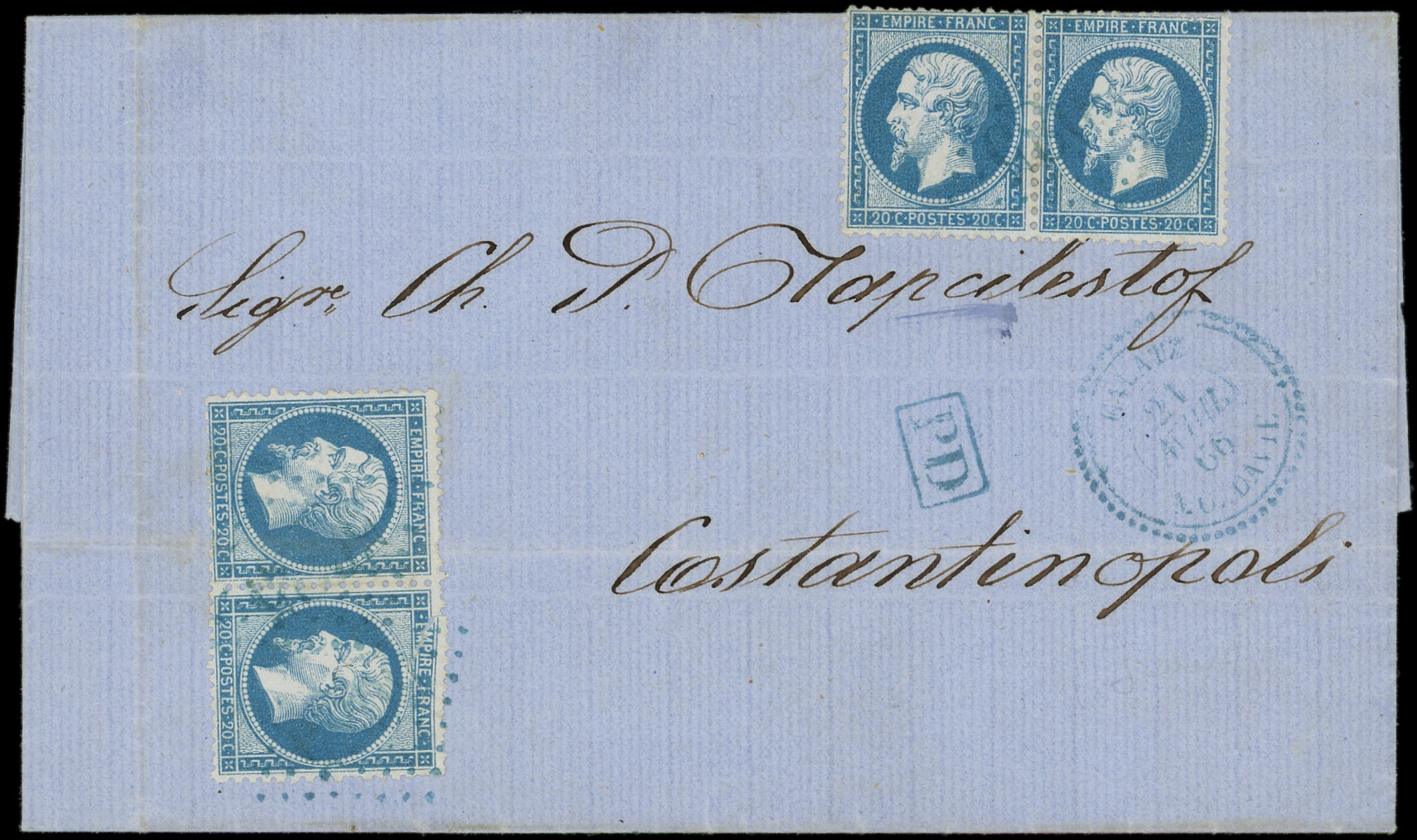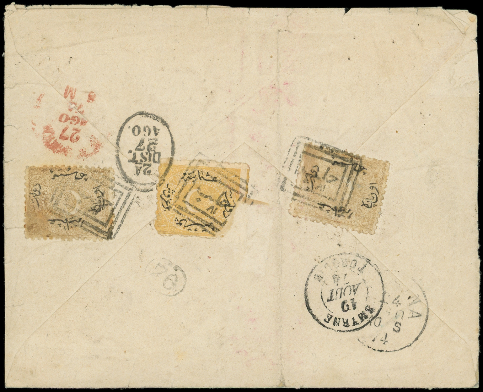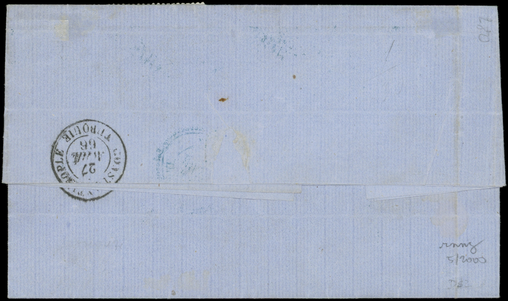 t. pli d'archive) obl. GC 5085 s. LAC, càd GALATZ MOLDAVIE 21/4/66, arr. CONSTANTINOPLE 27/4, TTB (Image) (Image2)