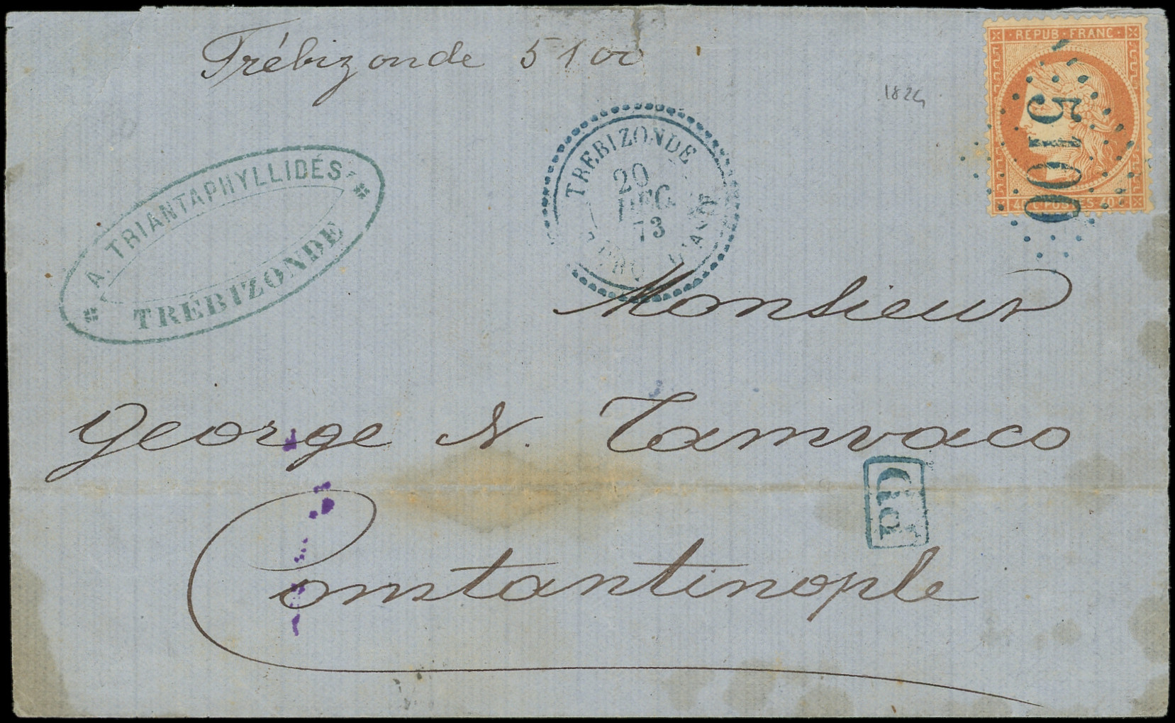 s. LSC, càd TREBIZONDE 20/12/73, le tout en BLEU, arr. CONSTANTINOPLE, TTB (Image)