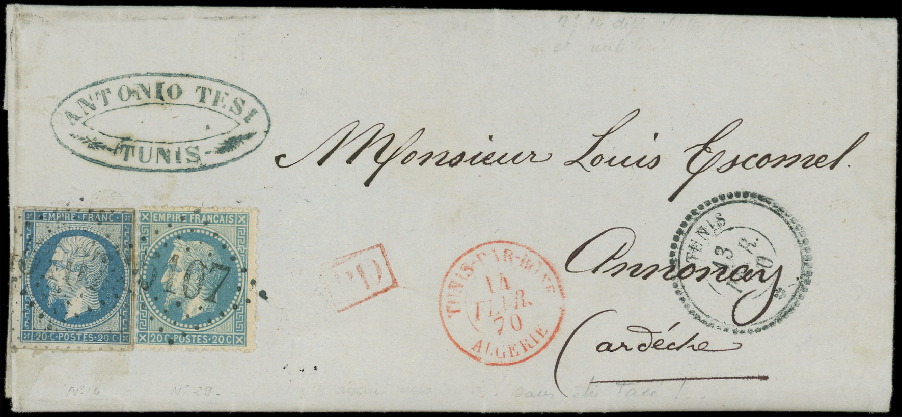 GC 5107 s. LAC, càd TUNIS 13/2/70, càd rouge TUNIS PAR BONE ALGERIE 14/2/70 et arr. ANNONAY 19/12, combinaison RR, TB (Image) (Image2)