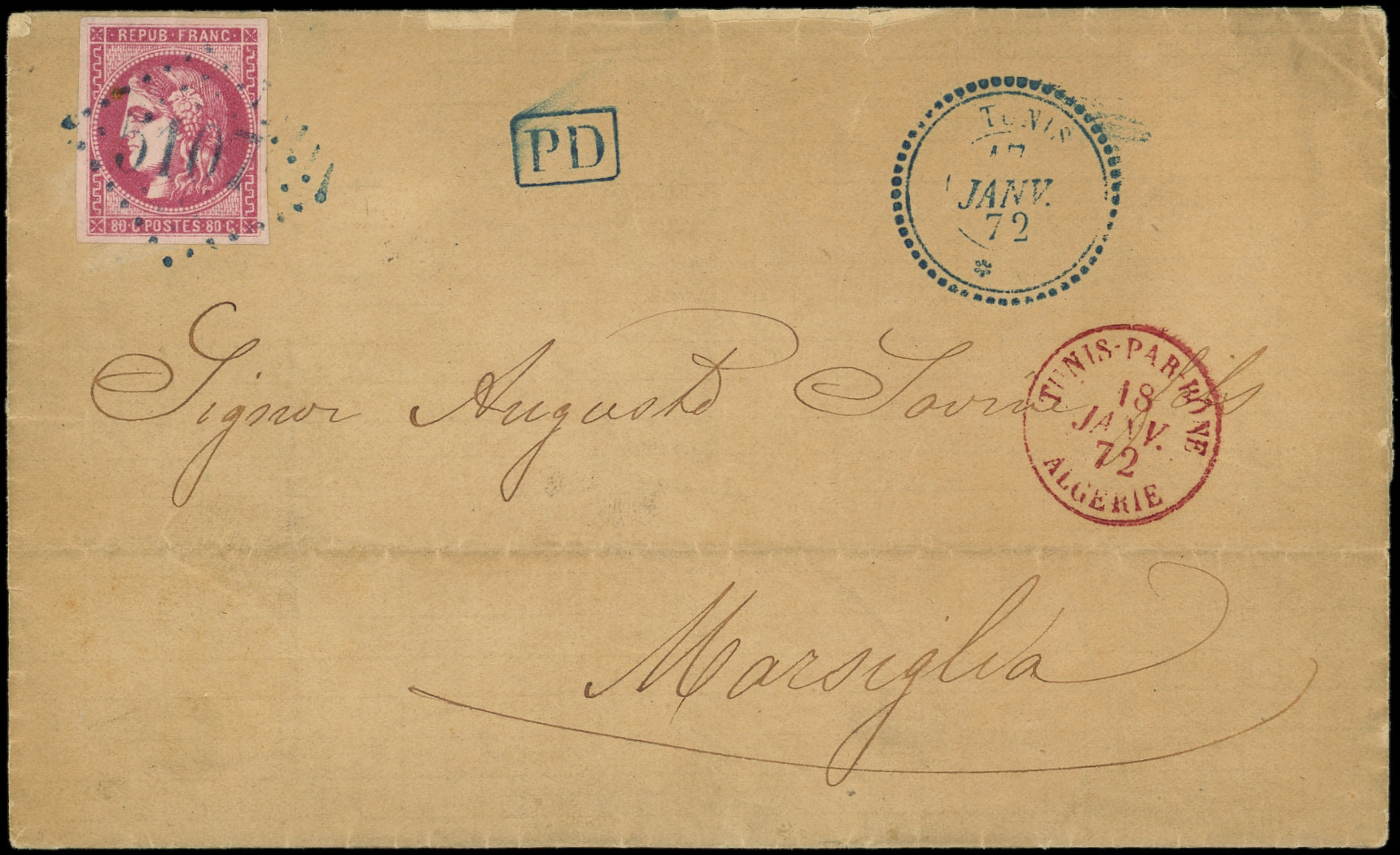 nuance vive, obl. GC 5107 s. LAC, càd TUNIS 17/1/72 et càd rouge TUNIS-PAR BONE ALGERIE 18/1, arr. Marseille, Superbe (Image) (Image2)