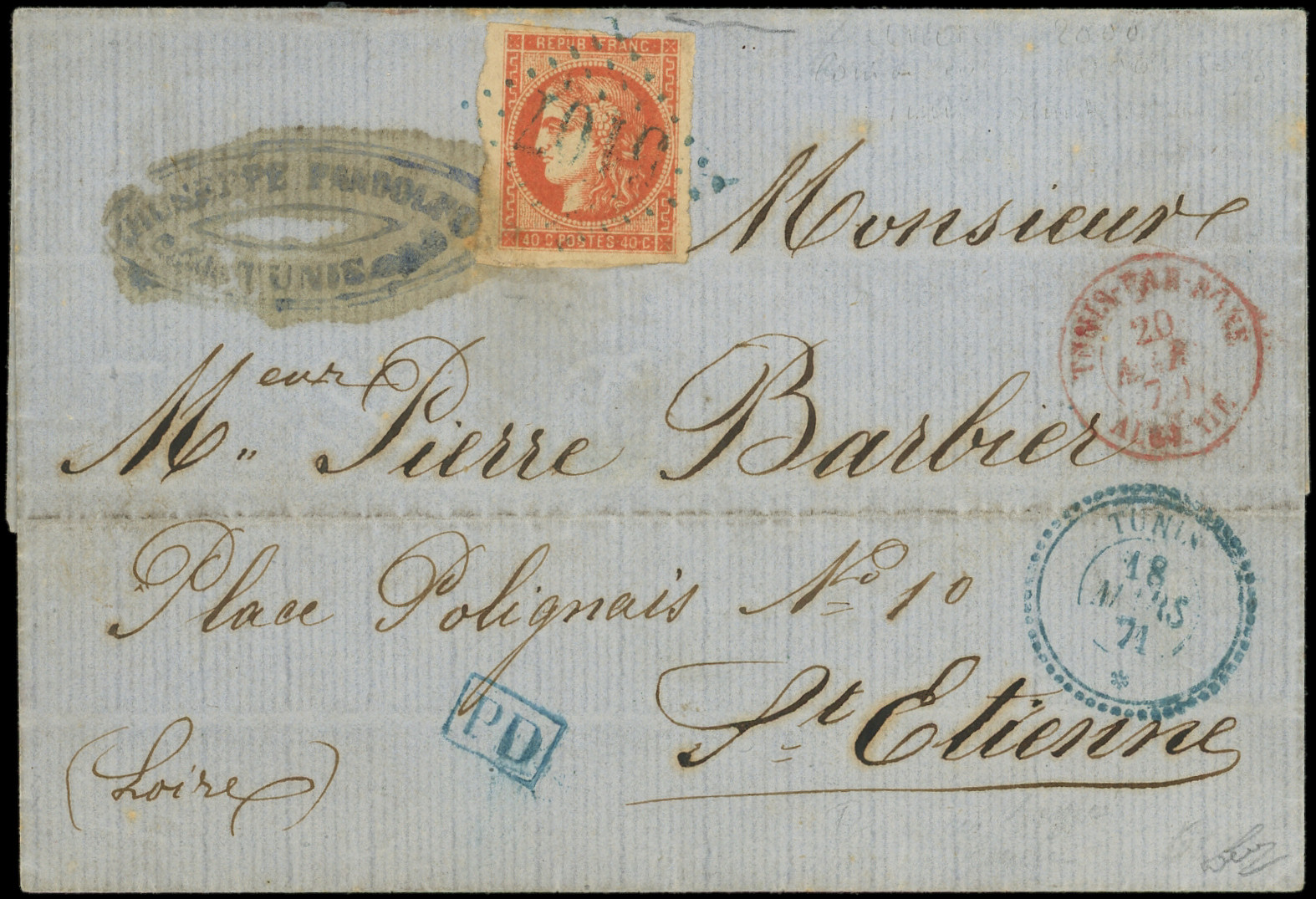 ROUGE-SANG obl. GC 5107 s. LSC, càd TUNIS 18/3/71, le tout en bleu, càd TUNIS PAR BONE ALGERIE 20/3, arr. St Etienne 25/3, Superbe (Image) (Image2)