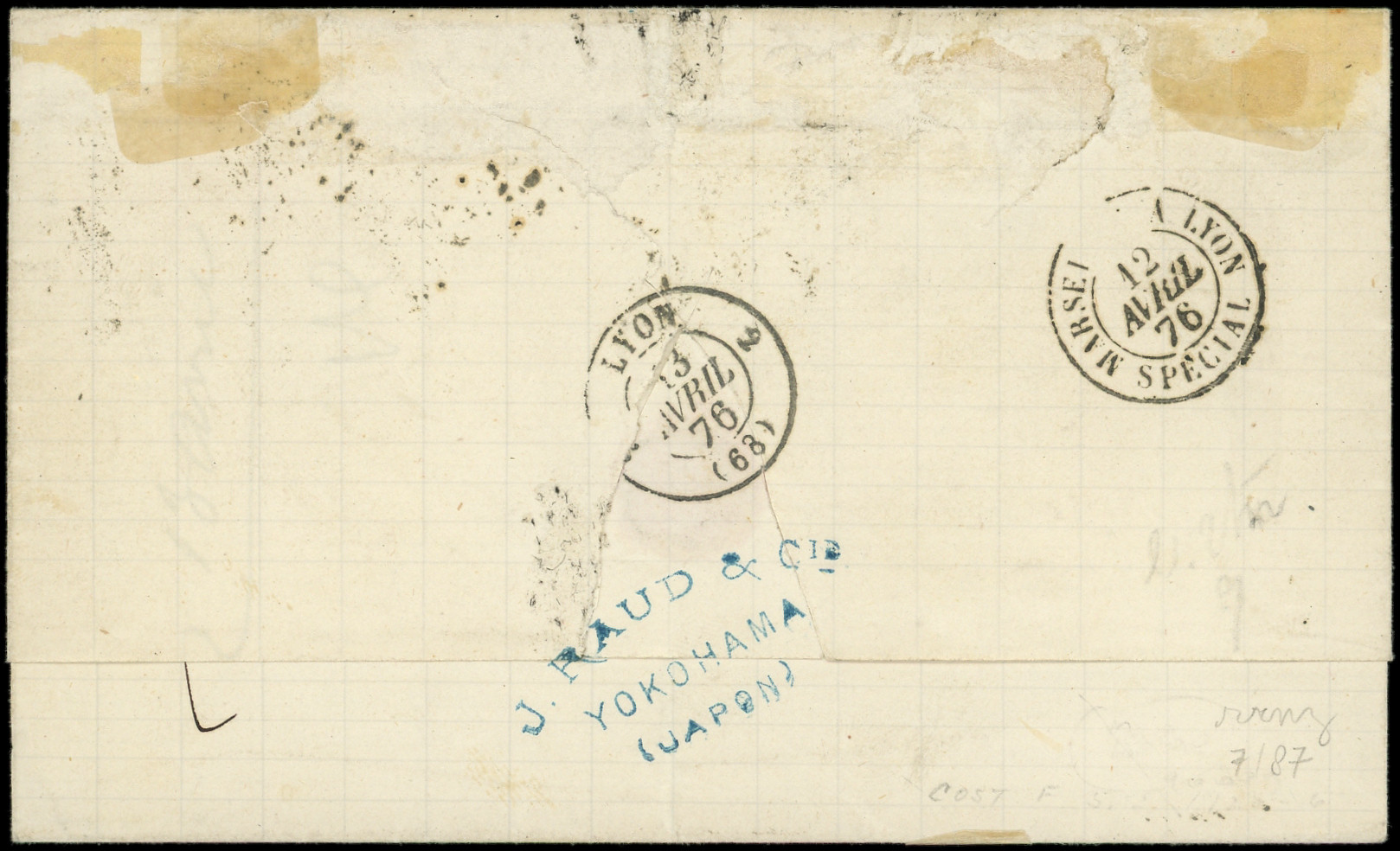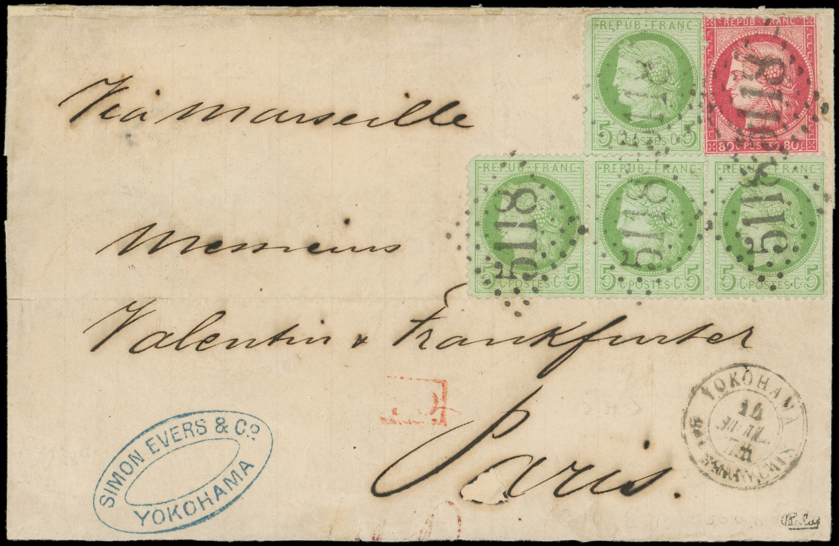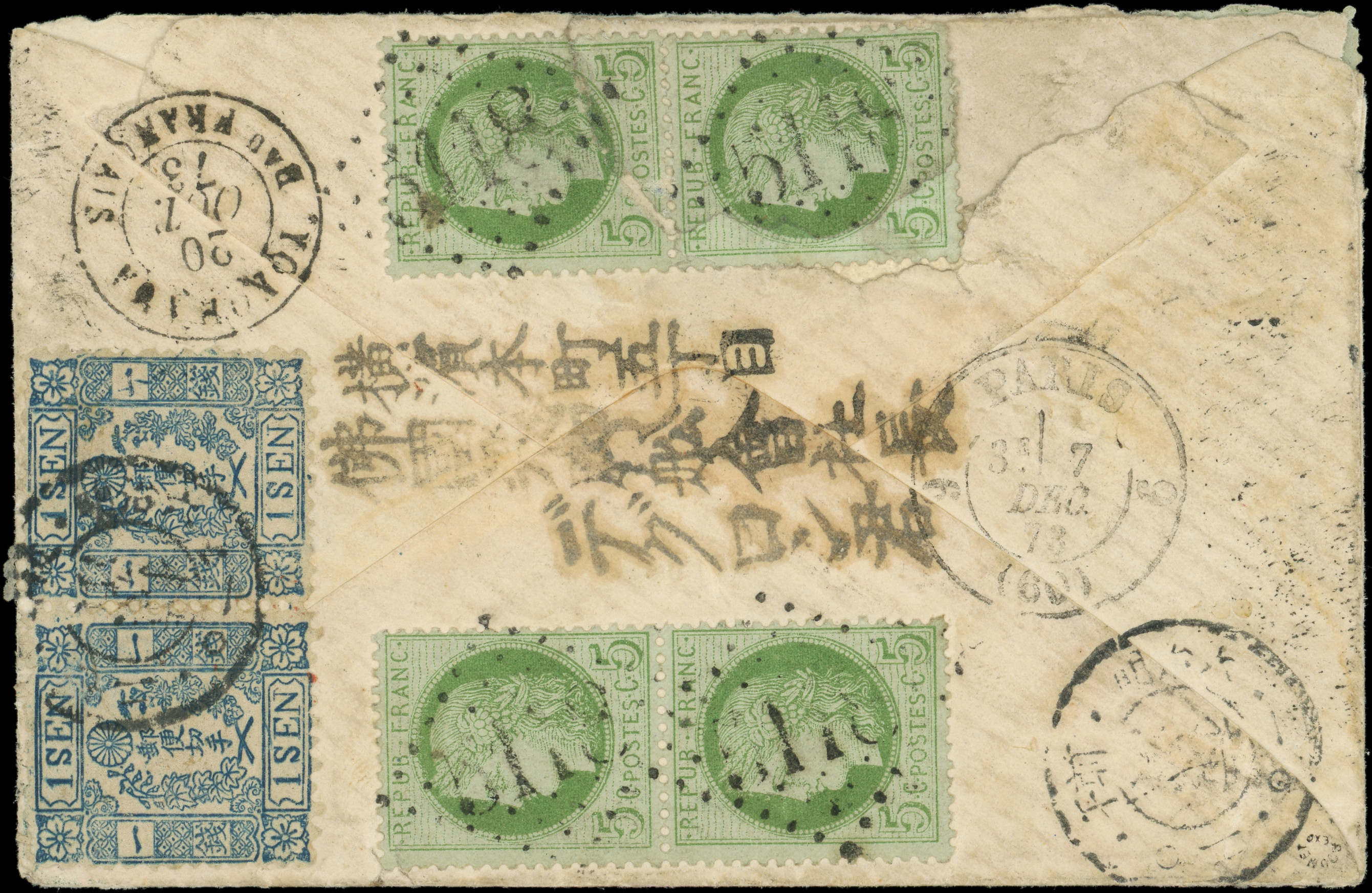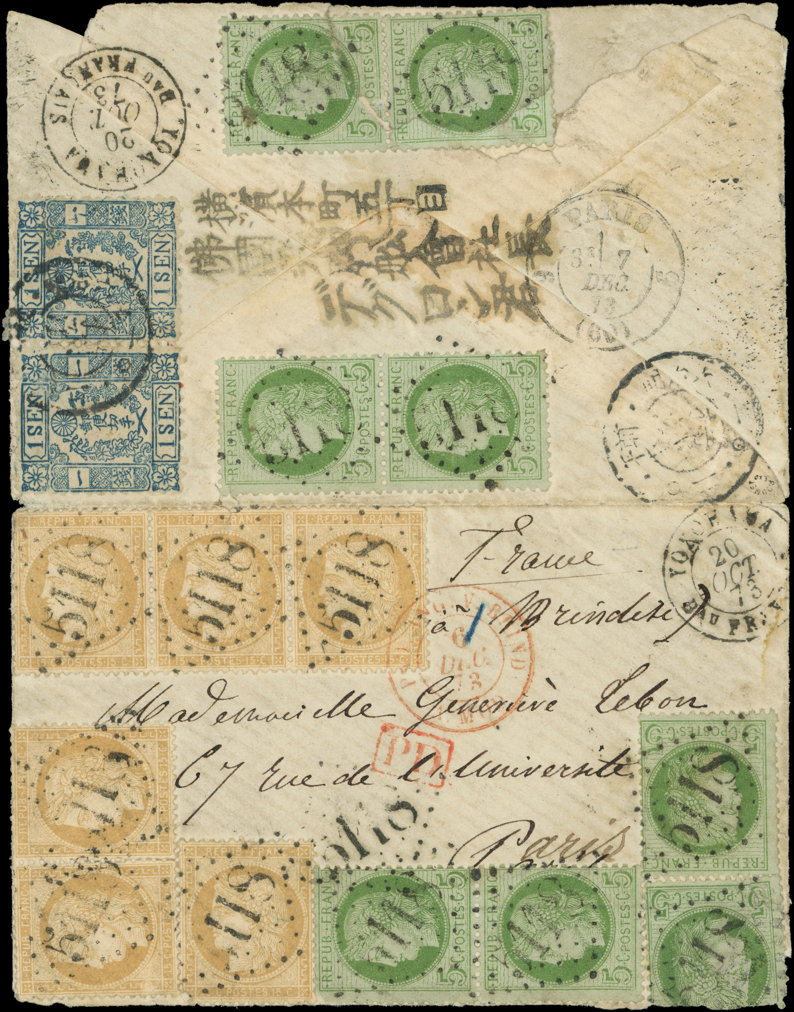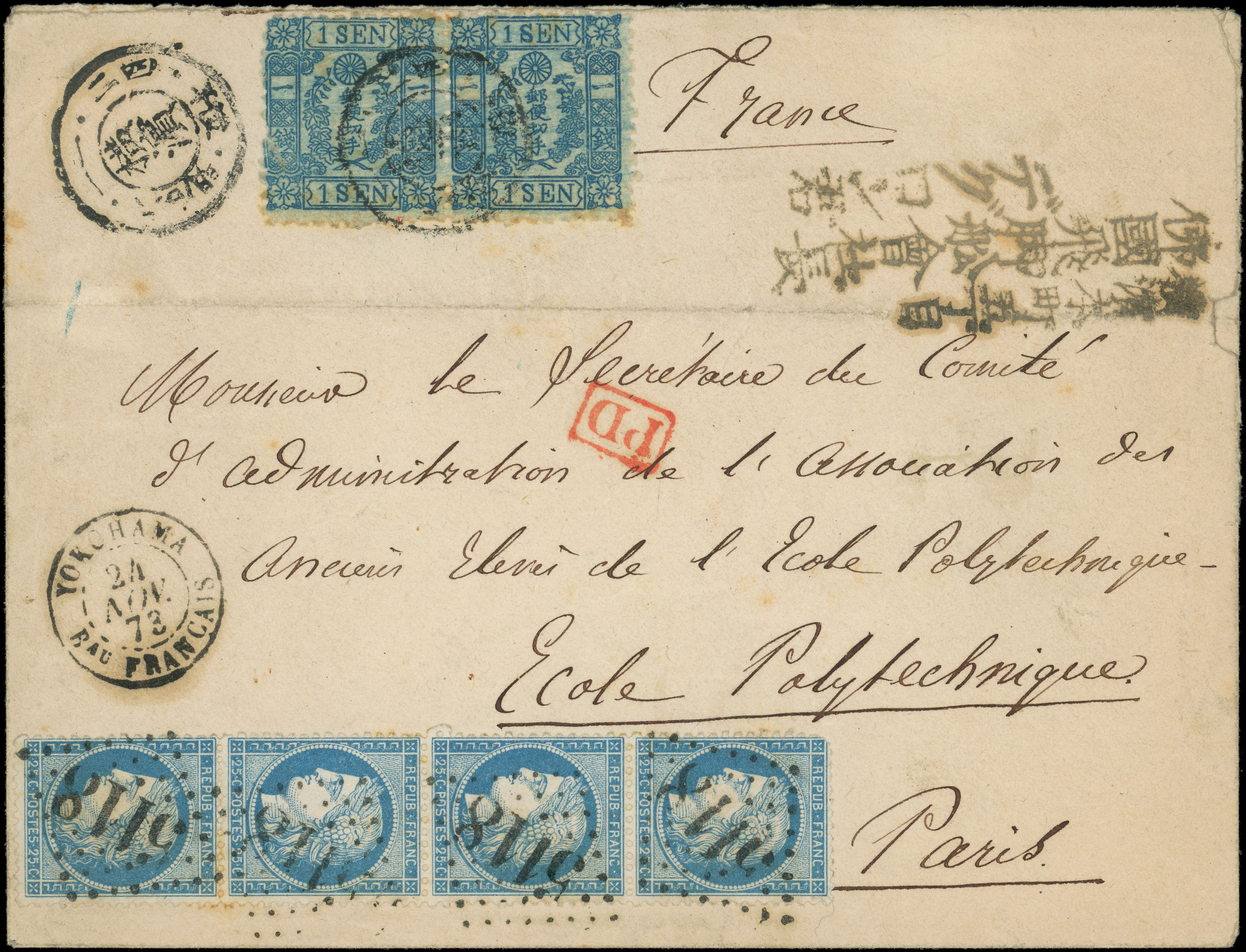 N°59 BANDE de 3, PAIRE et unité, obl. GC 5118 s. Env., MIXTES avec PAIRE 1s. bleu du JAPON, càd YOKOHAMA Bau FRANCAIS 20/10/73, arr. Paris 7/12, combinaison UNIQUE, qqs défauts bien sûr mais néanmoins très plaisant (Image) (Image2)