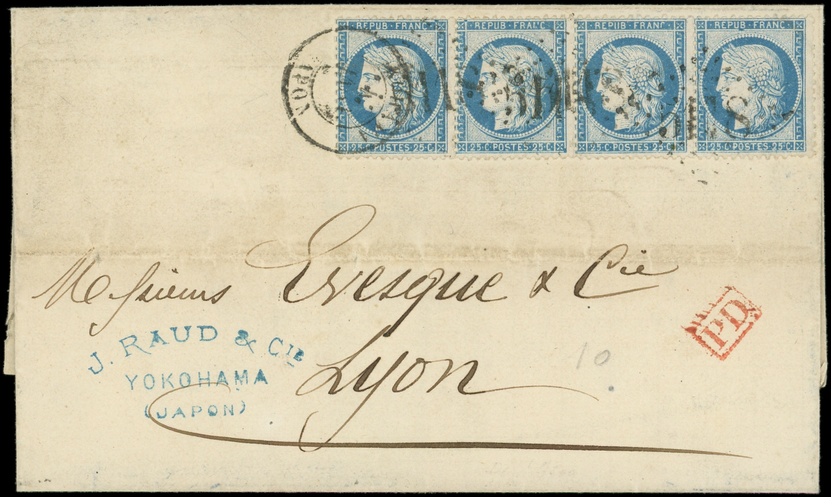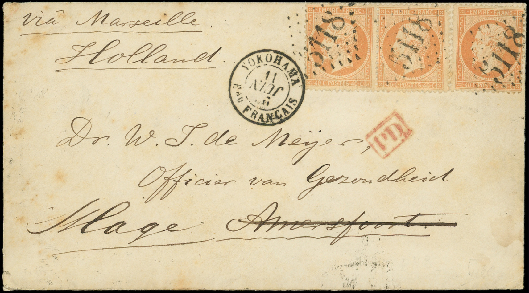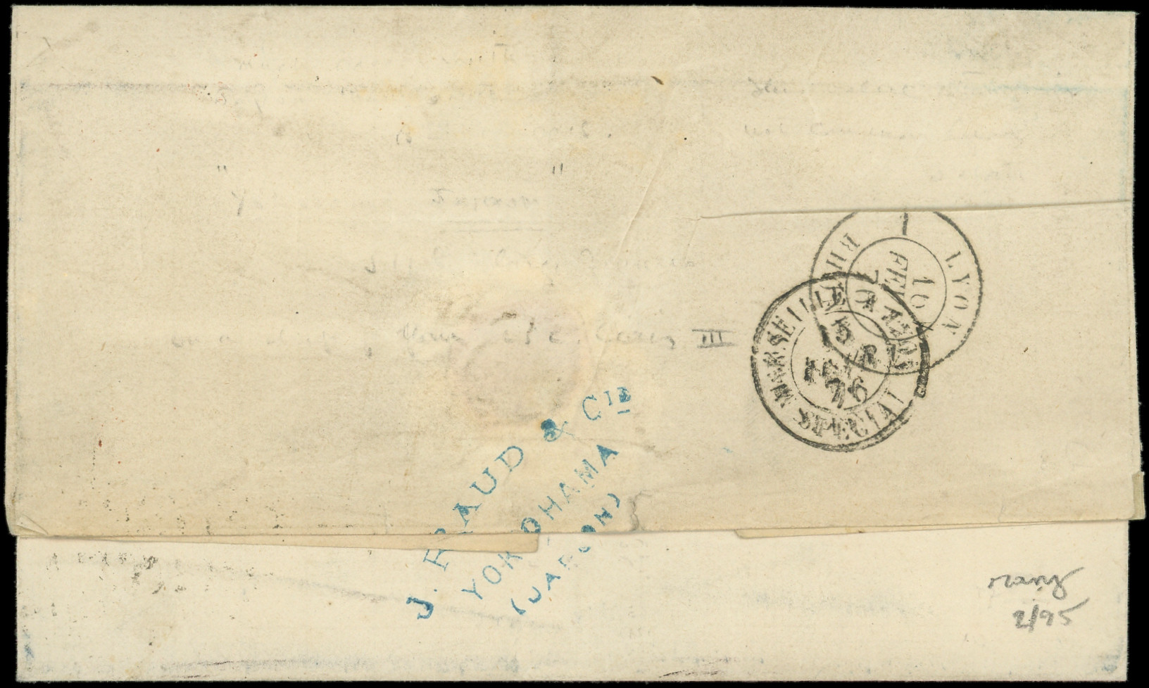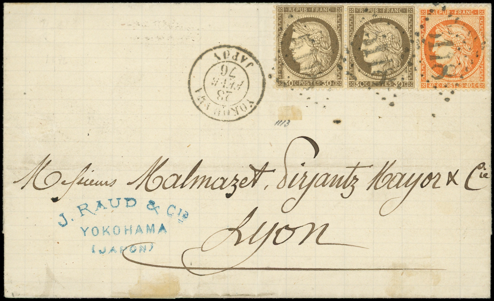 N°59 BANDE de 3, PAIRE et unité, obl. GC 5118 s. Env., MIXTES avec PAIRE 1s. bleu du JAPON, càd YOKOHAMA Bau FRANCAIS 20/10/73, arr. Paris 7/12, combinaison UNIQUE, qqs défauts bien sûr mais néanmoins très plaisant (Image) (Image2)