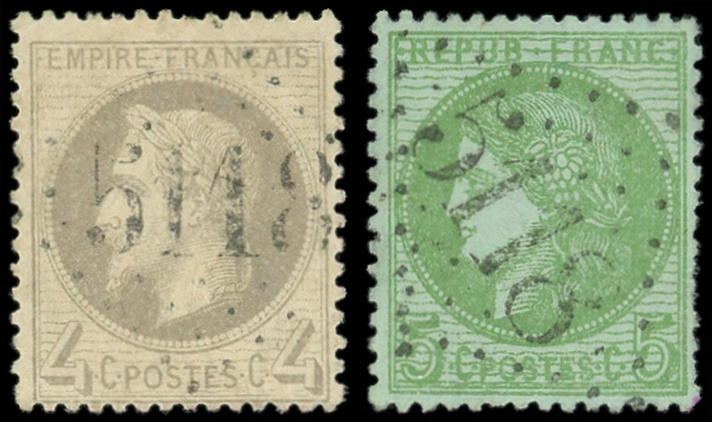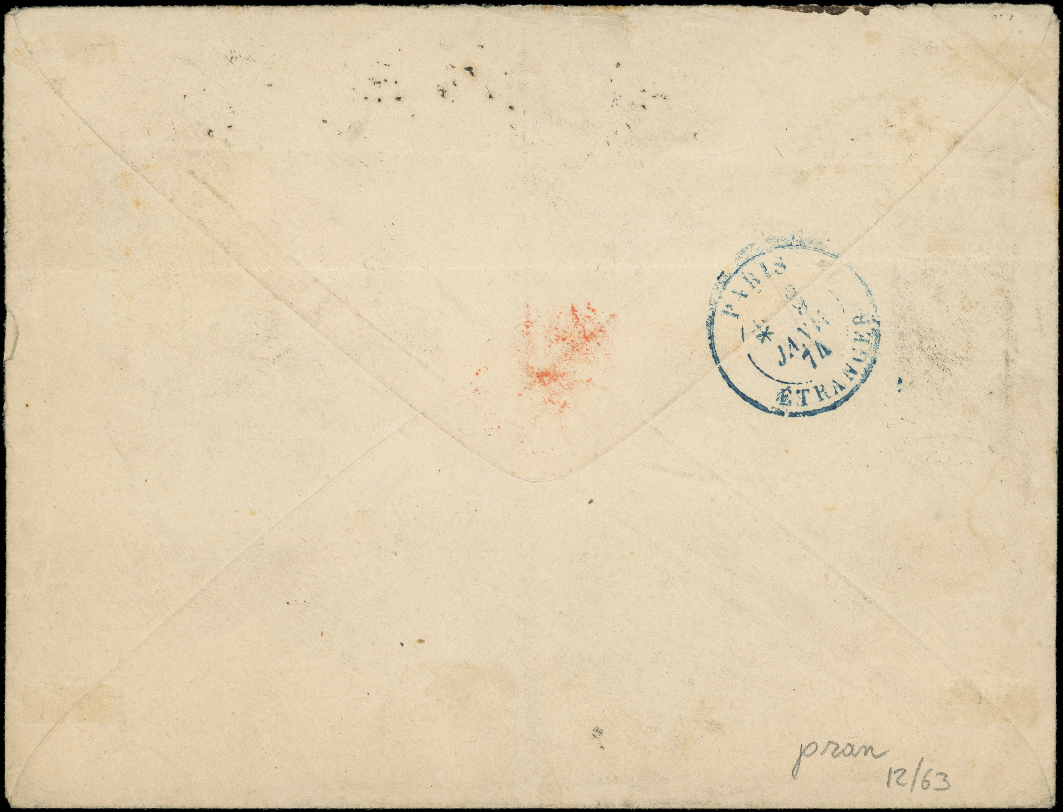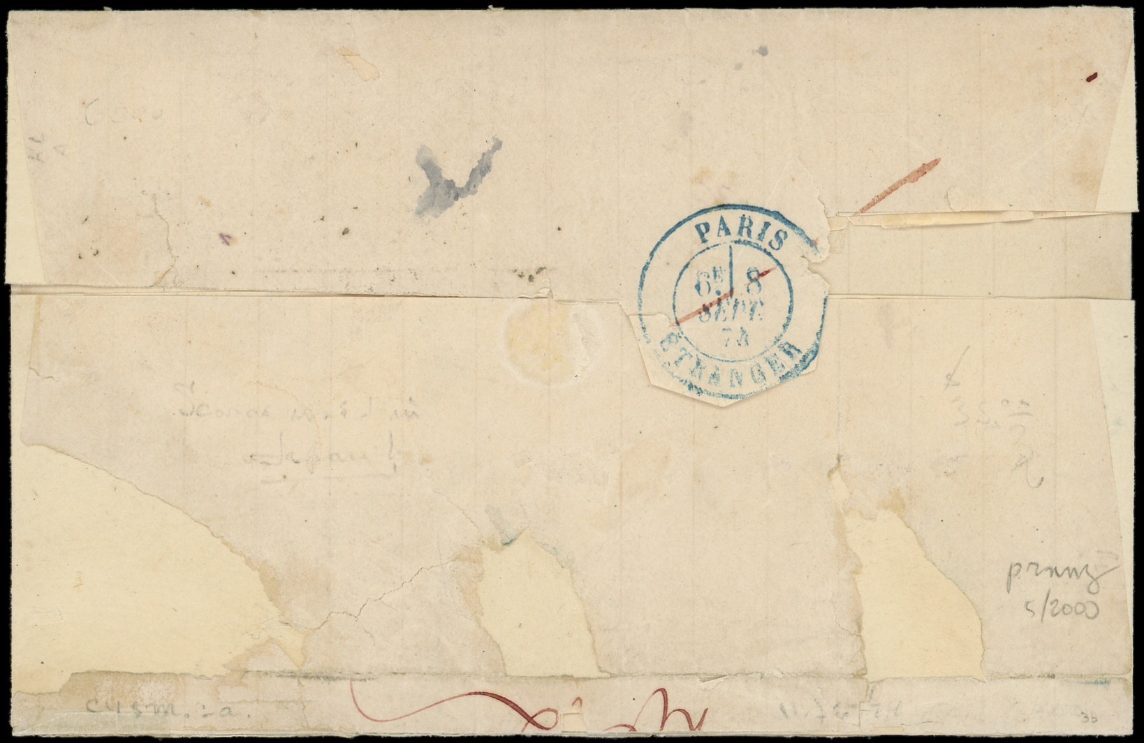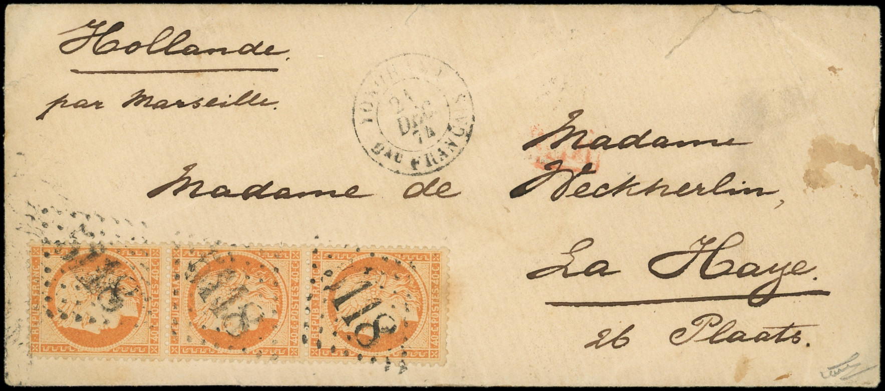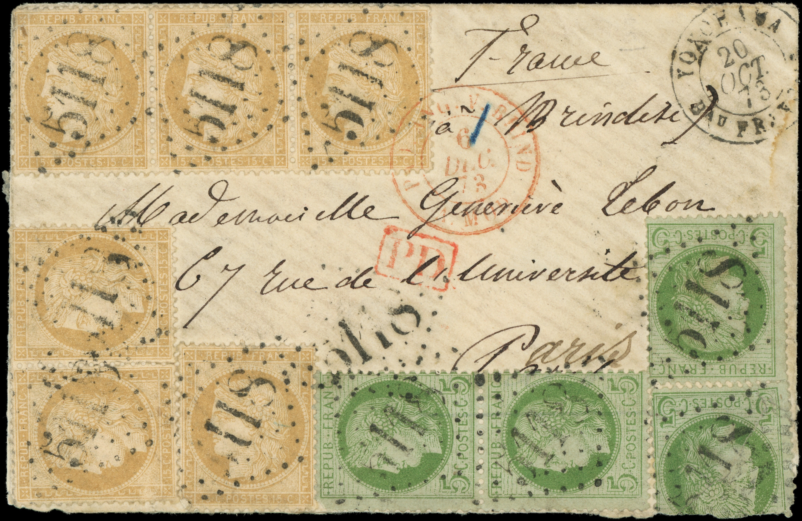N°59 BANDE de 3, PAIRE et unité, obl. GC 5118 s. Env., MIXTES avec PAIRE 1s. bleu du JAPON, càd YOKOHAMA Bau FRANCAIS 20/10/73, arr. Paris 7/12, combinaison UNIQUE, qqs défauts bien sûr mais néanmoins très plaisant (Image) (Image2)