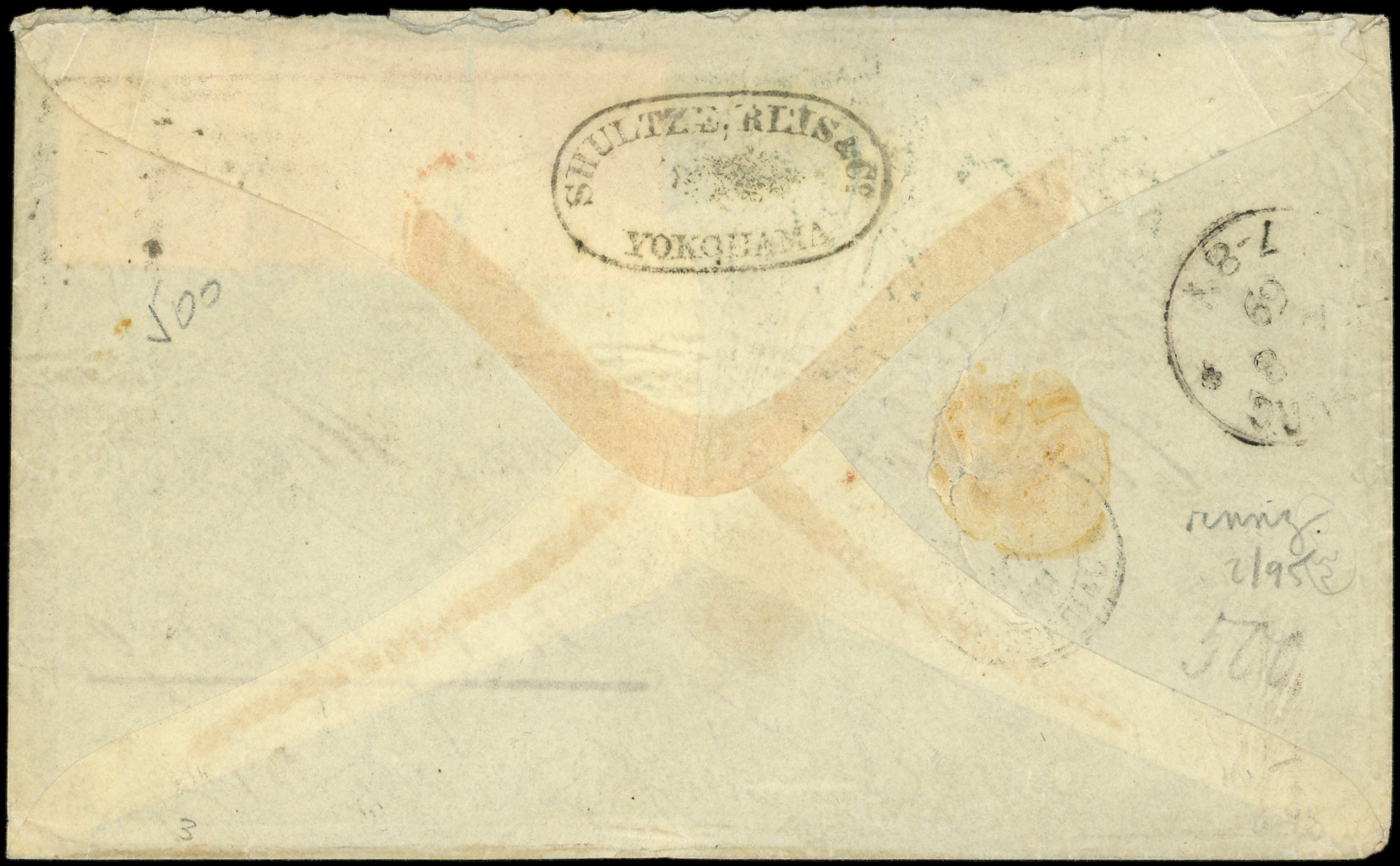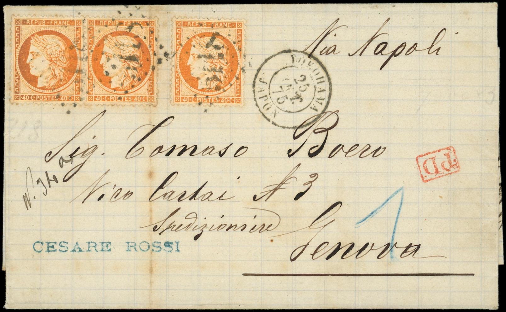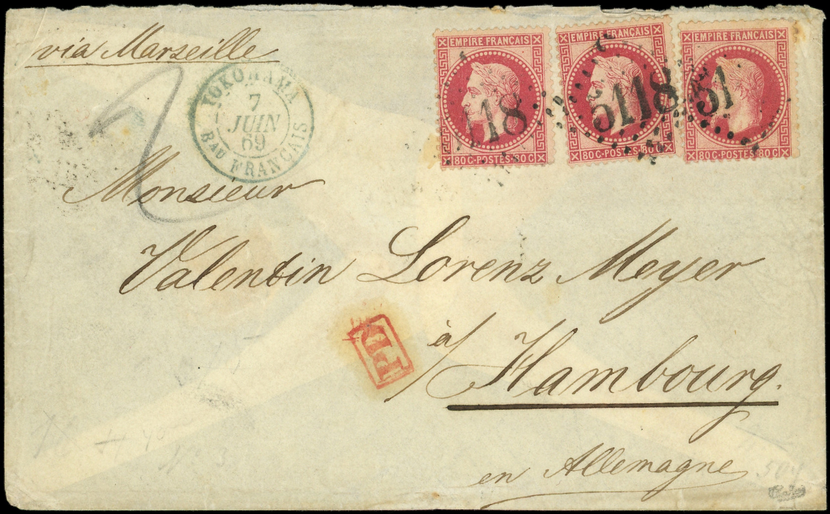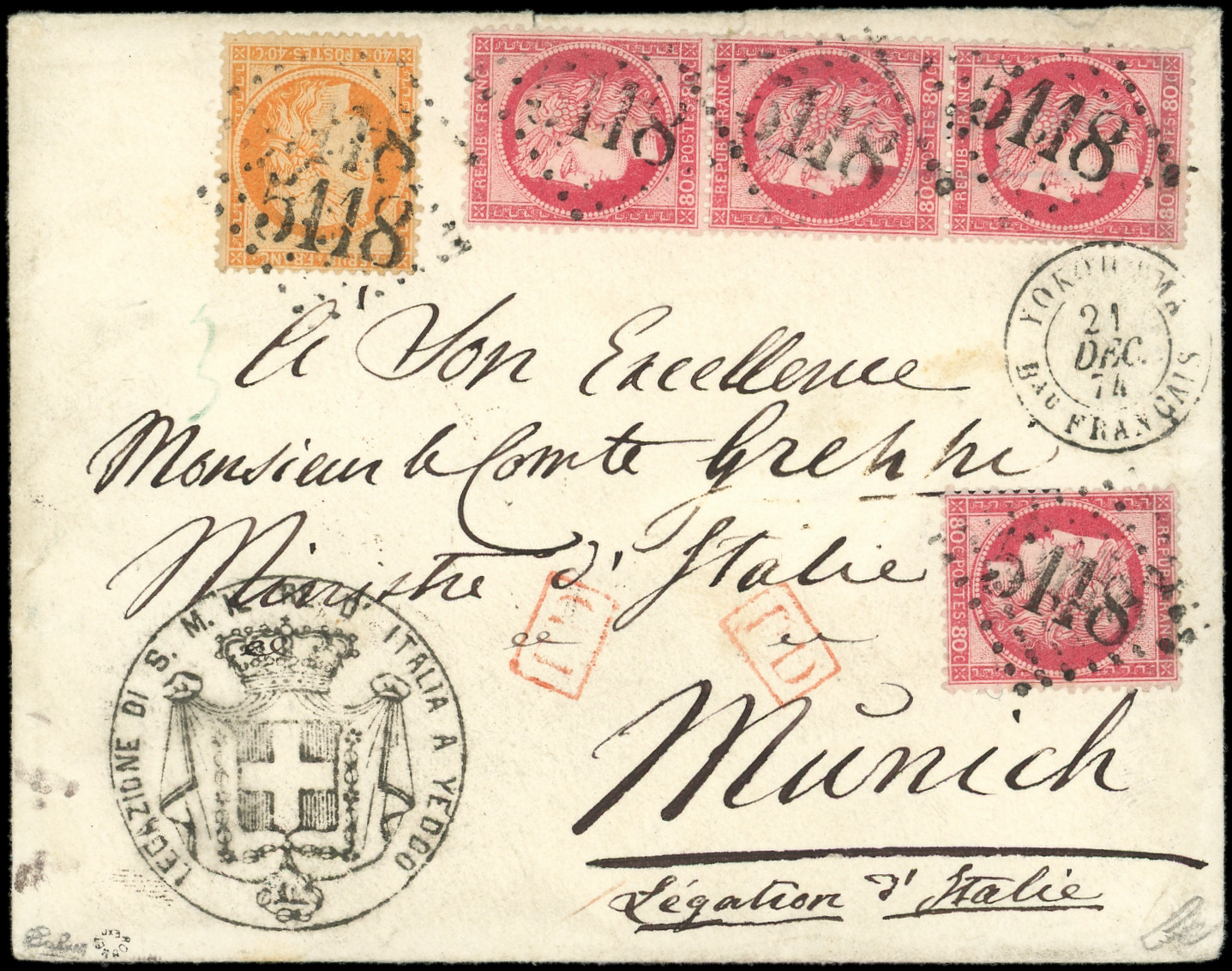 de 3 + 1 ex. obl. GC 5118 s. Env. avec grand cachet LEGAZIONE D'ITALIA A YEDDO et armoiries, pour la Légation d'Italie à MUNICH, arr. 6/2, Superbe. C (Image) (Image2)