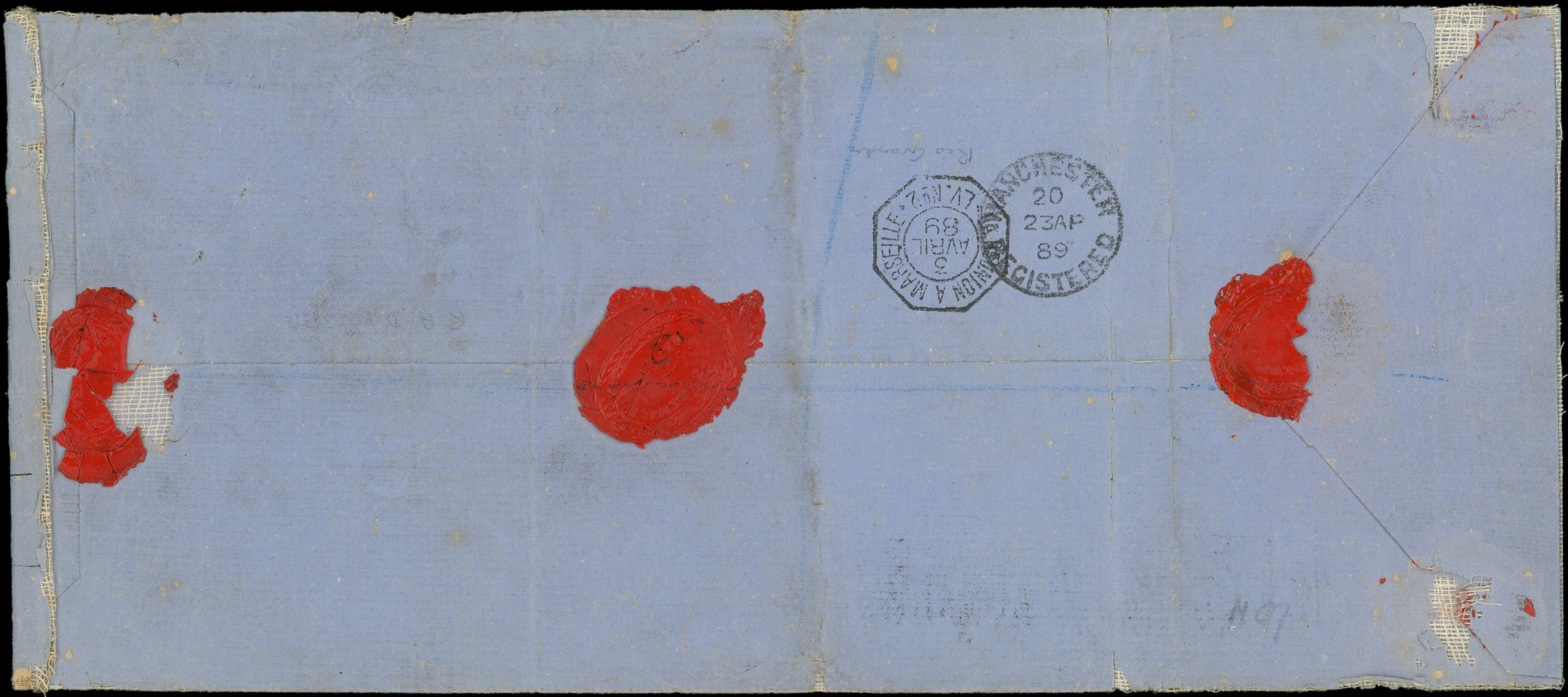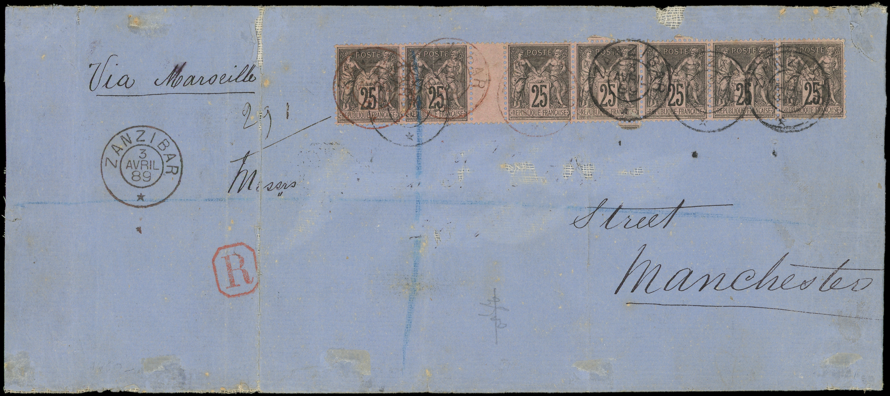 interp. obl. càd ZANZIBAR 3/4/89 s. Env. Rec., au verso càd Octog. LA REUNION A MARSEILLE LV. N°2 5/4/89, arr. MANCHESTER 23/4, R et TB (Image) (Image2)