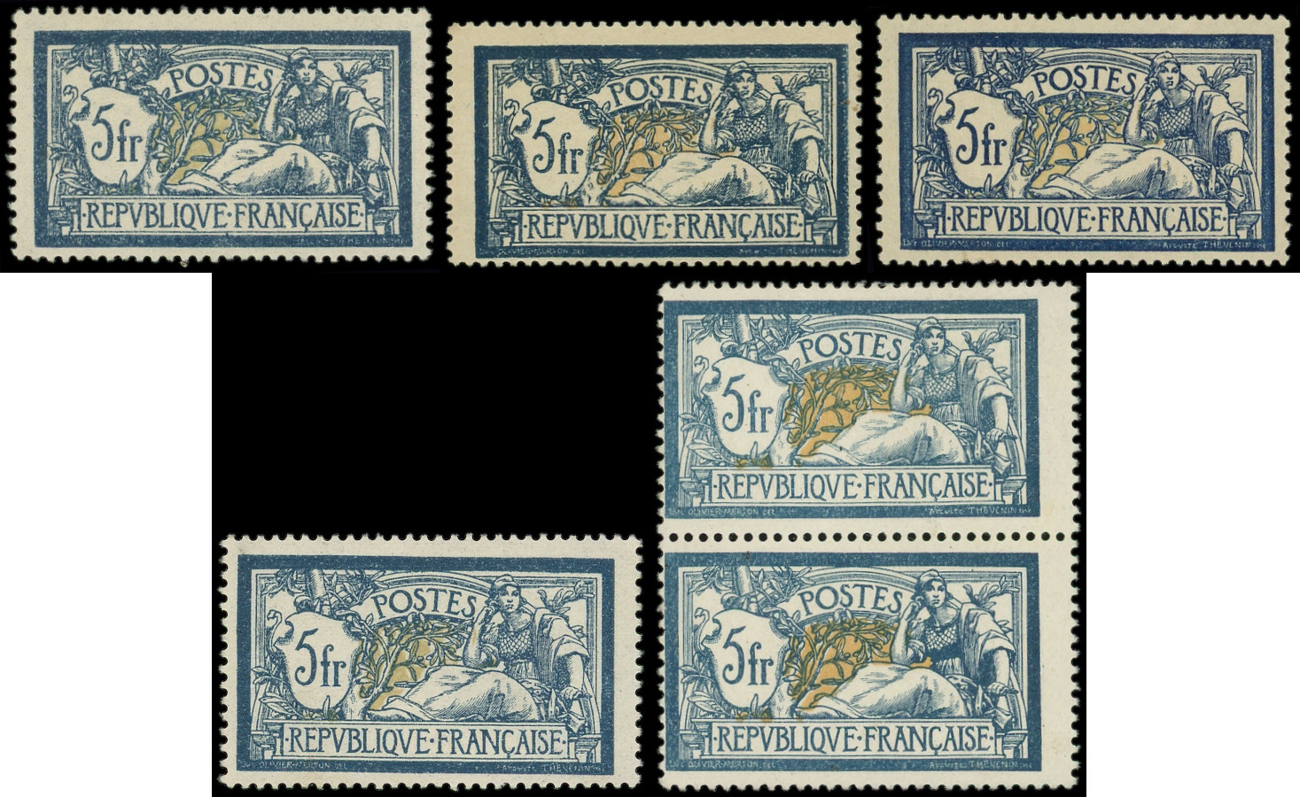 5f. bleu et chamois, 4 unités (3 nuances) et une paire décentrée, TB (Image)