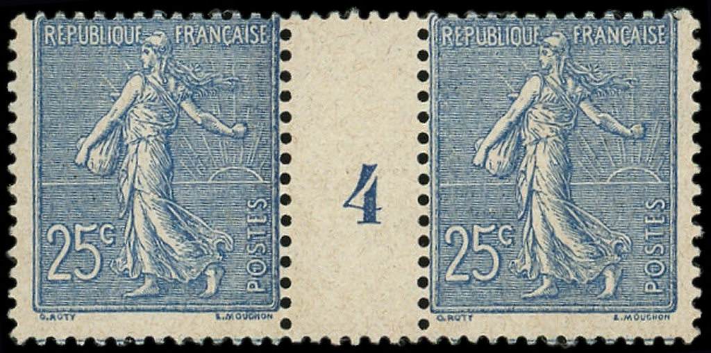 Lignée, 25c. bleu, PAIRE Mill.4, décentrée, TB (Image)