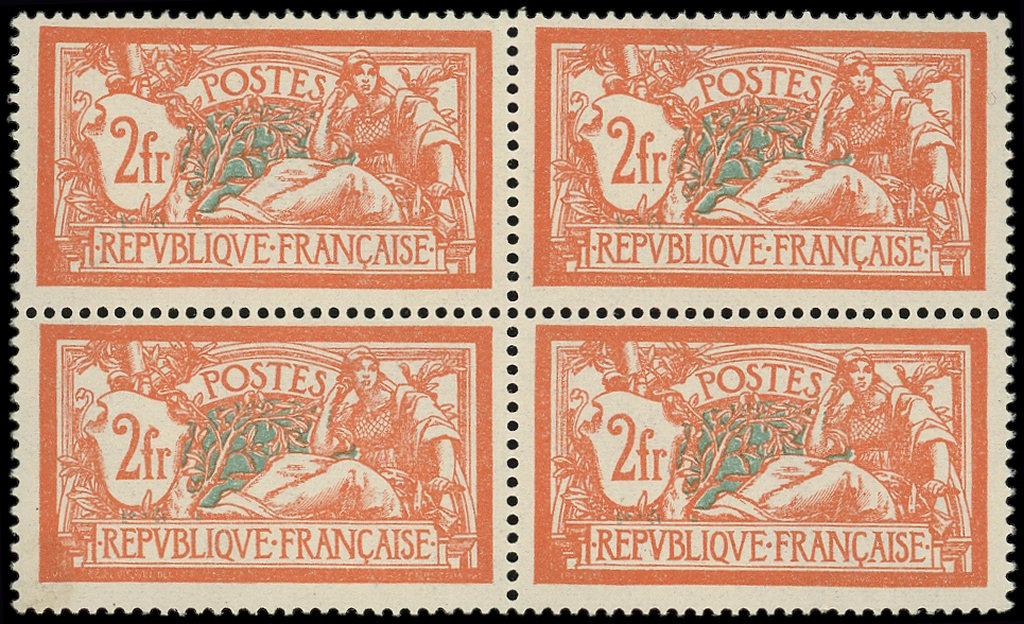 2f. orange et vert-bleu, nuance pâle, BLOC de 4 cdf, 2 ex. bon centrage, TB (Image)