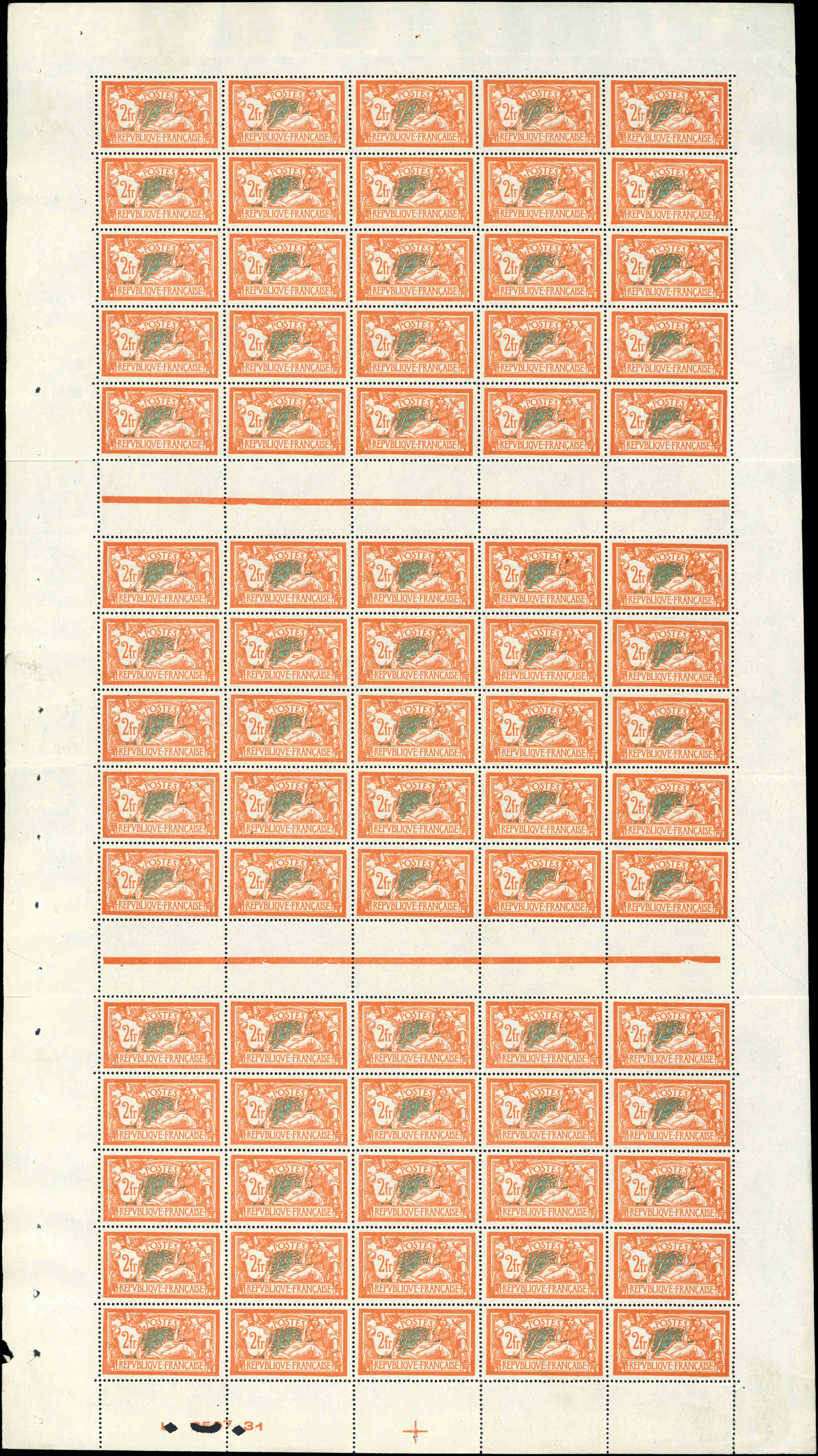 2f. orange et vert-bleu, FEUILLE de 75, très bon centrage d'ensemble, TB (Image)