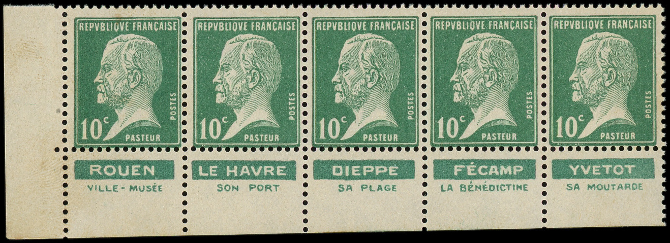 10c. vert, BANDE de 5 provenant de carnet avec pubs, Villes de Normandie, TB, cote Maury (Image)