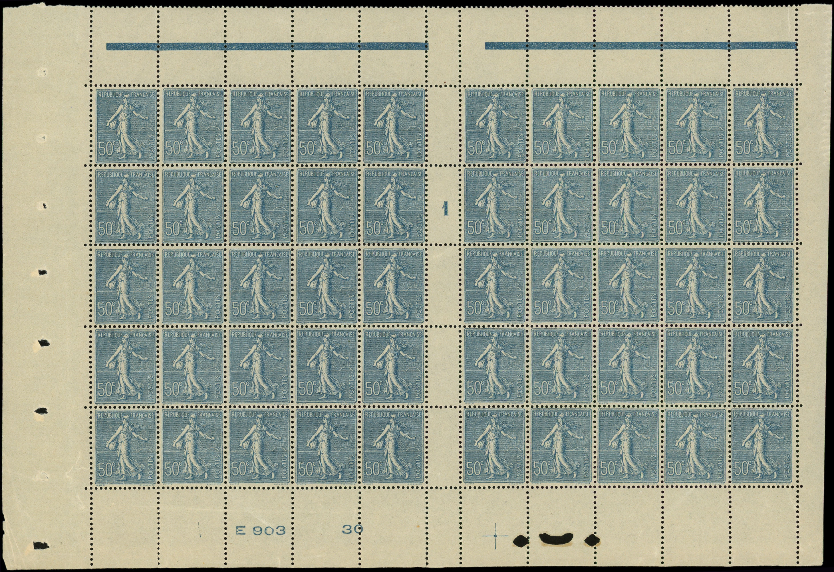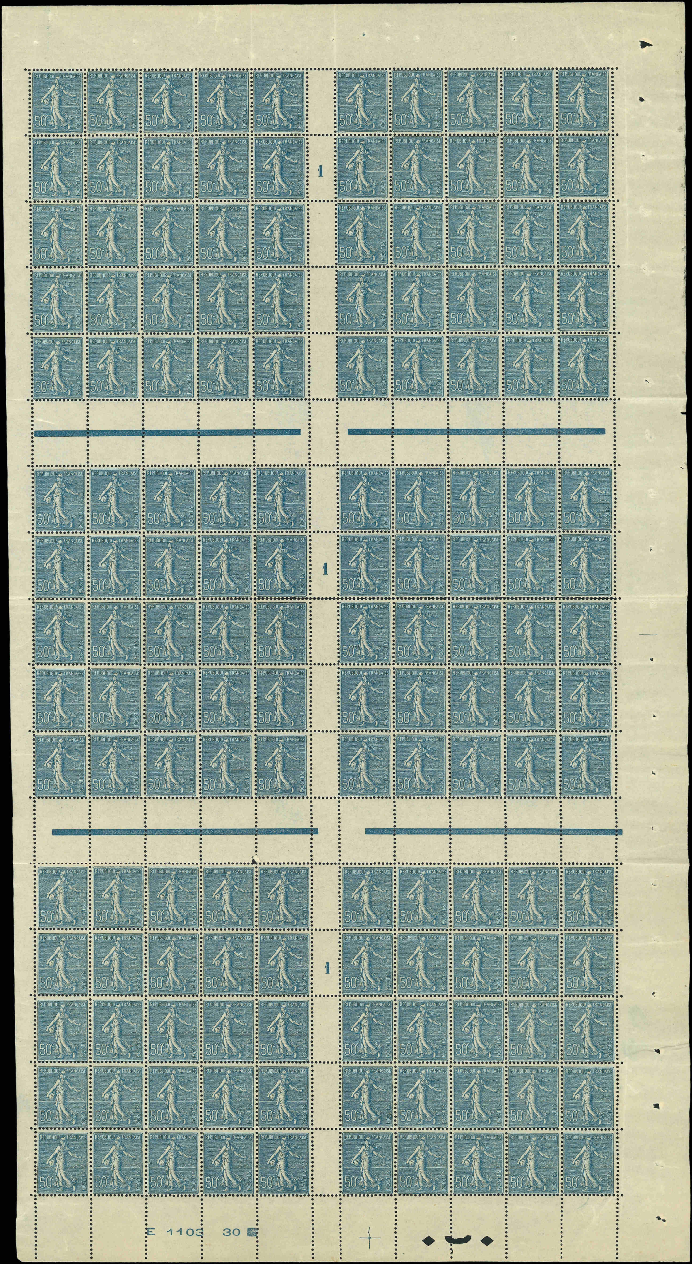 Lignée, 50c. bleu, T I, PANNEAU de 50 Millés. 1 bas de feuille, très bon centrage d'ensemble, TTB (Image)