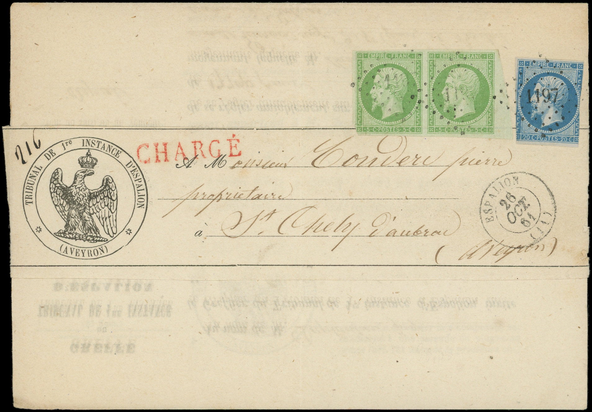 PAIRE et 20c. obl. PC 1197 s. Convocation CHARGE du Greffe, càd T15 ESPALION 26/10/61, tarif 10c. local + 20c., Superbe (Image)