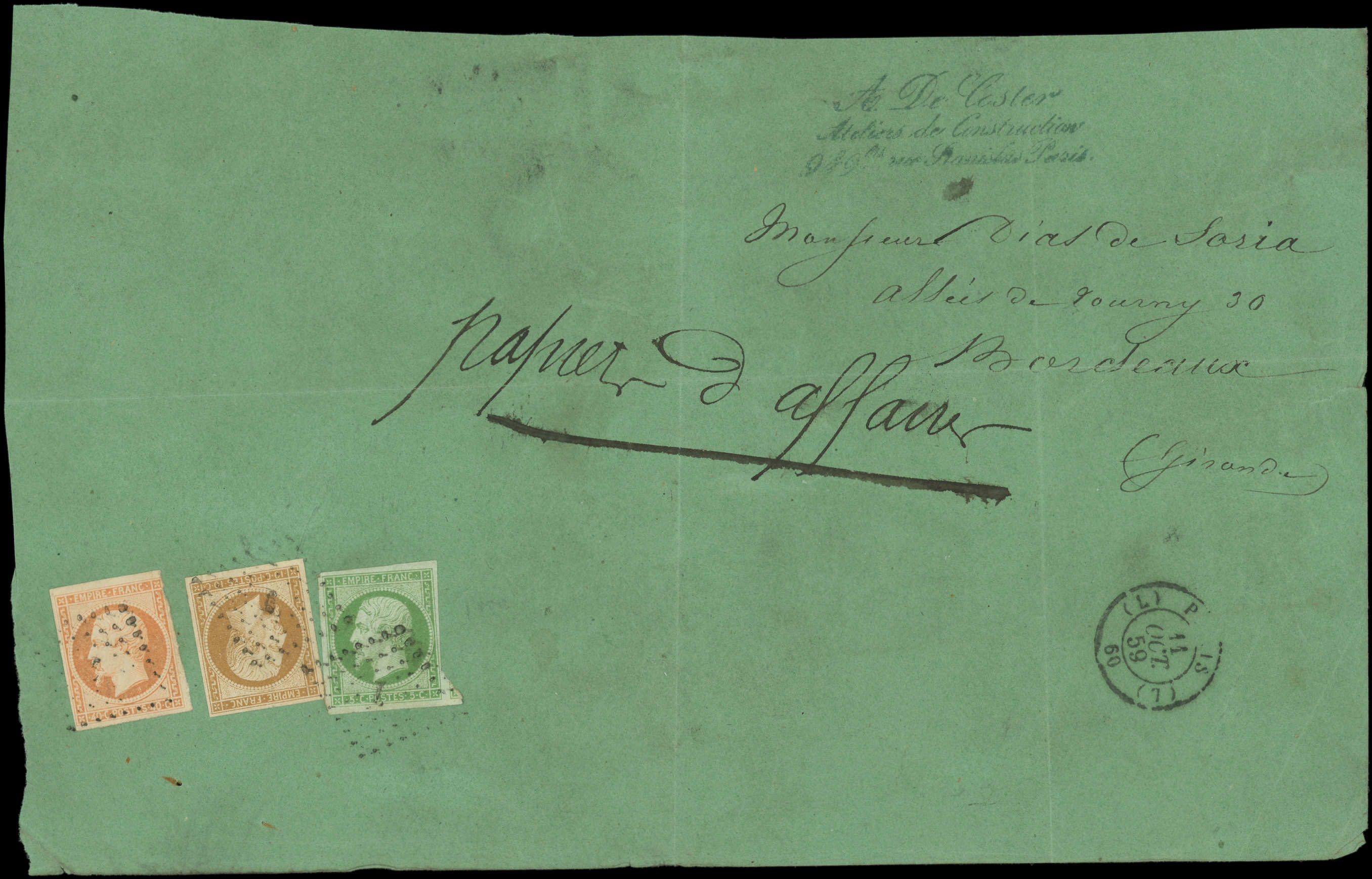 5c., 10c. et 40c. p.d. obl. Los. L du bureau suppl. de Paris s. papiers d'affaires, càd (L) PARIS (L) 11/10/59, poids 550g., TB (Image)