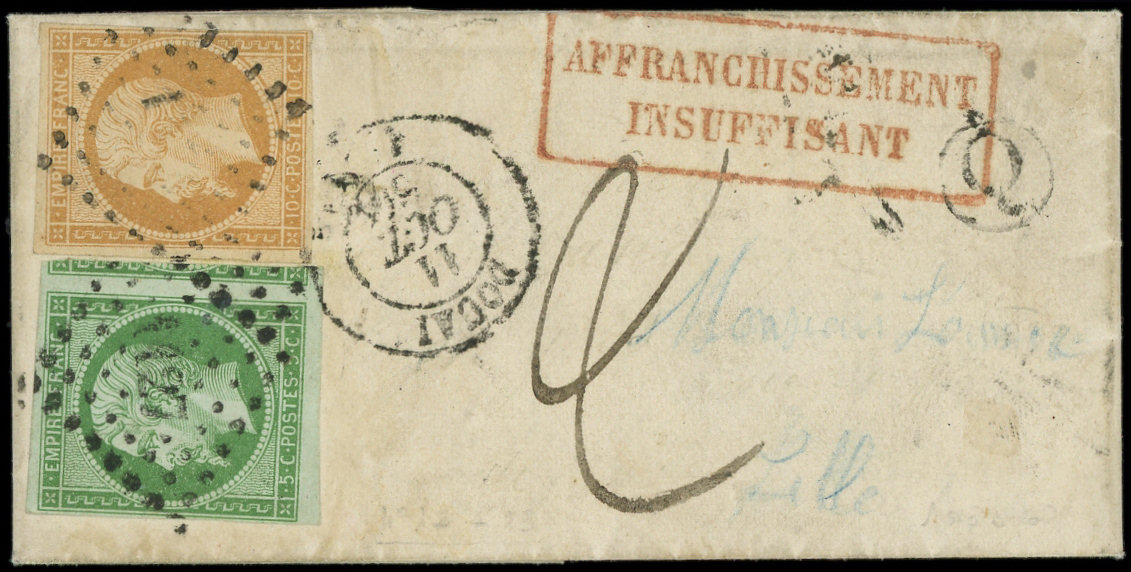 10c. obl. PC 1127 s. LAC de GOEULZIN Boite Q, récupérée par le facteur pendant sa tournée, obl. à Douai 11/10/60 et TAXEE à 2 pour le trajet Douai-Lille, TTB (Image)